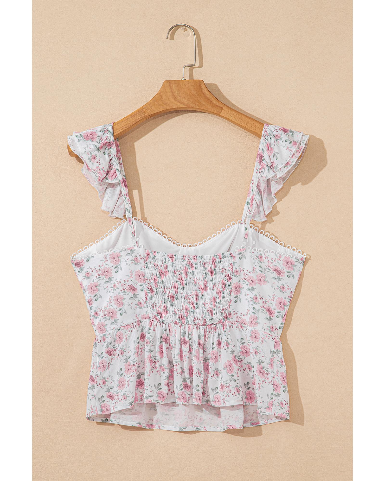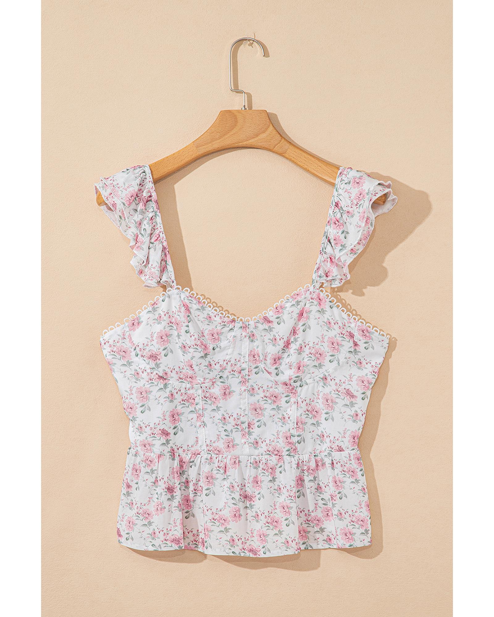 This pink floral flutter peplum tank top offers a feminine and stylish look with its delicate floral print and flattering design. Made from lightweight fabric, it provides comfort for all-day wear and is suitable for a variety of occasions.