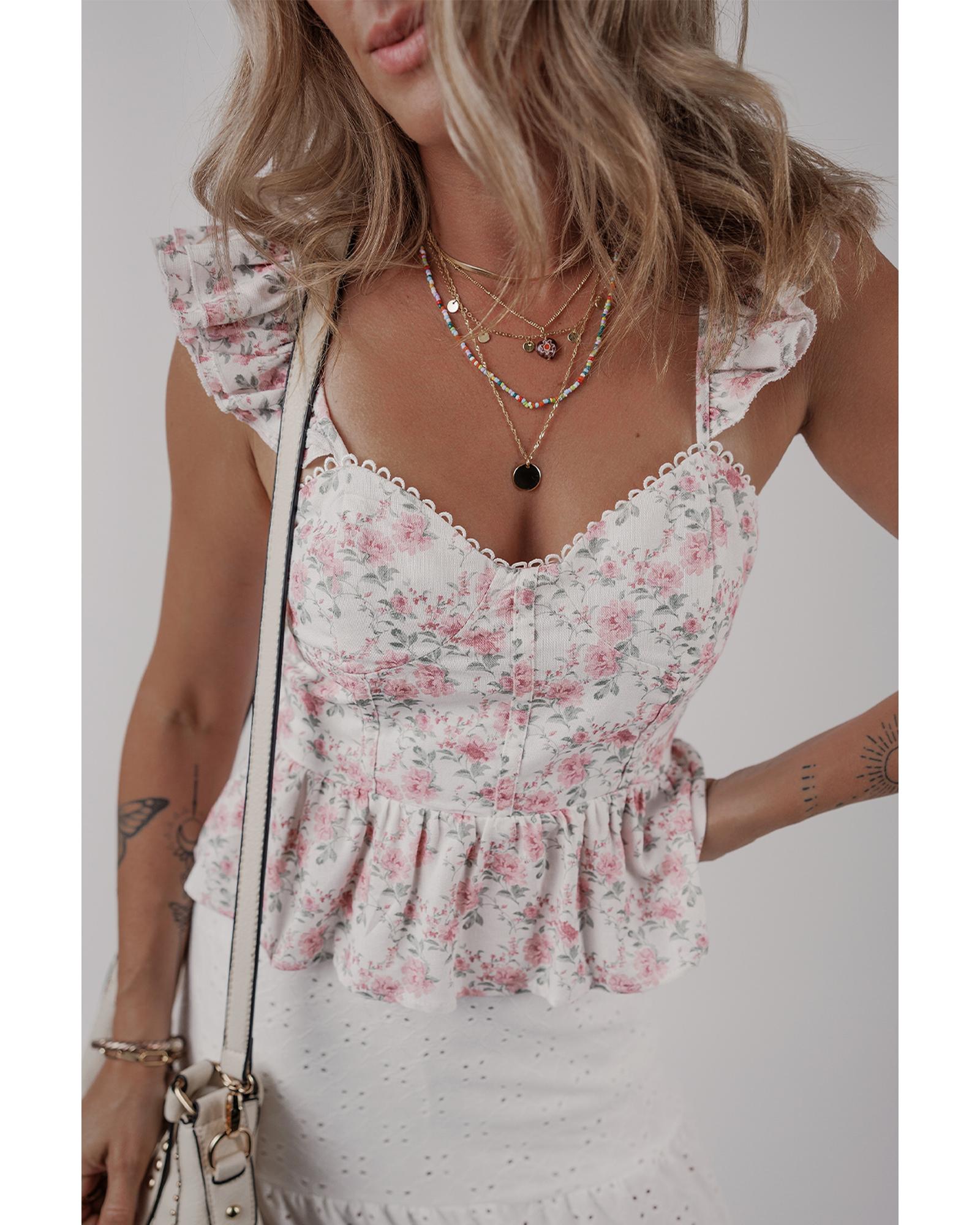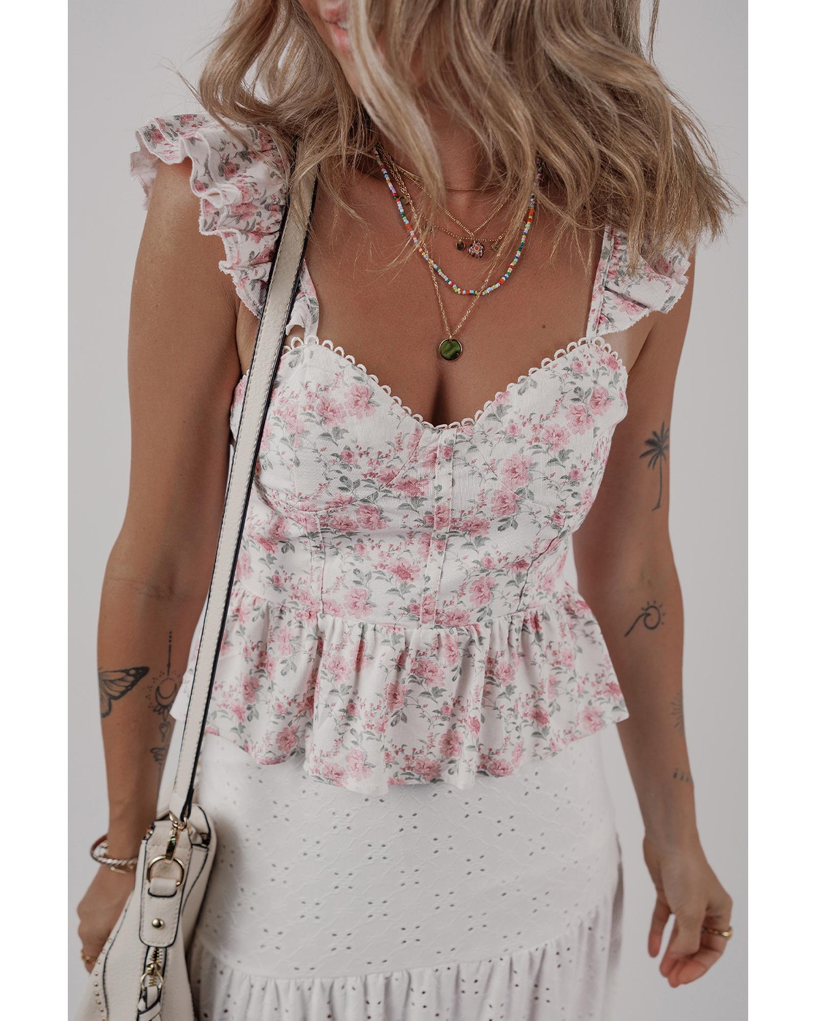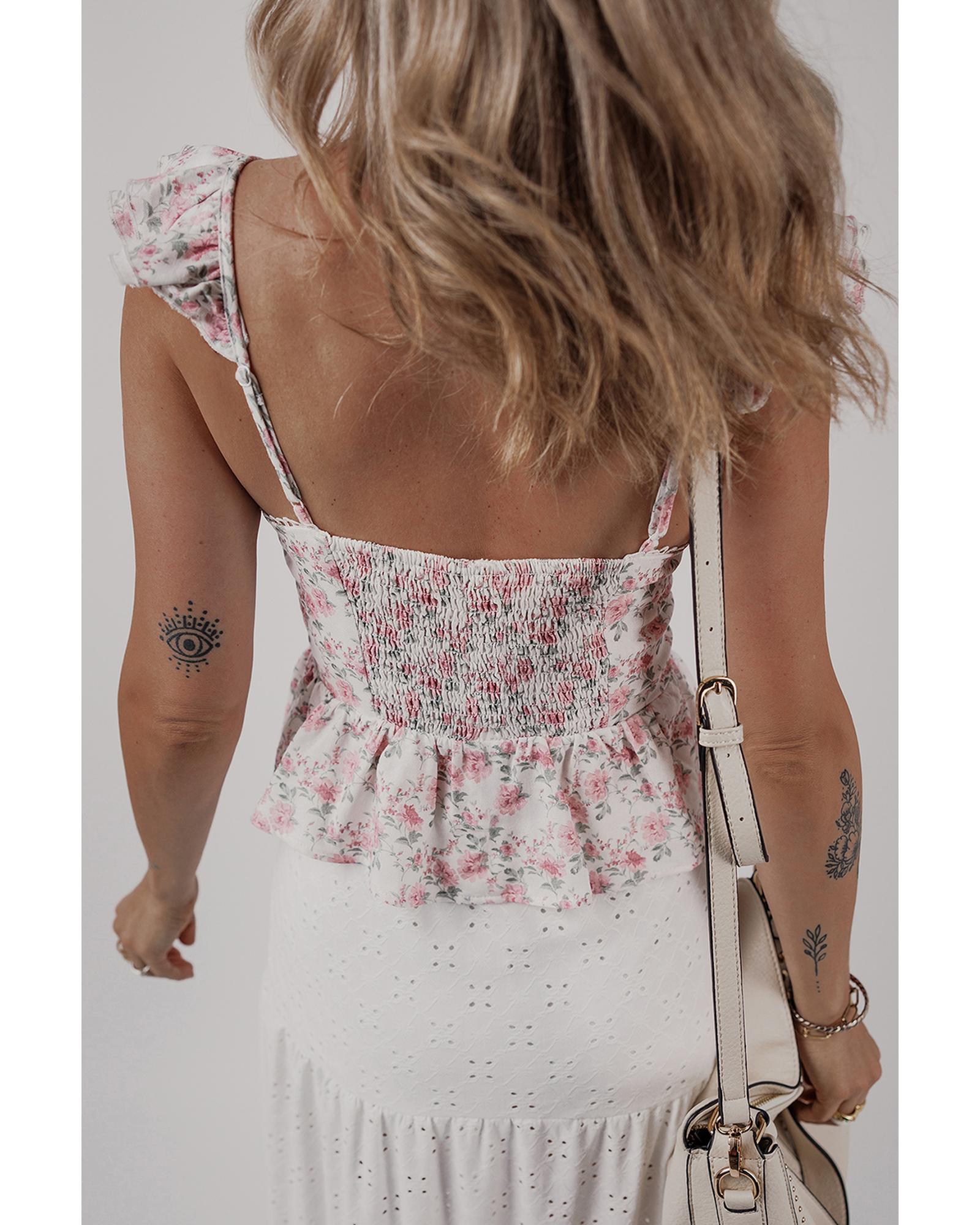 This floral flutter peplum tank top offers a feminine and stylish look with its delicate floral print and flattering design. Made from lightweight fabric, it provides comfort for all-day wear. Its versatile style makes it suitable for various occasions.