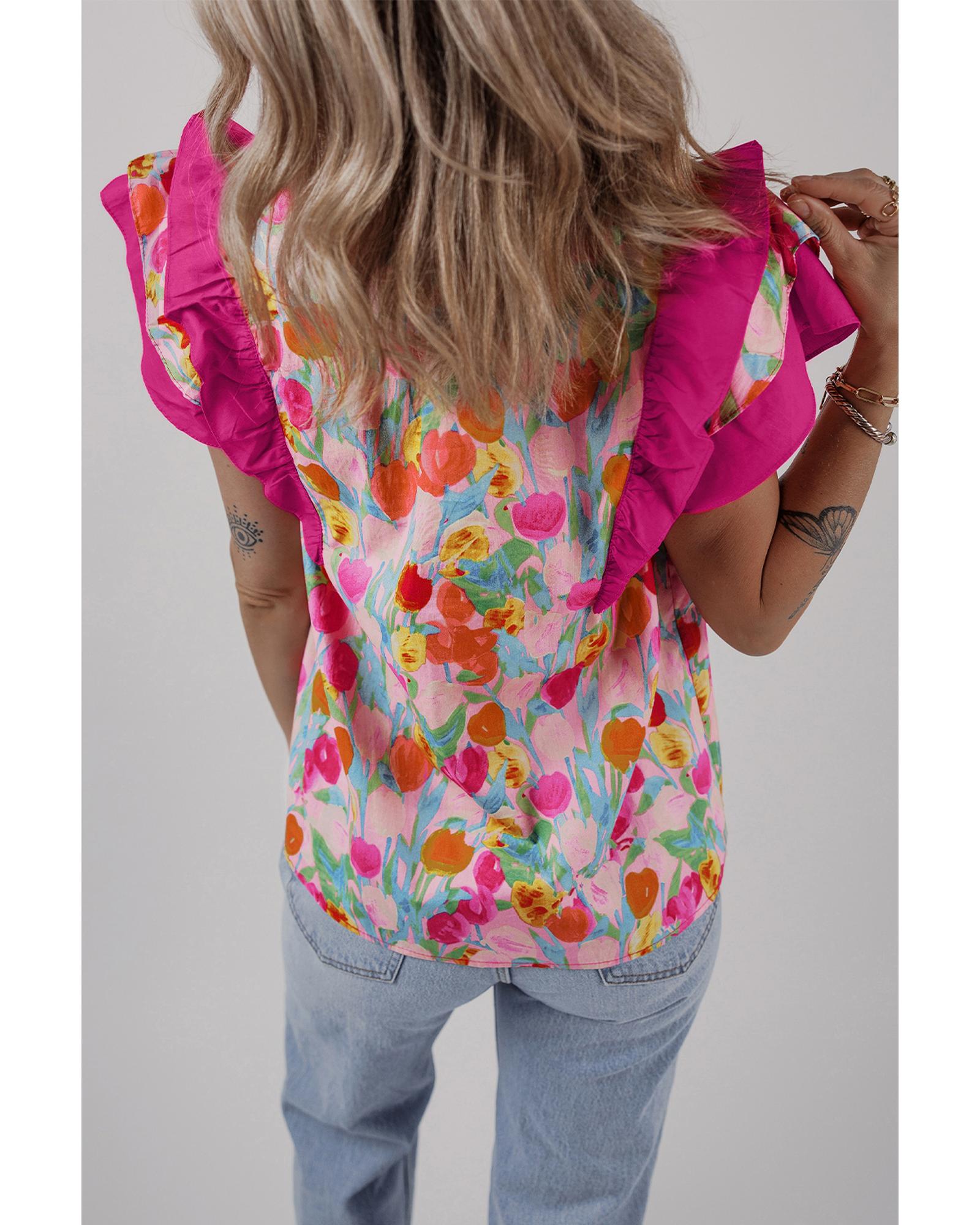 This floral blouse features a layered ruffle design on flutter sleeves and a tie V-neck, offering a feminine and stylish look. Its versatile style makes it suitable for pairing with jeans or skirts, perfect for springtime or casual occasions.