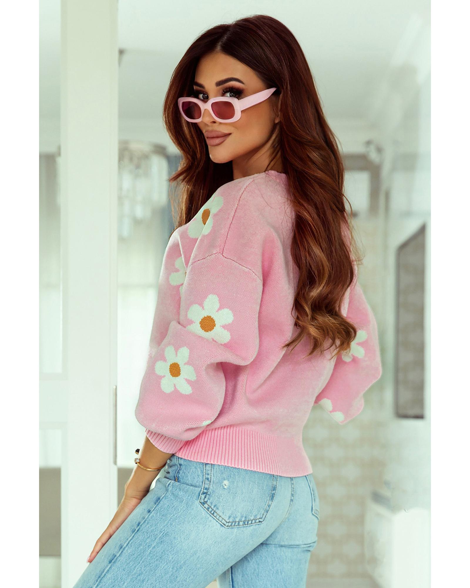 Pink Floral Pattern Drop Shoulder Sweater – L