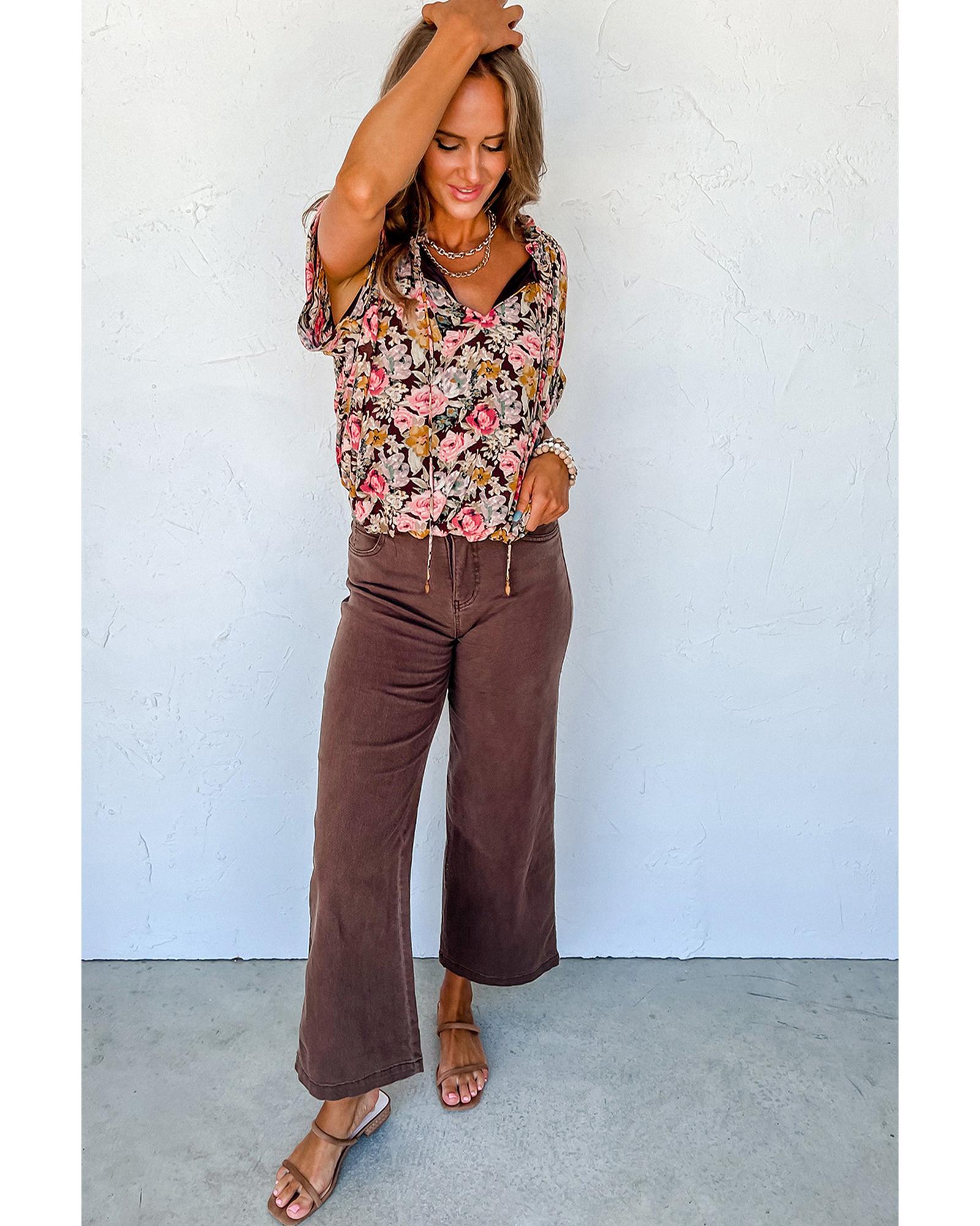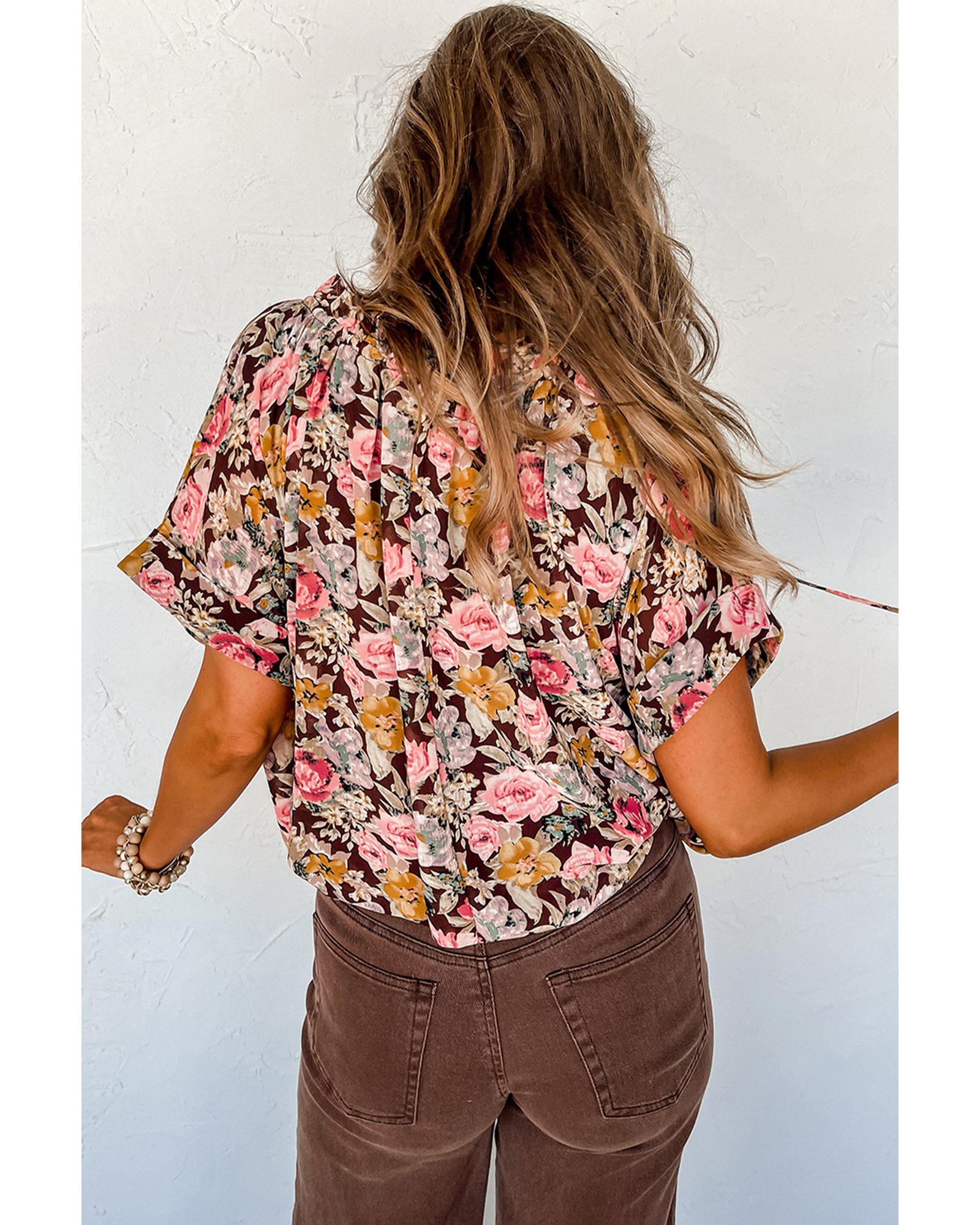 This blouse features a charming pink floral print with a bubble hem and split neck design, offering a stylish and versatile look. It is designed with a loose fit and cuffed short sleeves, making it suitable for various occasions and easy to pair with different outfits.
