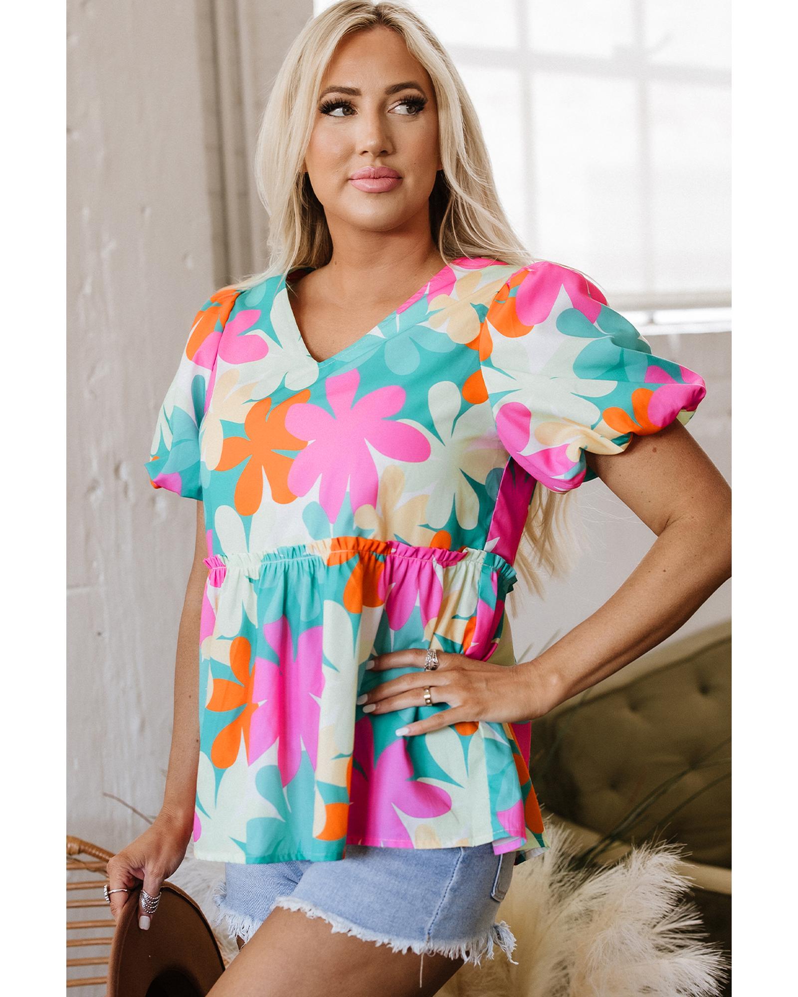 This pink floral print blouse features a stylish bubble sleeve design and a flattering V neckline. The peplum silhouette enhances the waistline, creating a chic and elegant look suitable for various occasions.