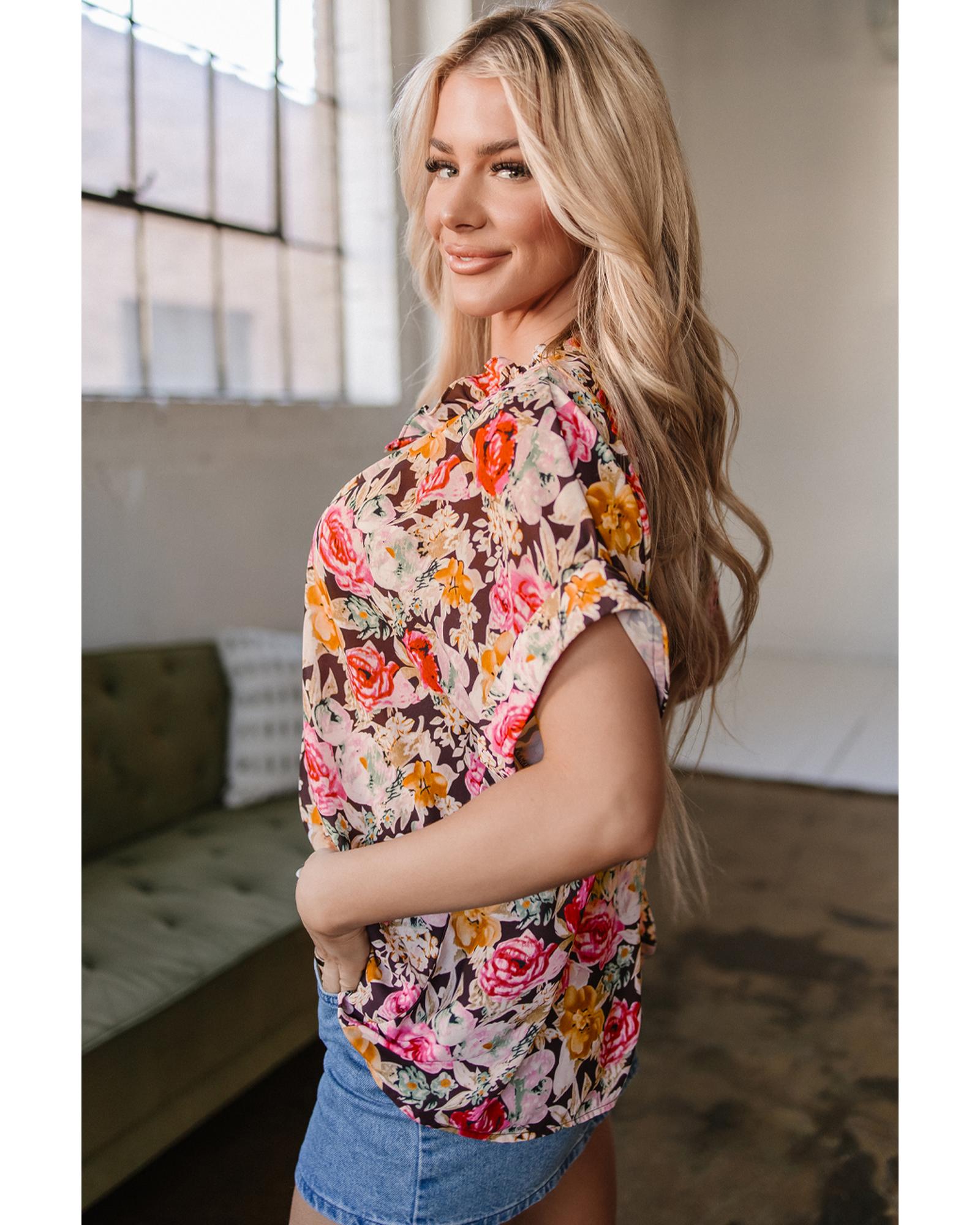 This pink floral print blouse features a classic crew neck and short sleeves, offering a comfortable and stylish fit. Its loose design makes it suitable for various casual and semi-formal occasions, providing both comfort and elegance.