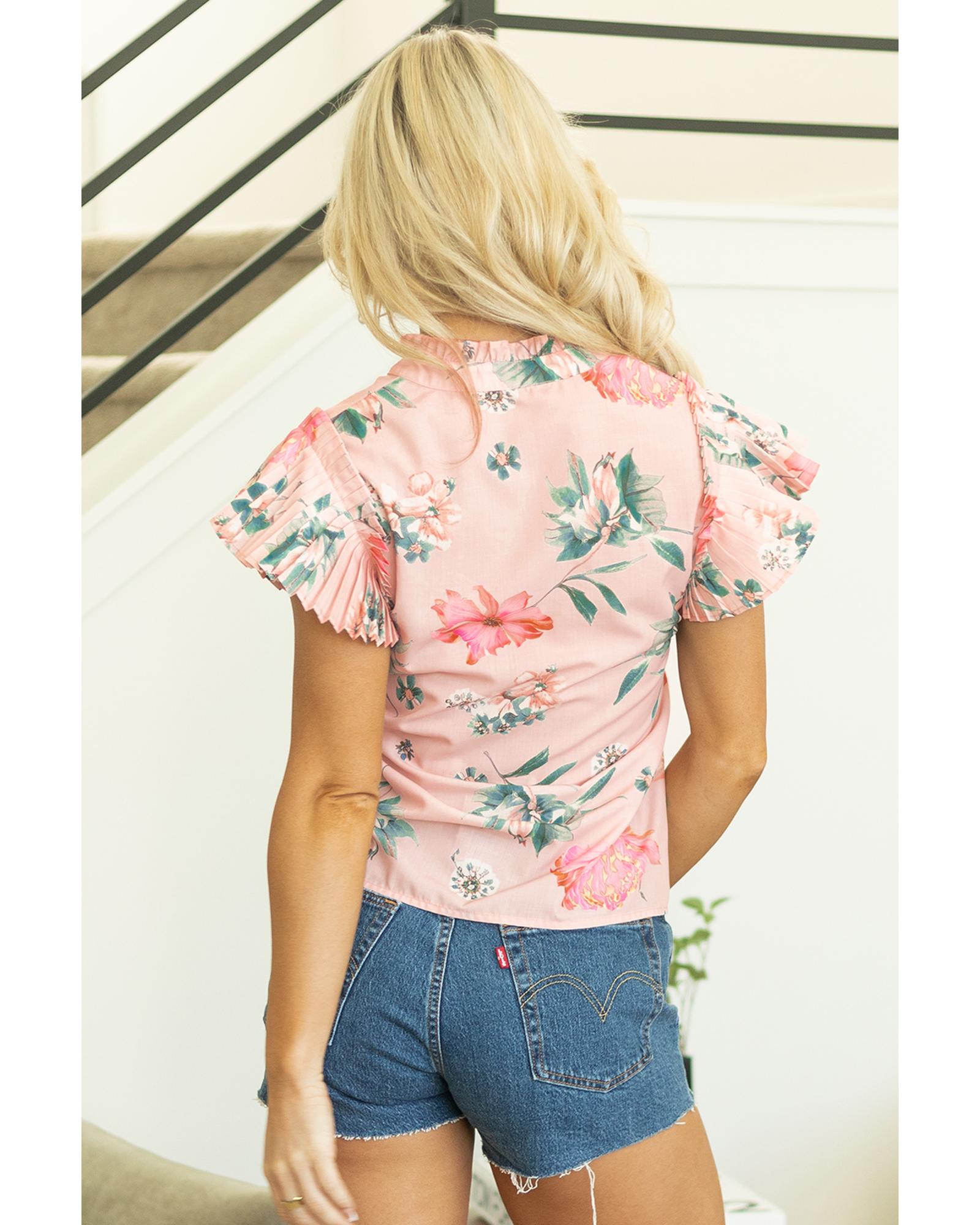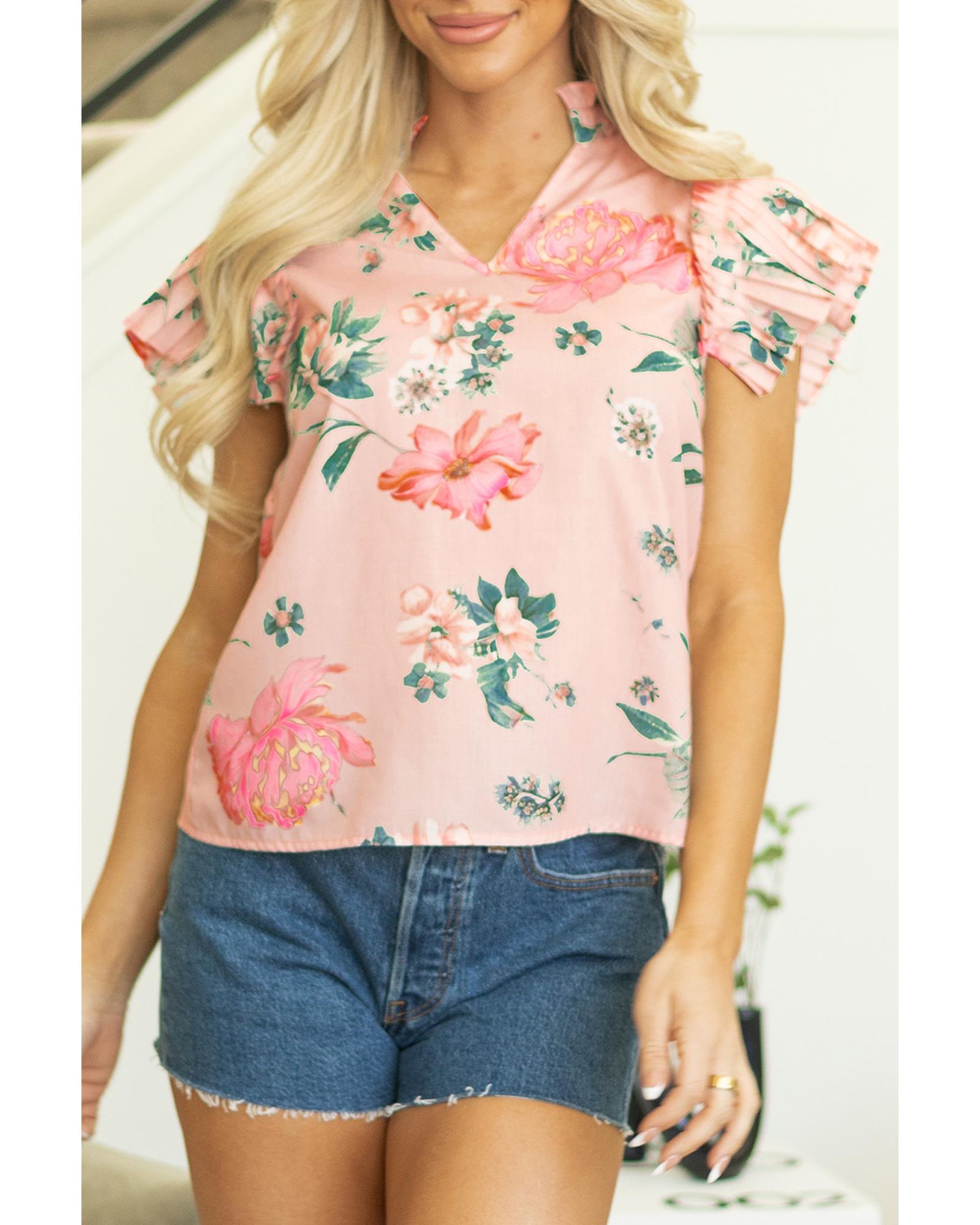 This blouse features a charming pink floral print with a feminine design. It is designed with a frilled V neckline and pleated sleeves, making it a stylish addition to any wardrobe. Available in multiple sizes to fit various body types, it offers a comfortable and elegant look for different occasions.