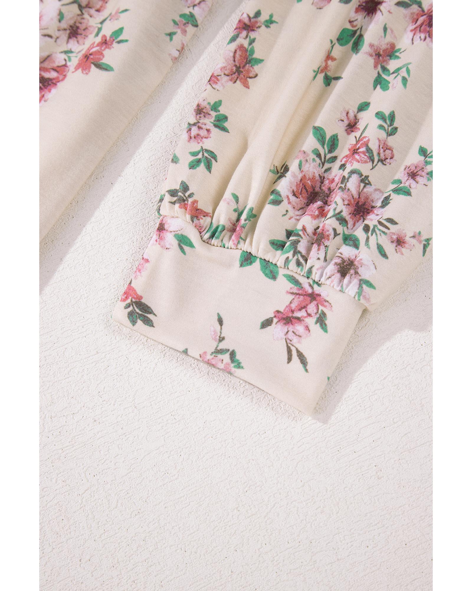 Pink Floral Print Pleated U Neck Loose Fit Blouse – L