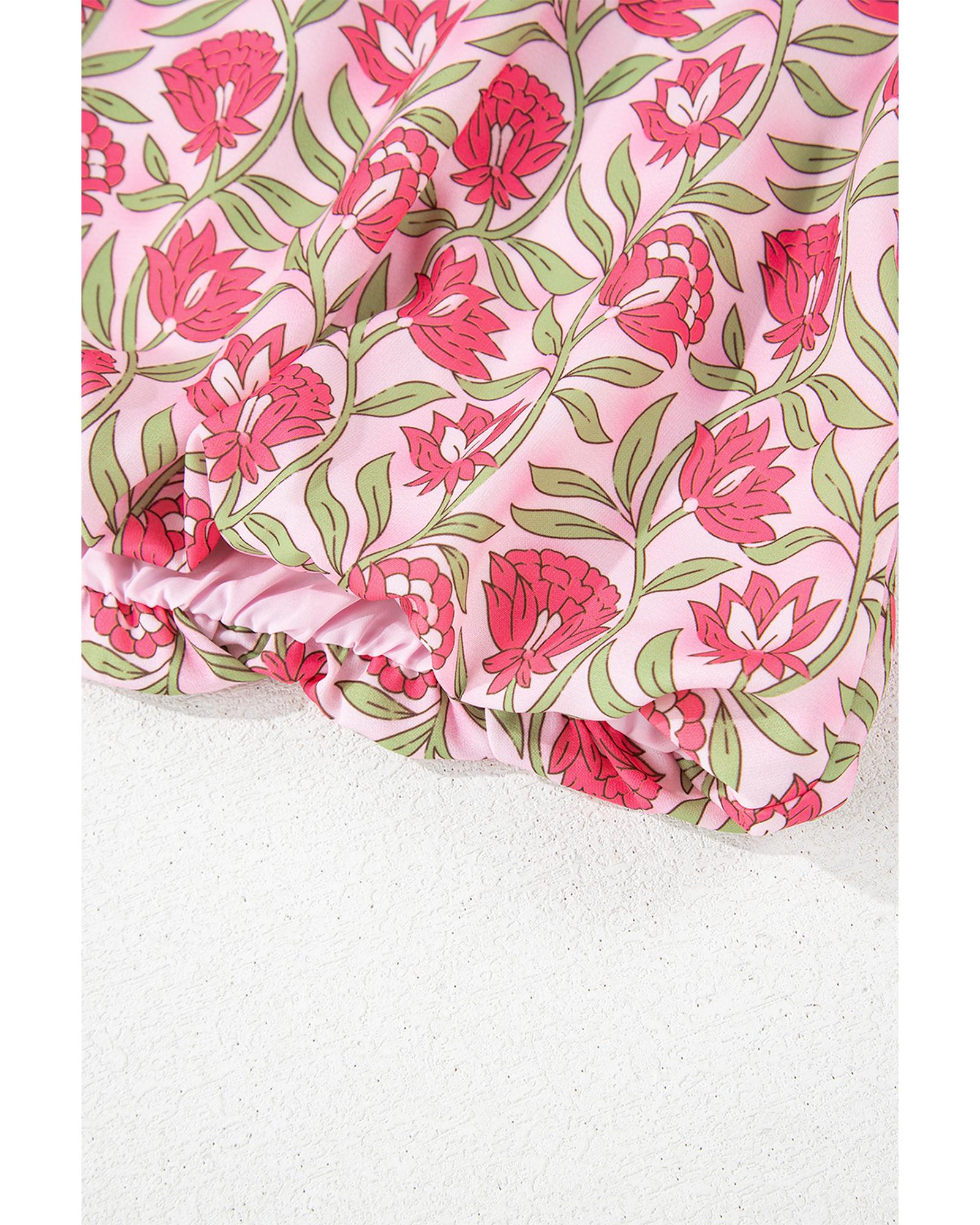 This stylish pink floral print set includes a cropped tank top and a matching mini skirt, perfect for a chic and feminine look. The outfit features a trendy puffy hem on the tank top and an elegantly flared skirt, making it suitable for various casual occasions.