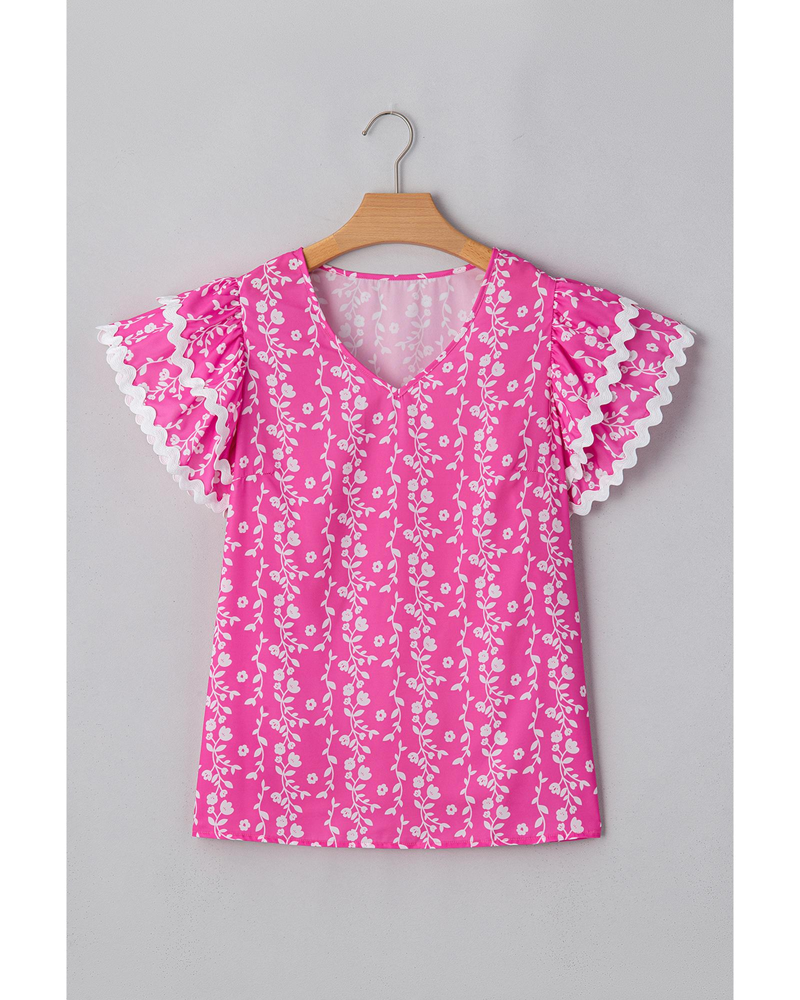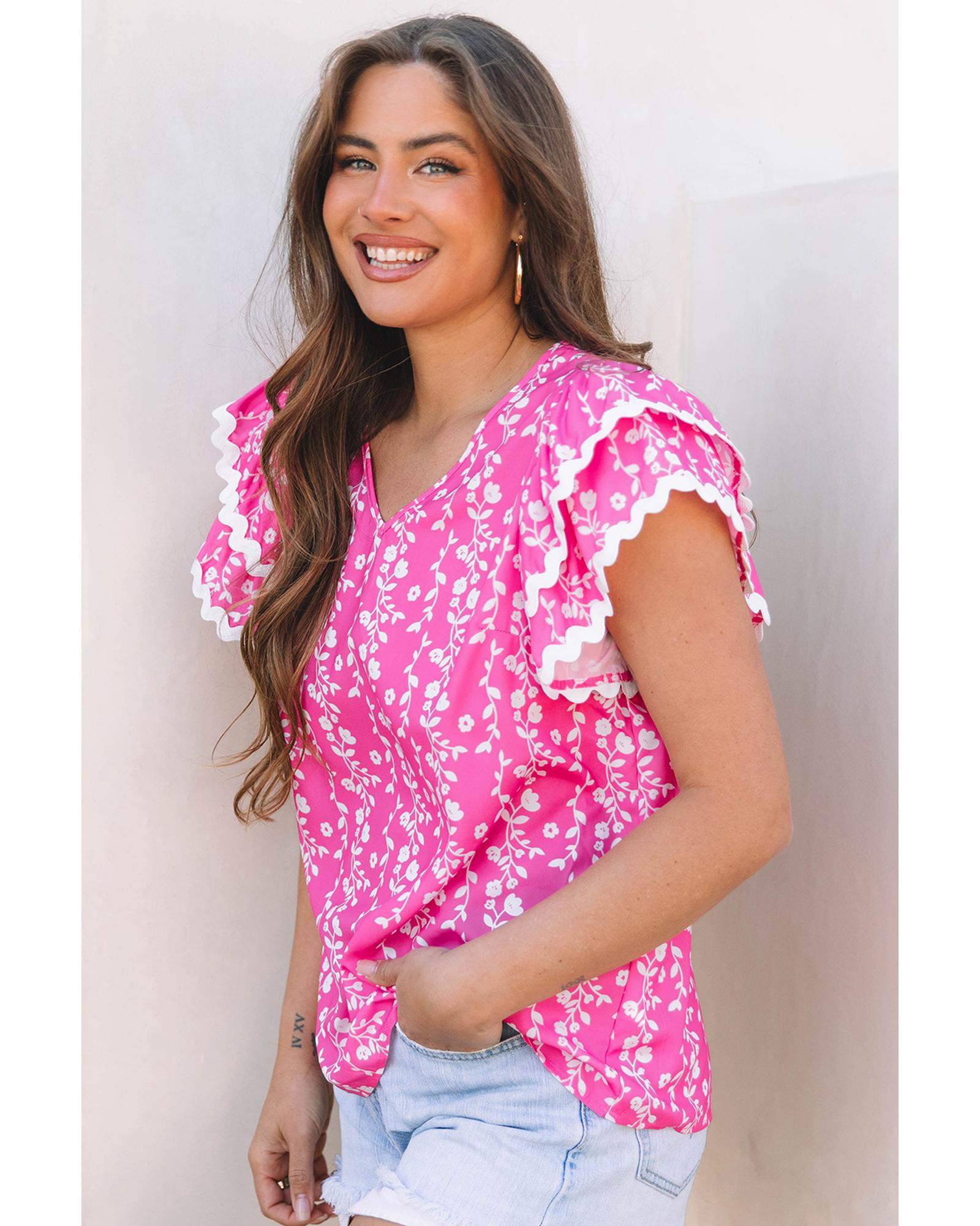 This floral print blouse features a feminine V-neck design and tiered ruffled sleeves, adding a charming and stylish touch to your wardrobe. The delicate ric-rac trim enhances its unique detail, making it suitable for various occasions.