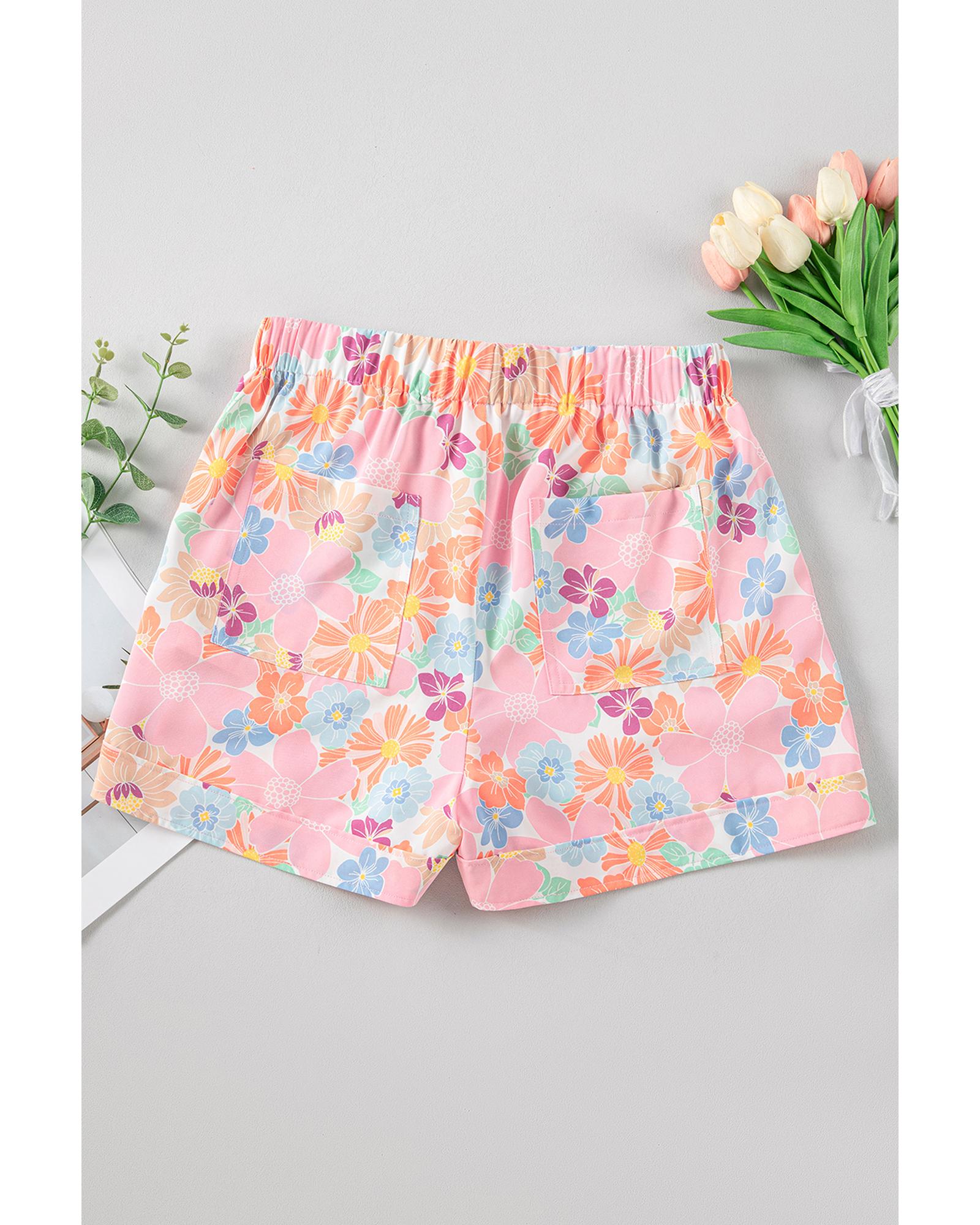 This pair of casual shorts features a charming pink floral print with side pockets and a comfortable drawstring waist. Designed for a relaxed fit, these shorts are made from high-quality fabric, offering both style and comfort for everyday wear.