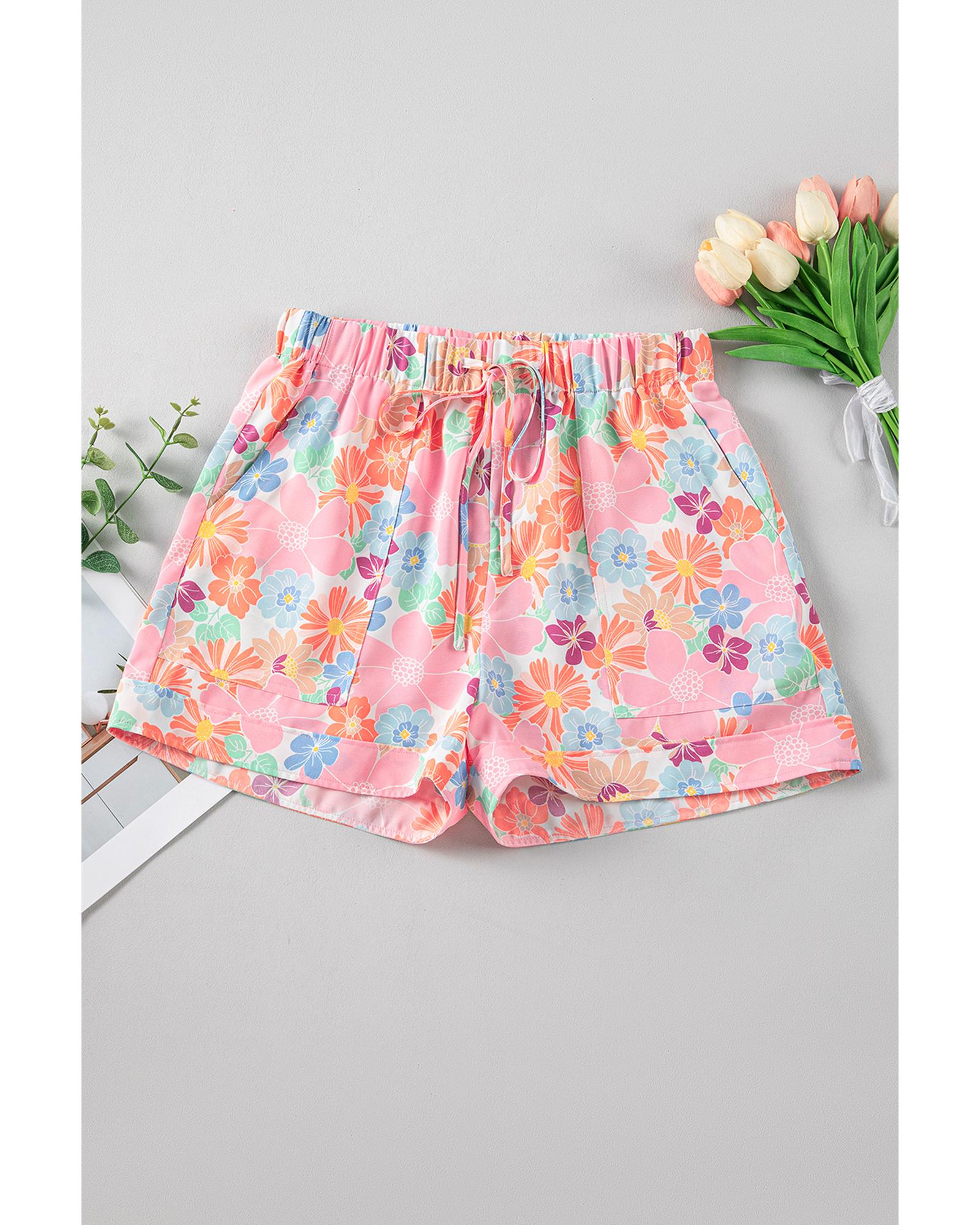 Pink Floral Print Side Pockets Drawstring Casual Shorts – M