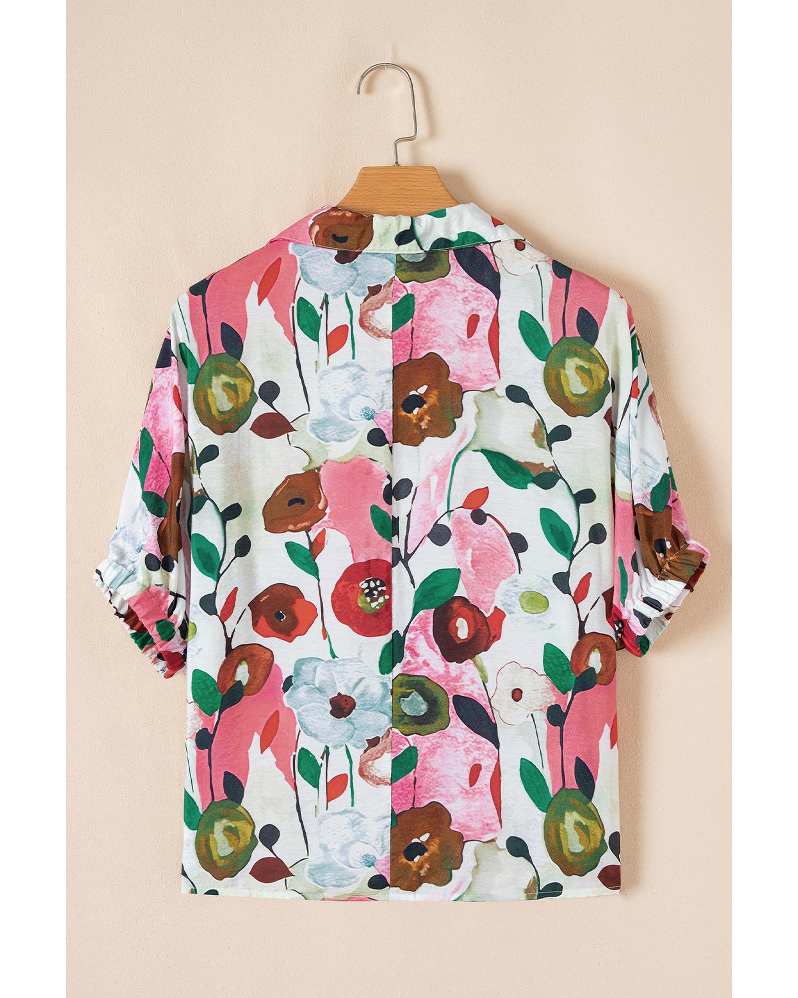 This blouse features a delicate pink floral print and a stylish slit V neckline, making it versatile for both casual and dressy occasions. The short puff sleeves with elastic cuffs add a touch of elegance and comfort, perfect for various settings.