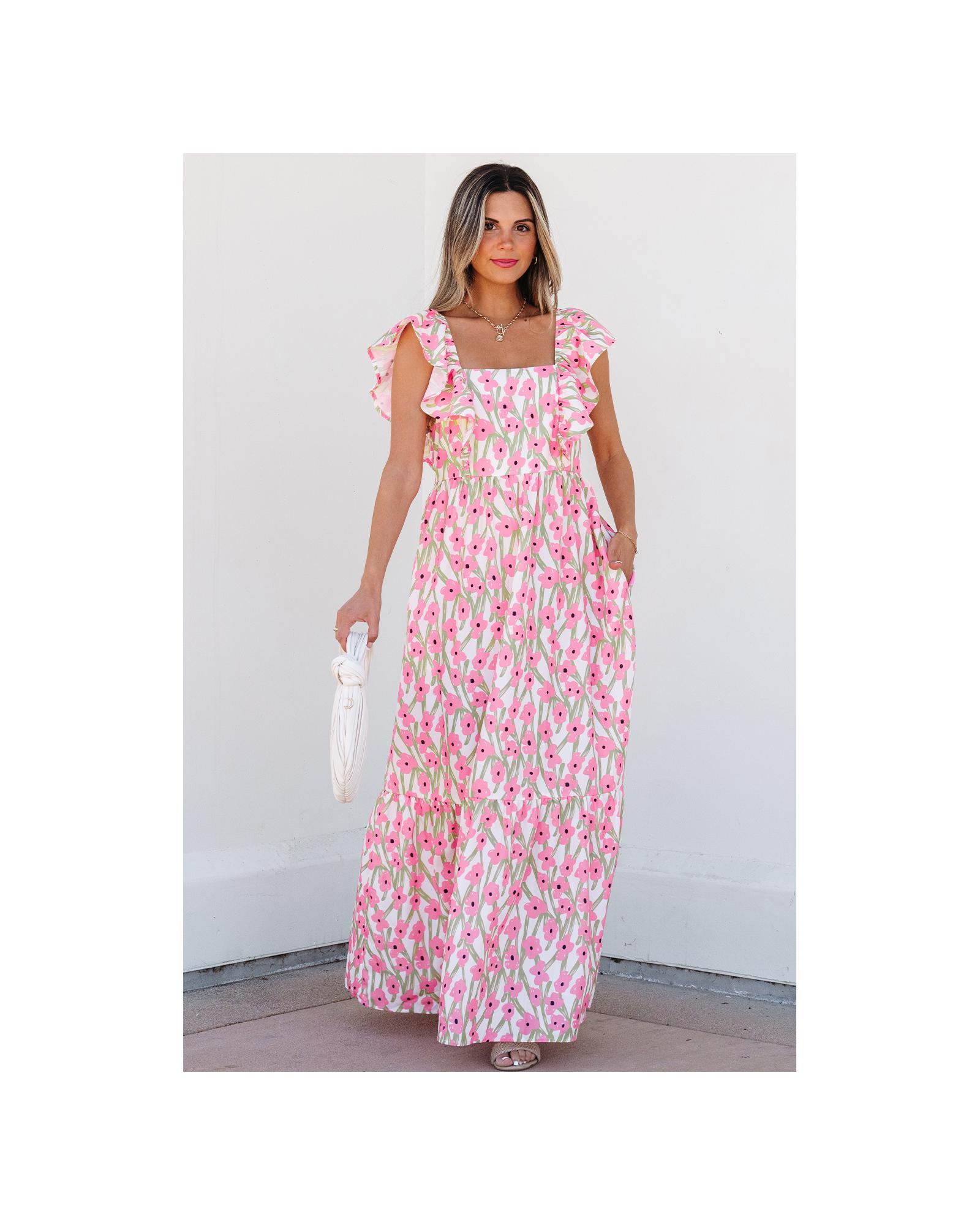 Pink Floral Print Square Neck Ruffled Strap Maxi Dress – 2XL