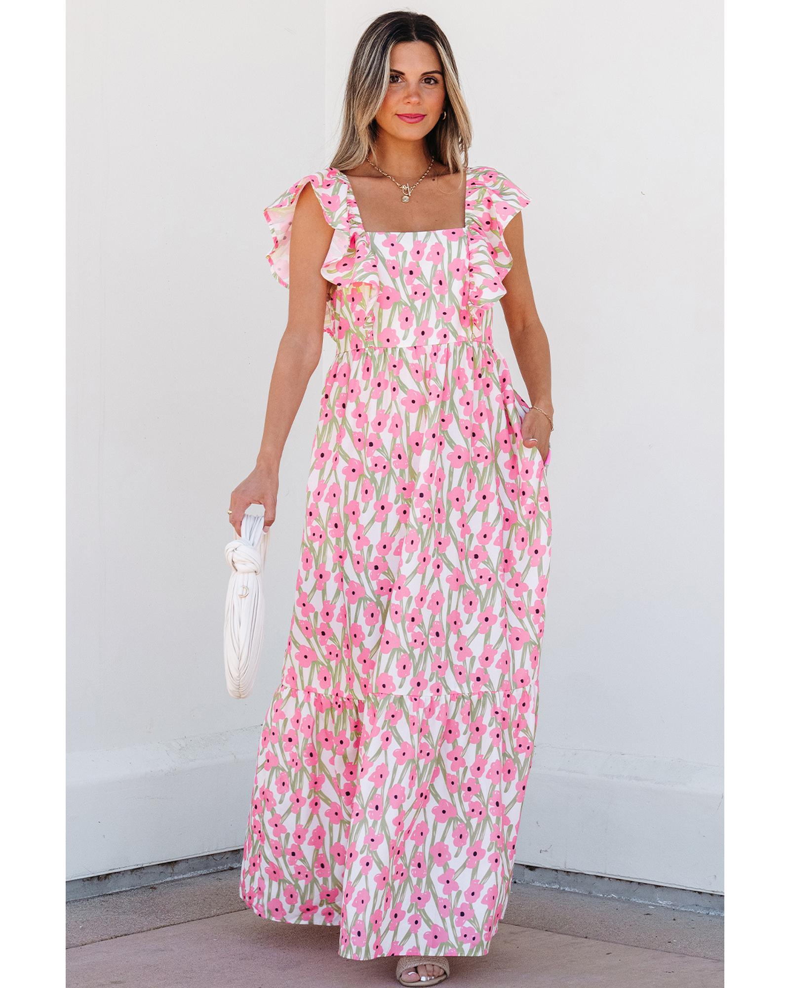 Pink Floral Print Square Neck Ruffled Strap Maxi Dress - 2XL