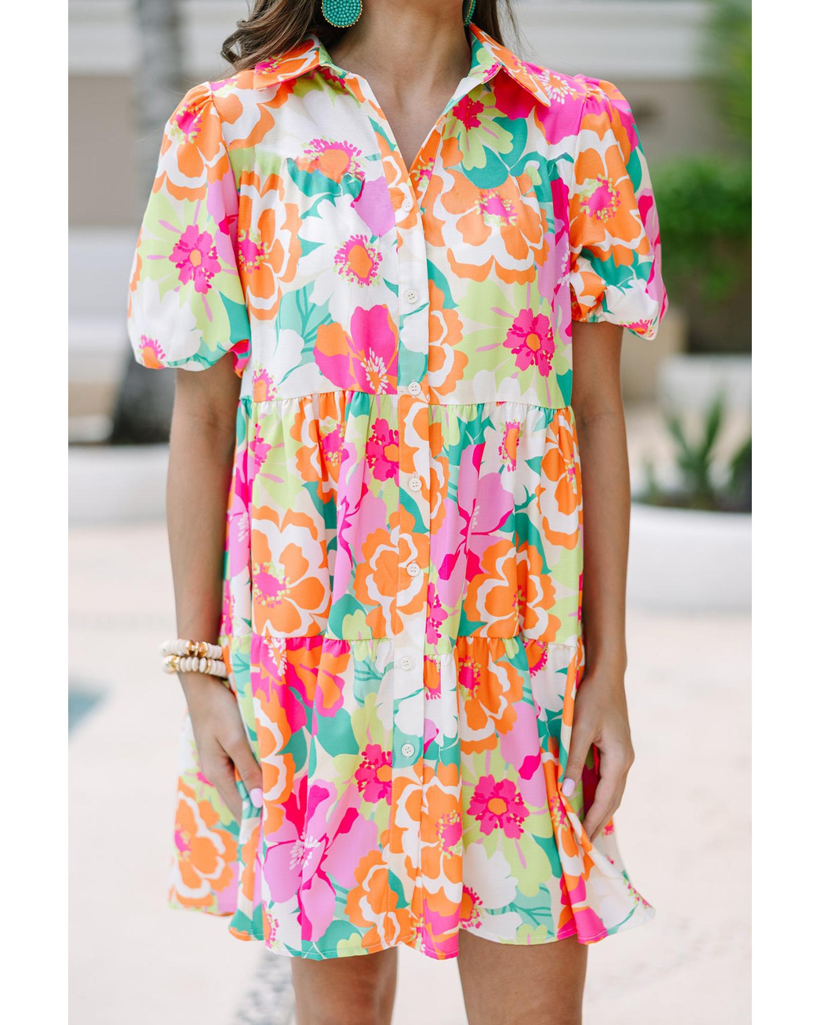 This pink floral babydoll dress features a charming floral print and elegant puff sleeves, making it a versatile choice for various daily occasions. The dress is designed with a collared and buttoned front, offering a sophisticated look that can be styled with sandals, heels, or boots for different occasions.