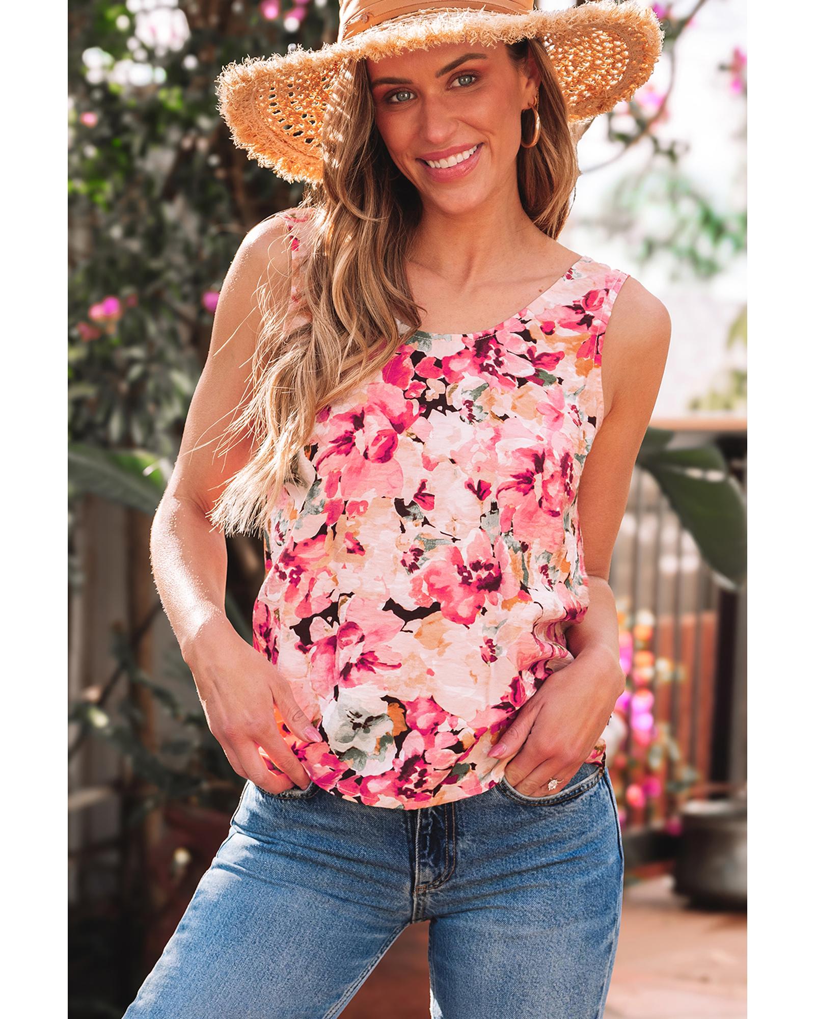 This floral round neck tank top features a stylish twisted cut-out back design, making it suitable for various occasions. The eye-catching floral pattern adds a summery vibe, while the versatile style can be paired with jeans, leggings, or shorts for a fashionable look.