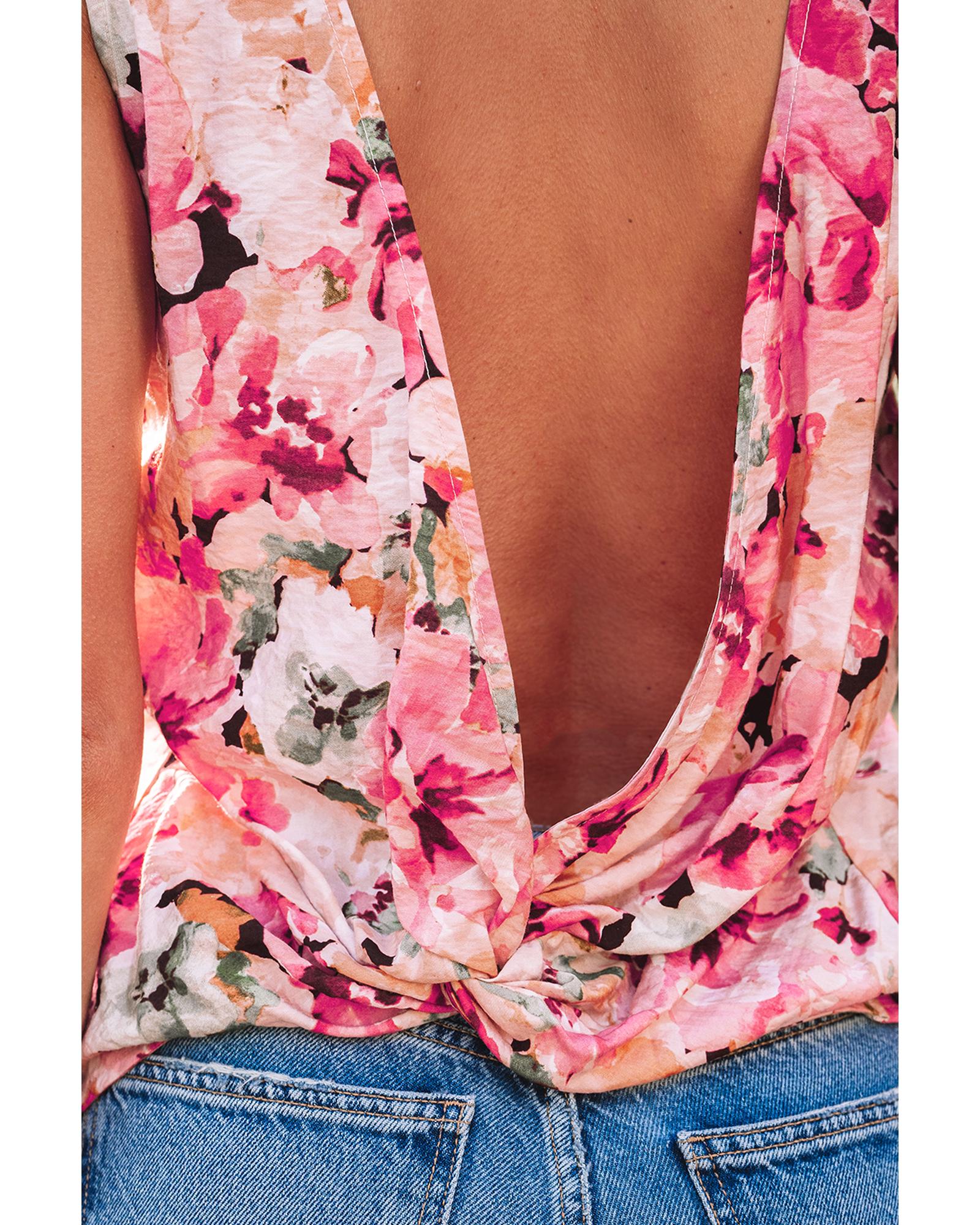Pink Floral Round Neck Twisted Cut Out Back Tank Top – L