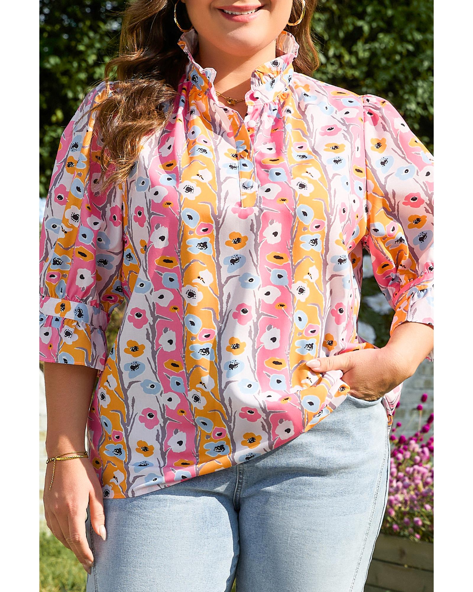 Pink Floral Ruffled Collar Bracelet Sleeve Plus Size Blouse Top – 3X