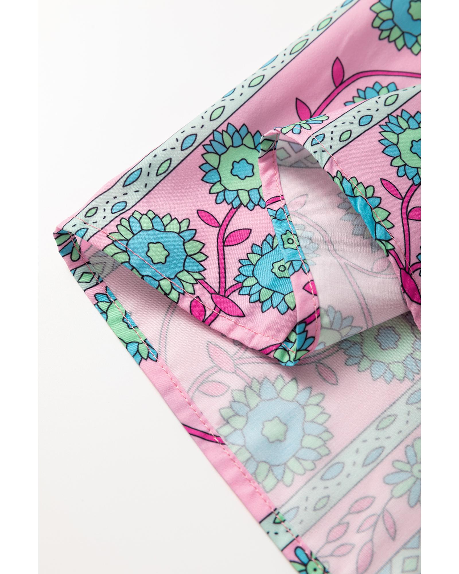 This midi dress features a charming pink floral print with a relaxed fit, making it perfect for casual or semi-formal occasions. It is designed with stylish shirred puff sleeves, a buttoned front closure, and a mandarin collar. The sash tie at the waist adds a flattering silhouette, while the soft lightweight fabric ensures comfort throughout the day.