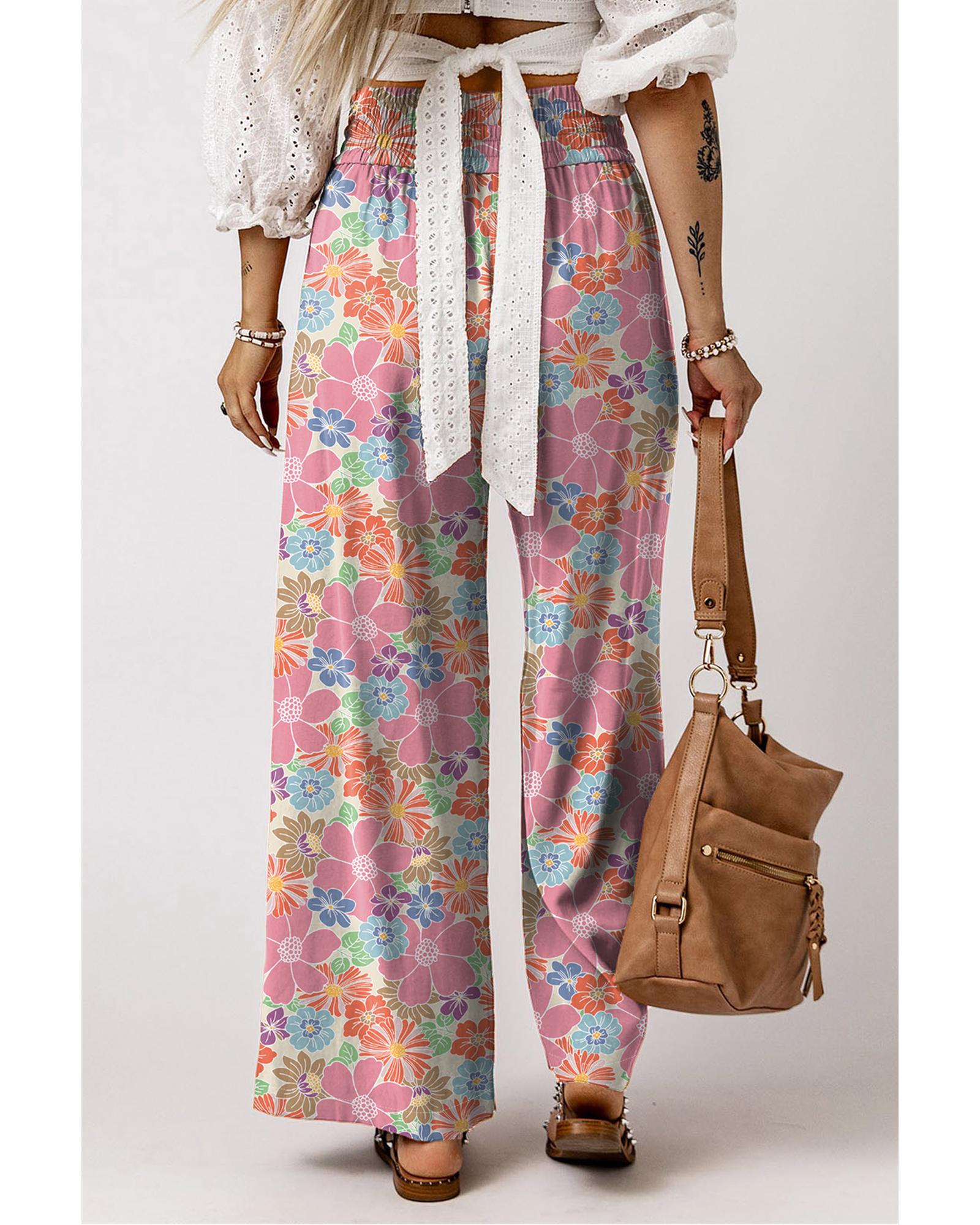 This pair of loose pants features a charming floral print and a comfortable, lightweight fabric. Designed with a trendy fitted look, it offers a flattering silhouette with an elastic smocked waist. Perfect for pairing with solid tops, especially lace blouses, these pants combine style and comfort effortlessly.