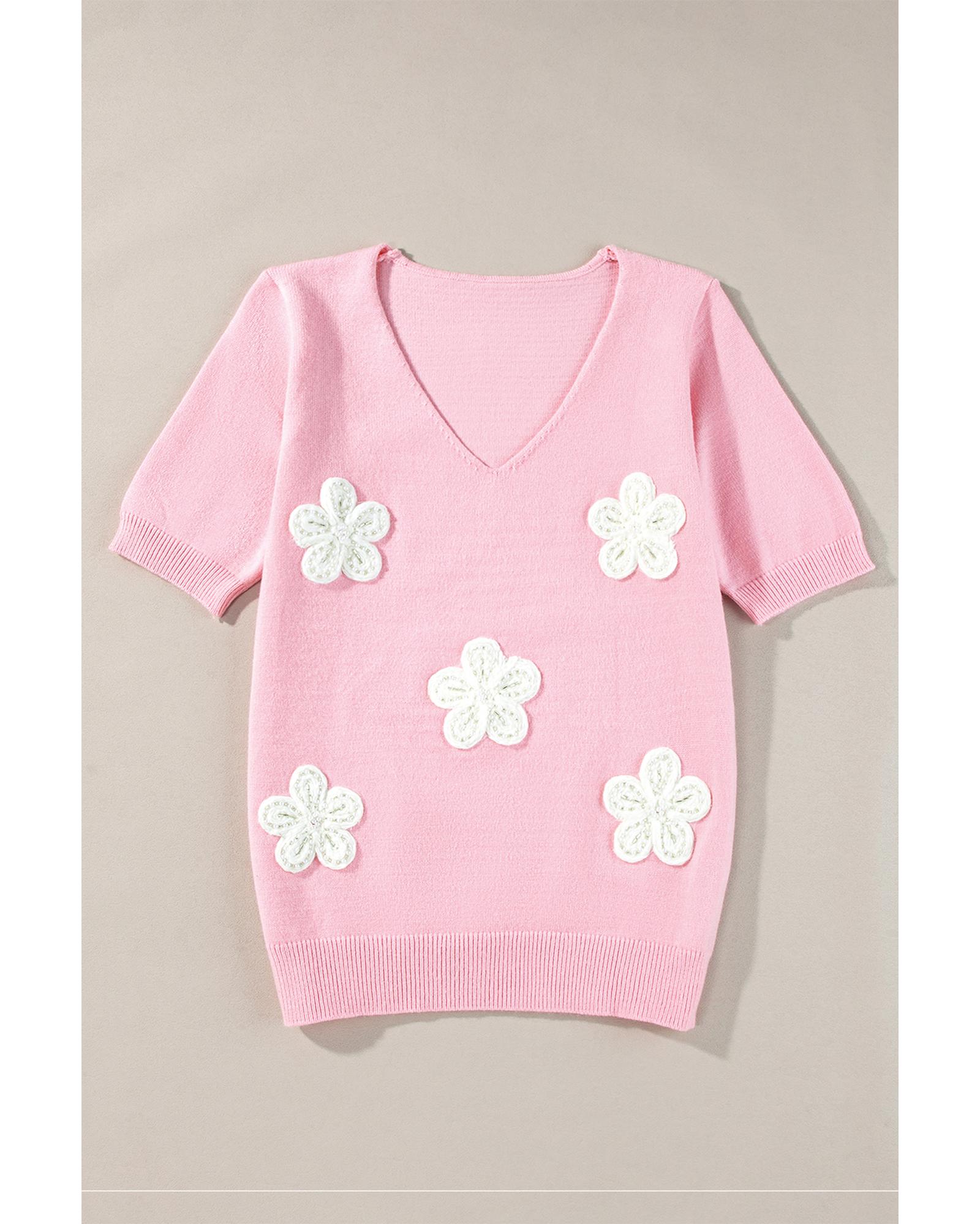 - 1 x Pink Flower Crochet V Neck Short Sleeve Sweater
