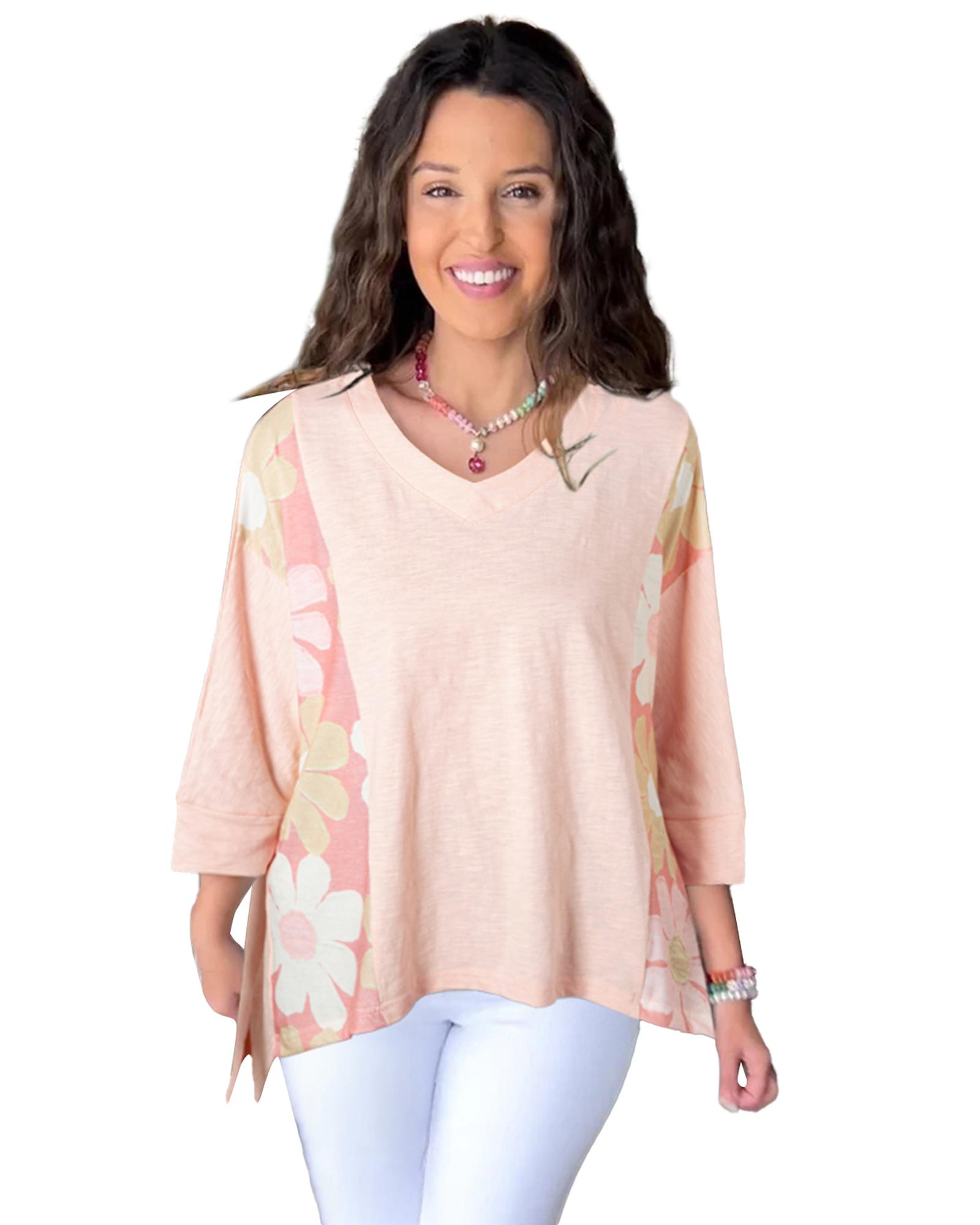 This oversized high low top features a trendy pink flower patchwork design with exposed seam detailing, offering a stylish and edgy look. The relaxed fit ensures comfort while the high low hem creates a modern silhouette.
