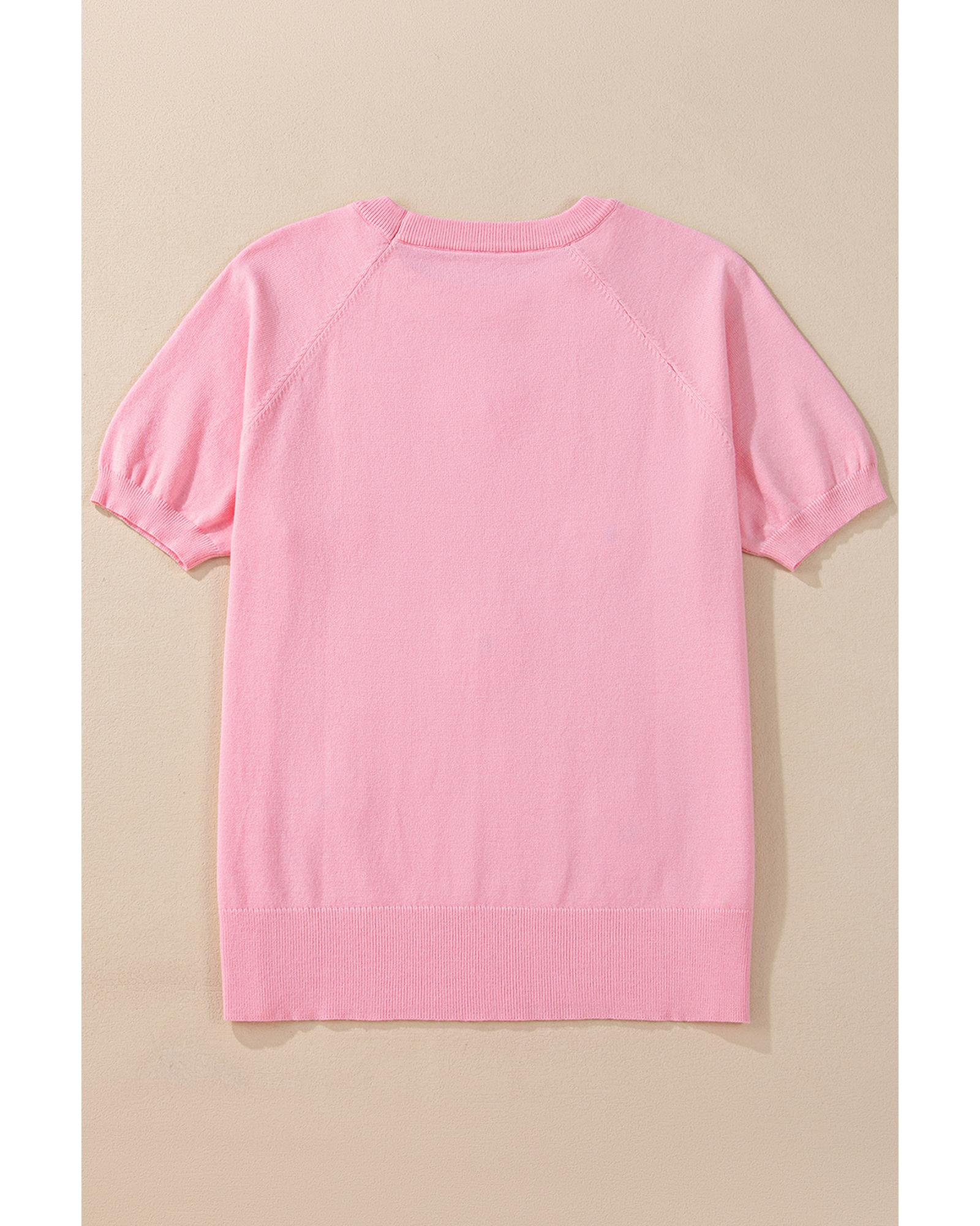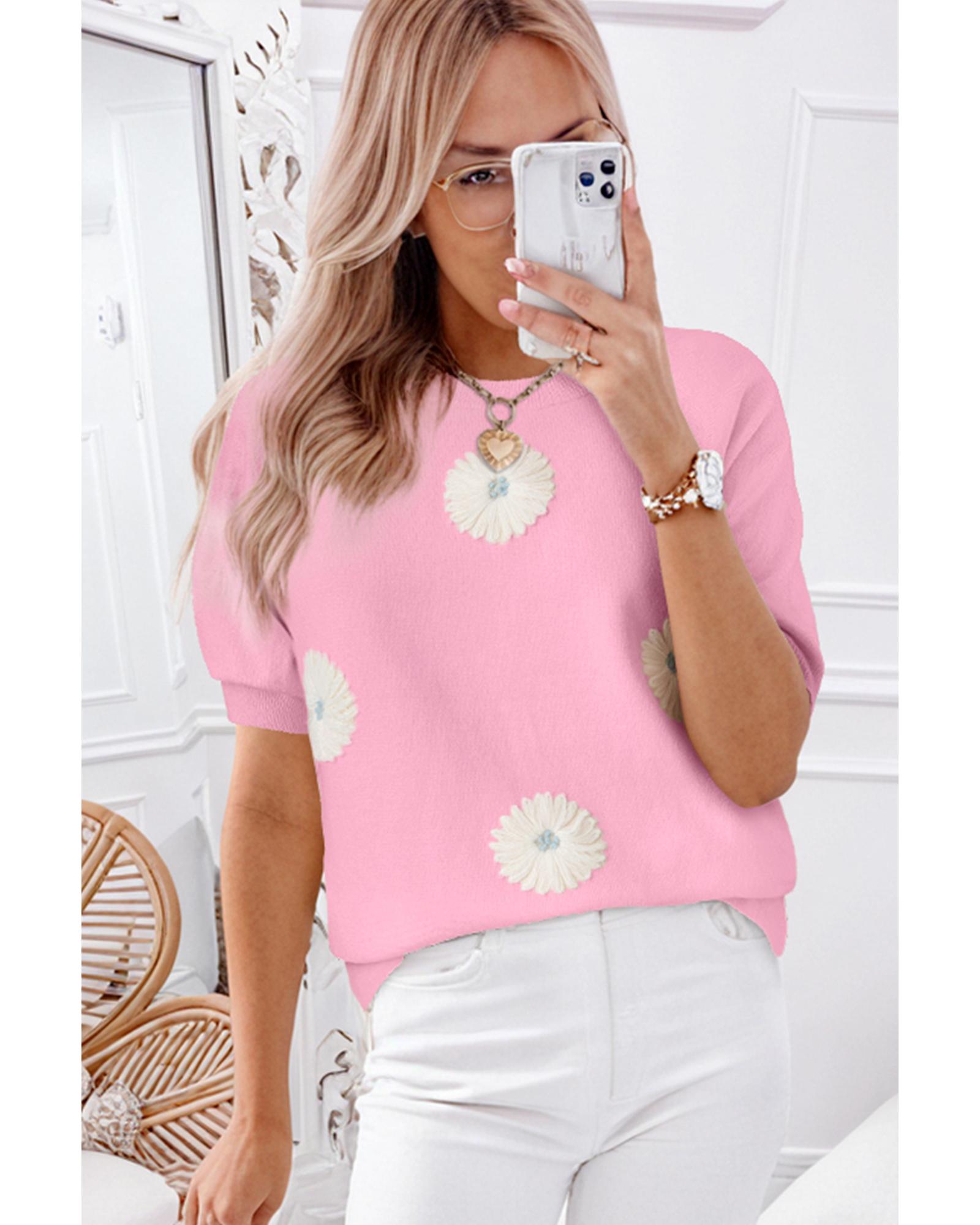 This short sleeve knitted top features a charming pink flower pattern, combining style and comfort for everyday wear. Its classic design and soft fabric make it a versatile addition to your wardrobe.