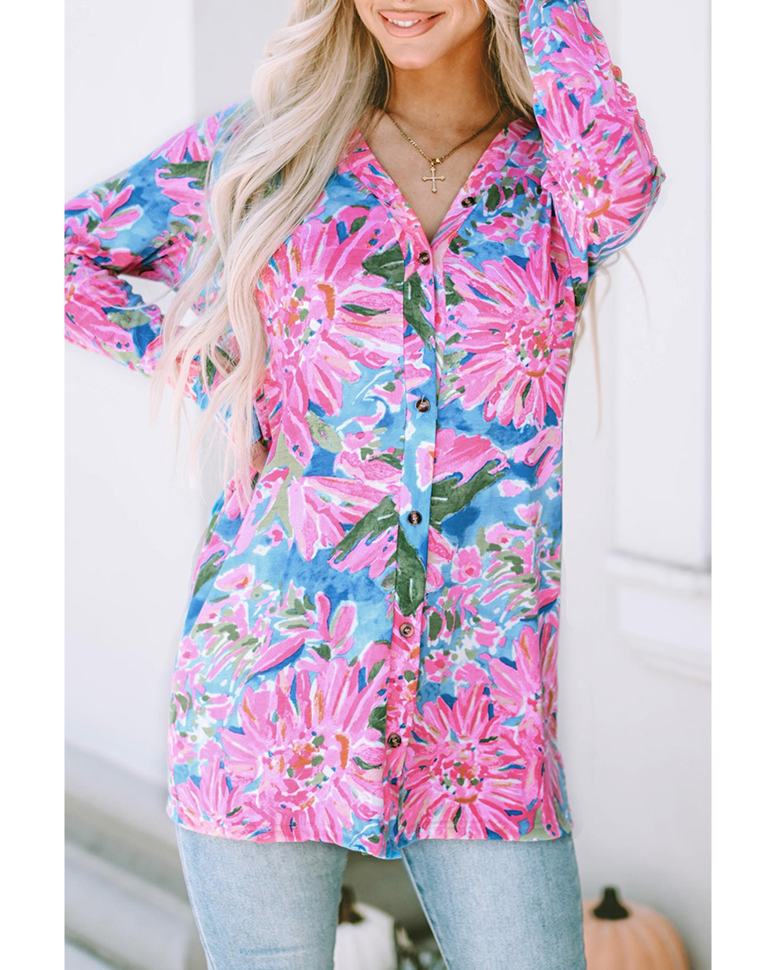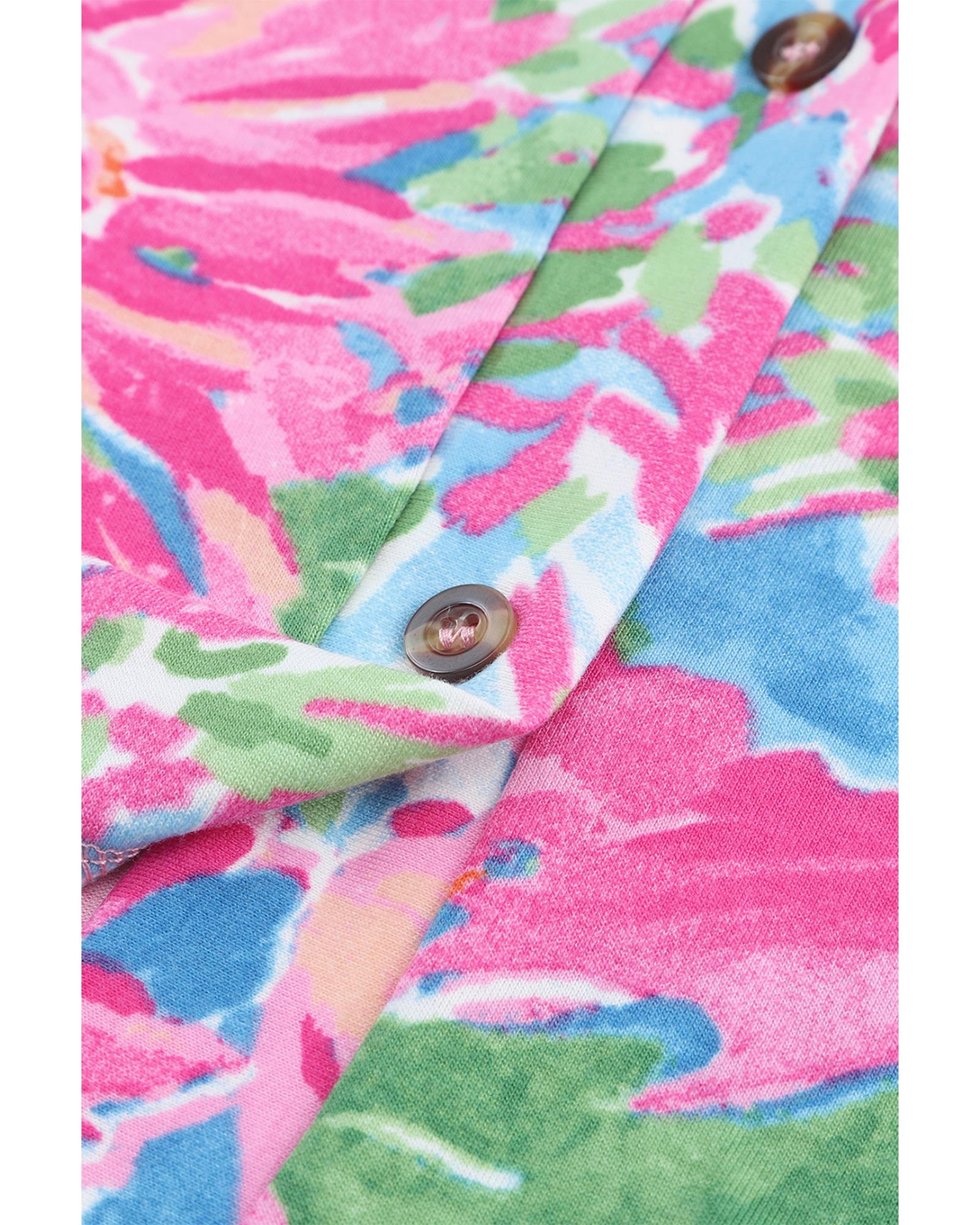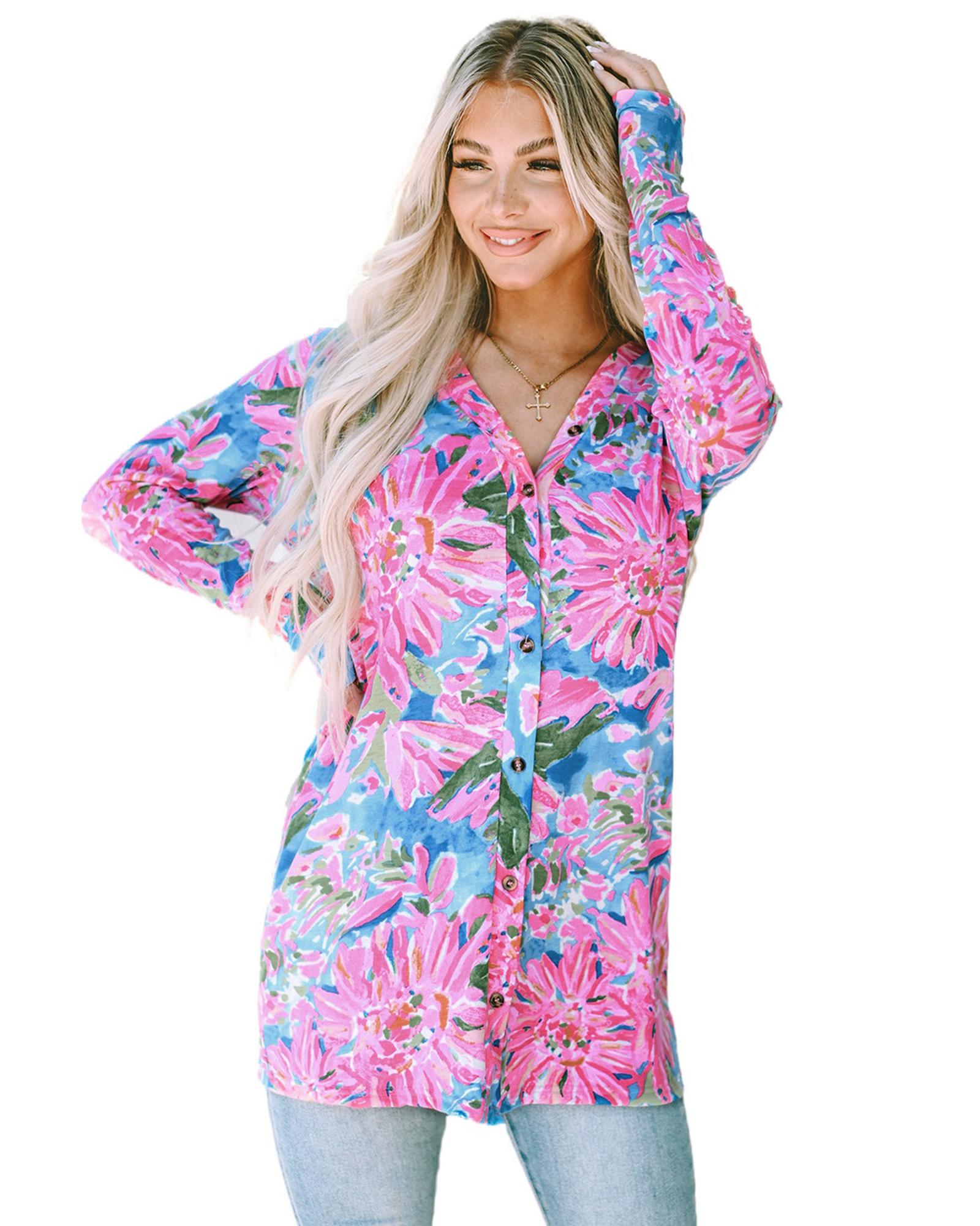 This long sleeve button-up cardigan features a beautiful pink flower print design, offering a stylish and versatile addition to your wardrobe. Its fitted silhouette provides a trendy look suitable for various occasions, combining comfort and elegance.