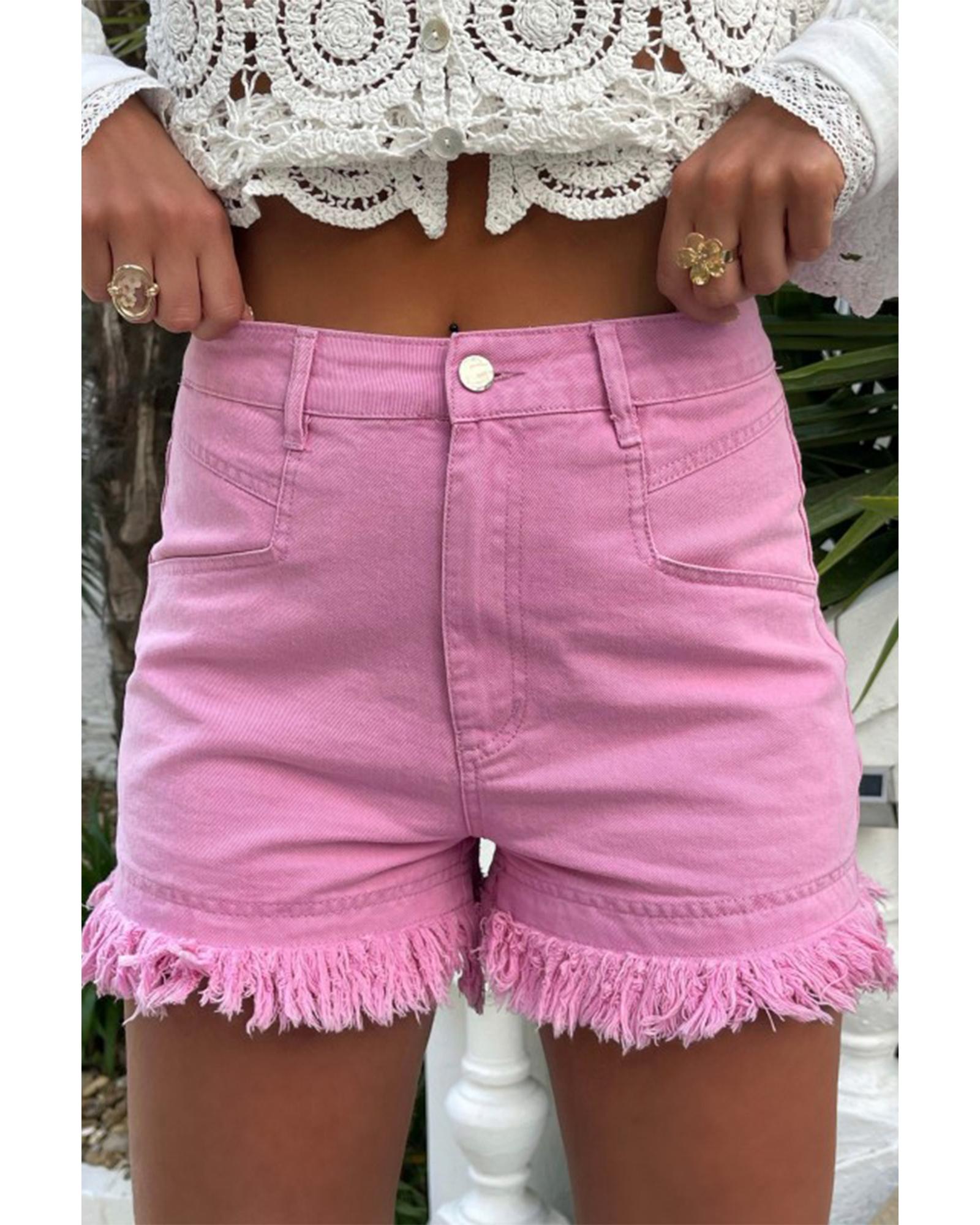 This pair of mid-rise denim shorts features a trendy frayed edge design, offering a stylish and casual look. Made from durable denim fabric, these shorts provide both comfort and fashion for everyday wear. They are available in various sizes to ensure a suitable fit for different body types.