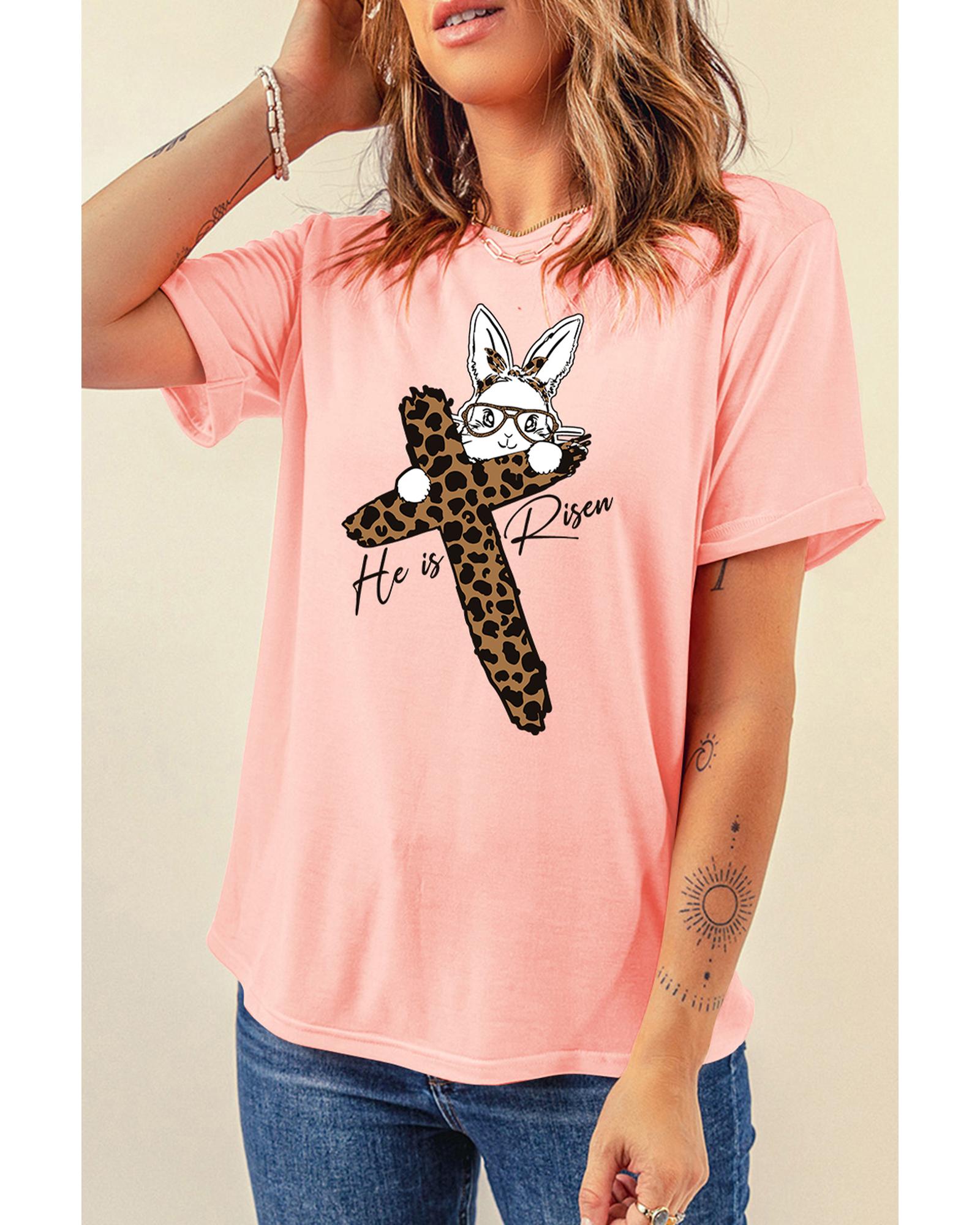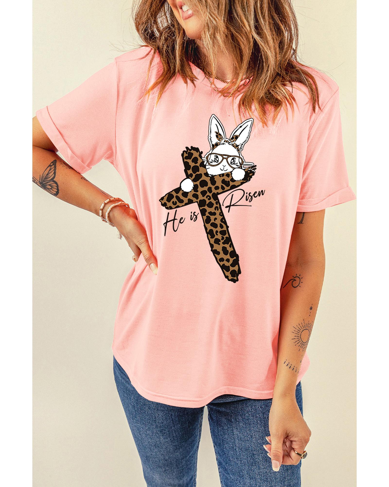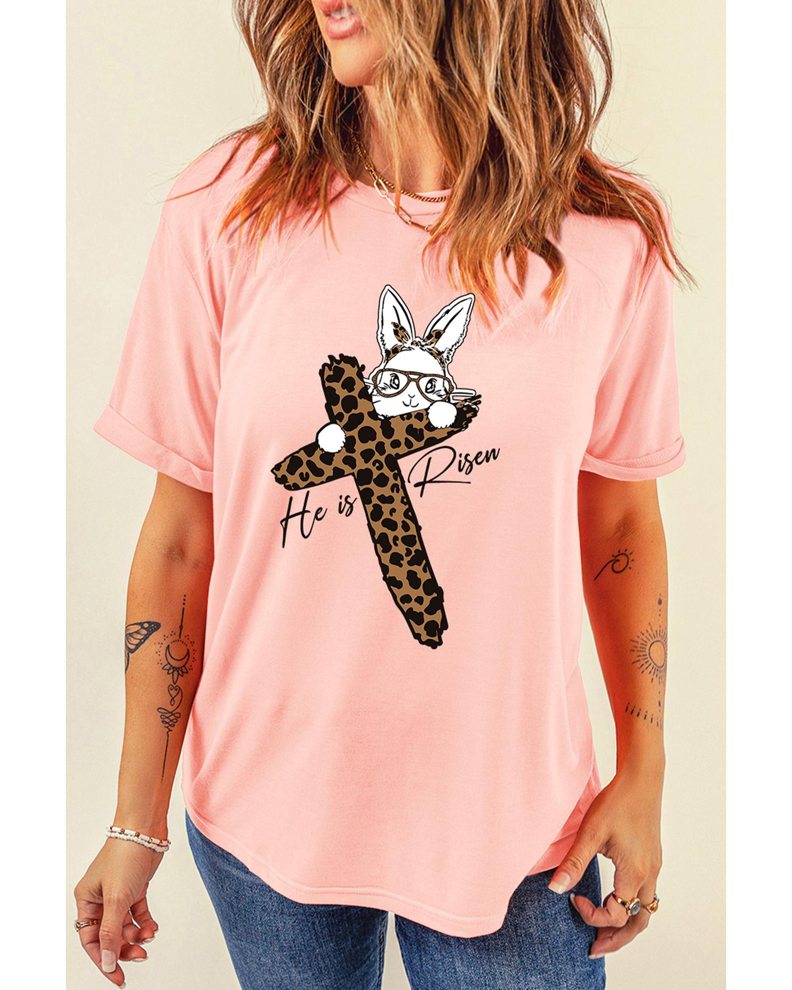 Pink He is Risen Easter Bunny Leopard Cross Graphic Tee – 2XL