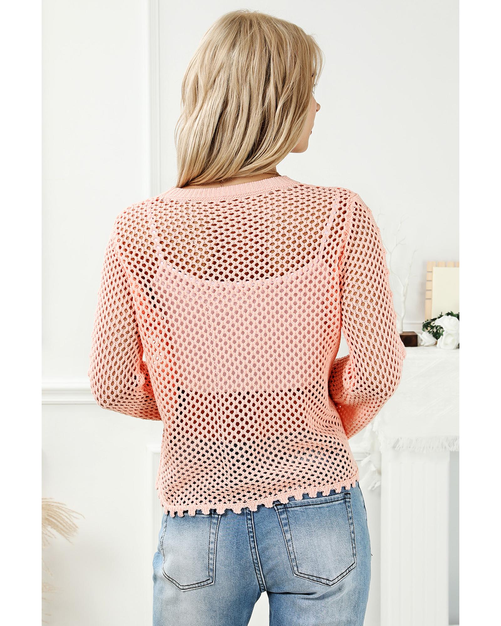 Pink Hollowed Eyelets Knit Bell Sleeve Sweater – M