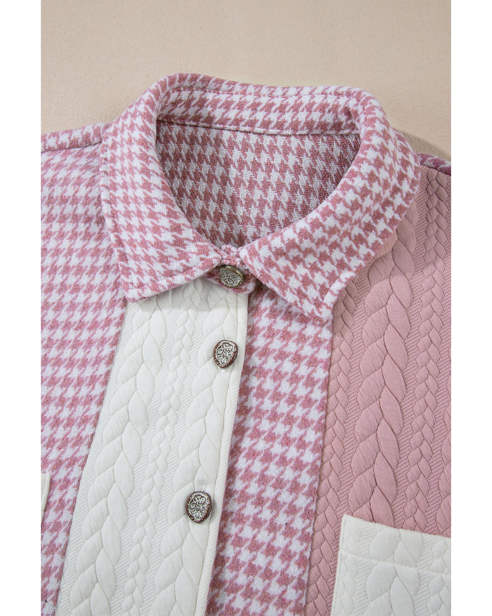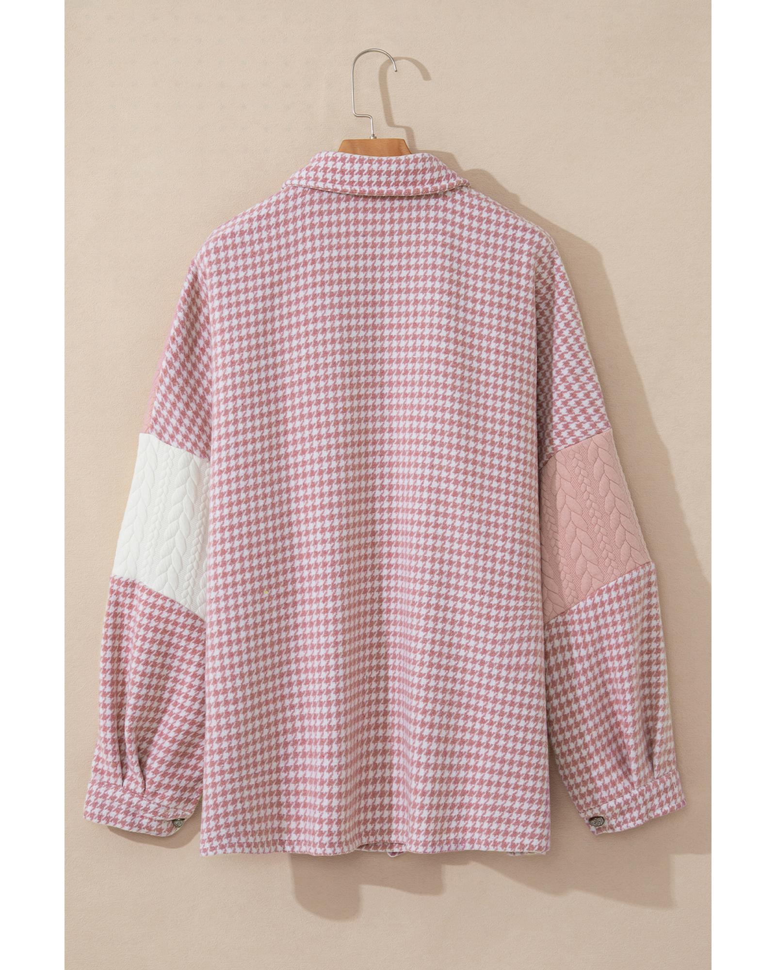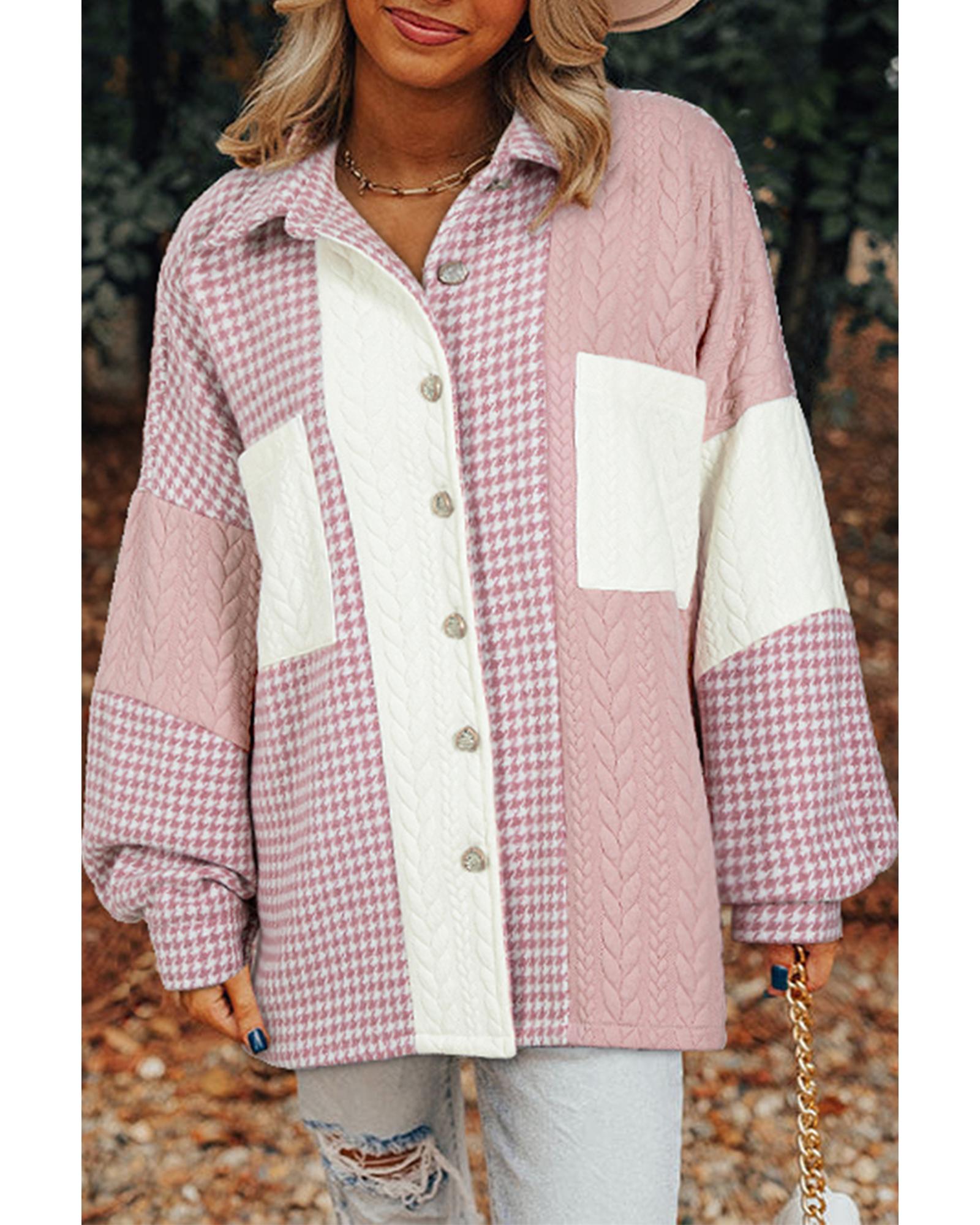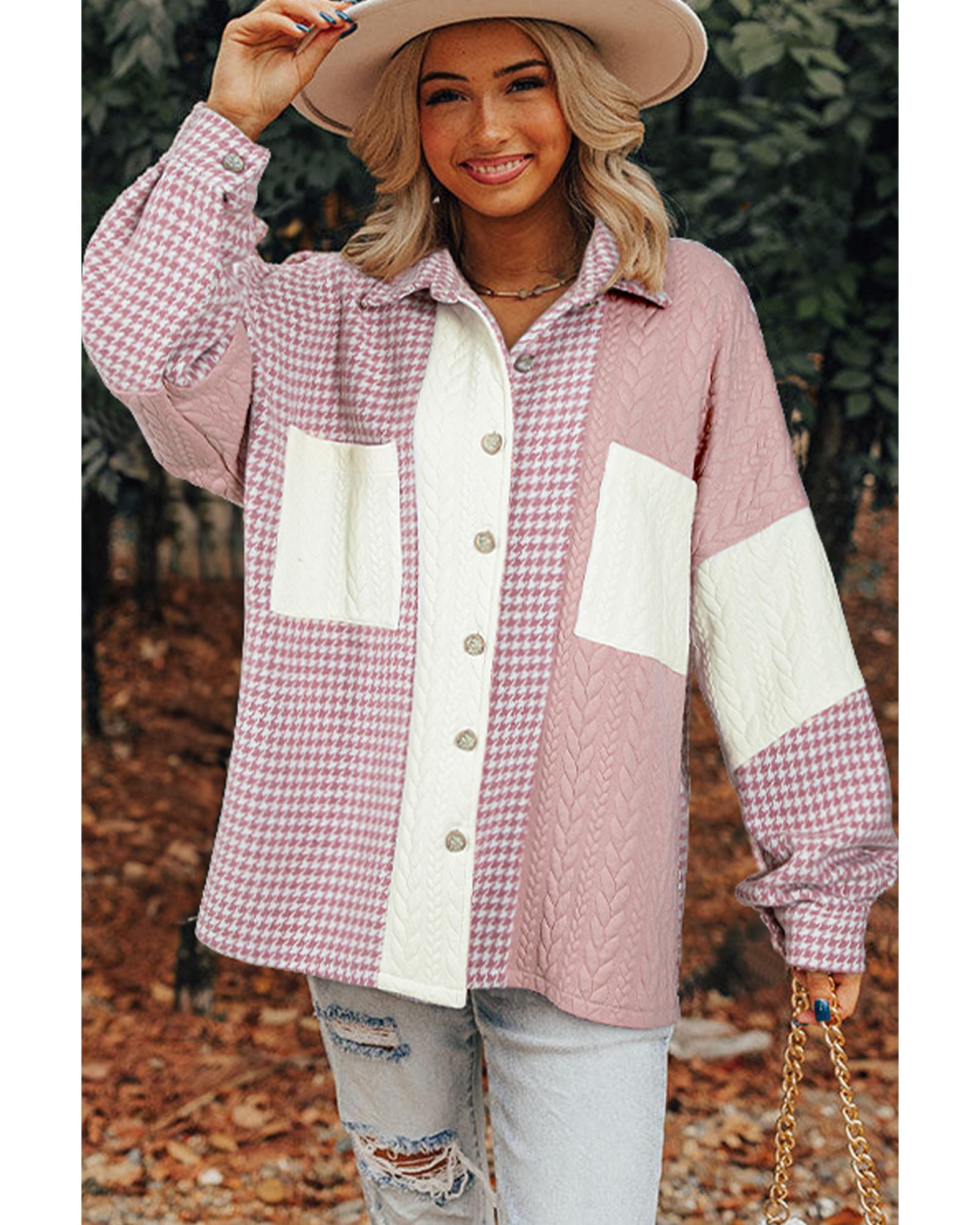 Package Content: 1 x Pink Houndstooth Color Contrast Textured Patchwork Loose Shacket