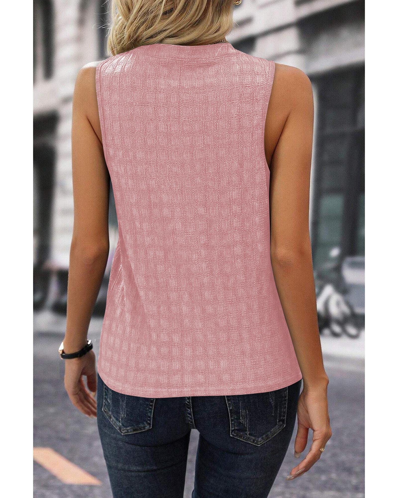 This tank top features a pink lattice textured fabric with a split neck and sleeveless design, making it suitable for both dressy and casual occasions. Its versatile style allows for easy pairing with pants, skirts, or shorts, providing a trendy and comfortable look.