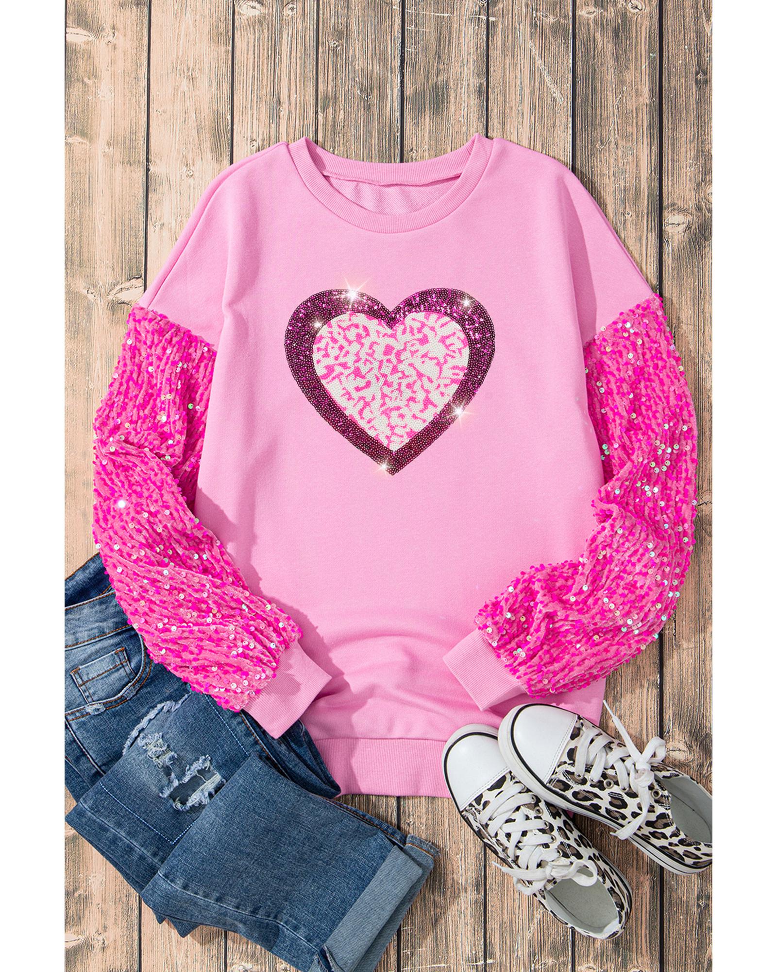 Pink Leopard Heart Graphic Sequin Patchwork Long Sleeve Valentines Top – S