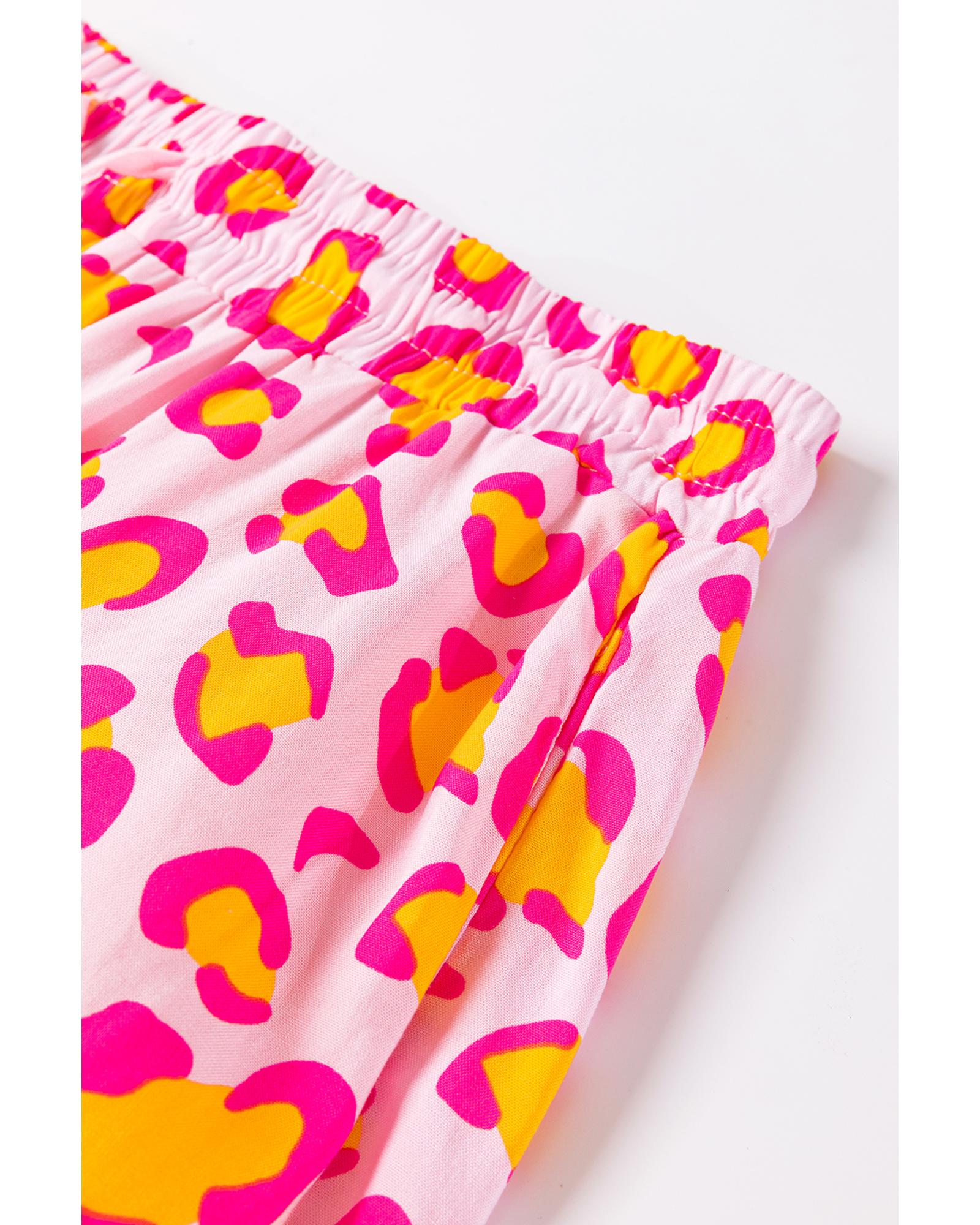 This pajama set features a stylish pink leopard print design, combining comfort and fashion for lounging or sleeping. The long sleeve shirt offers a relaxed fit, while the drawstring waist shorts provide adjustable comfort. Made from lightweight viscose, it ensures a cozy and fashionable experience.