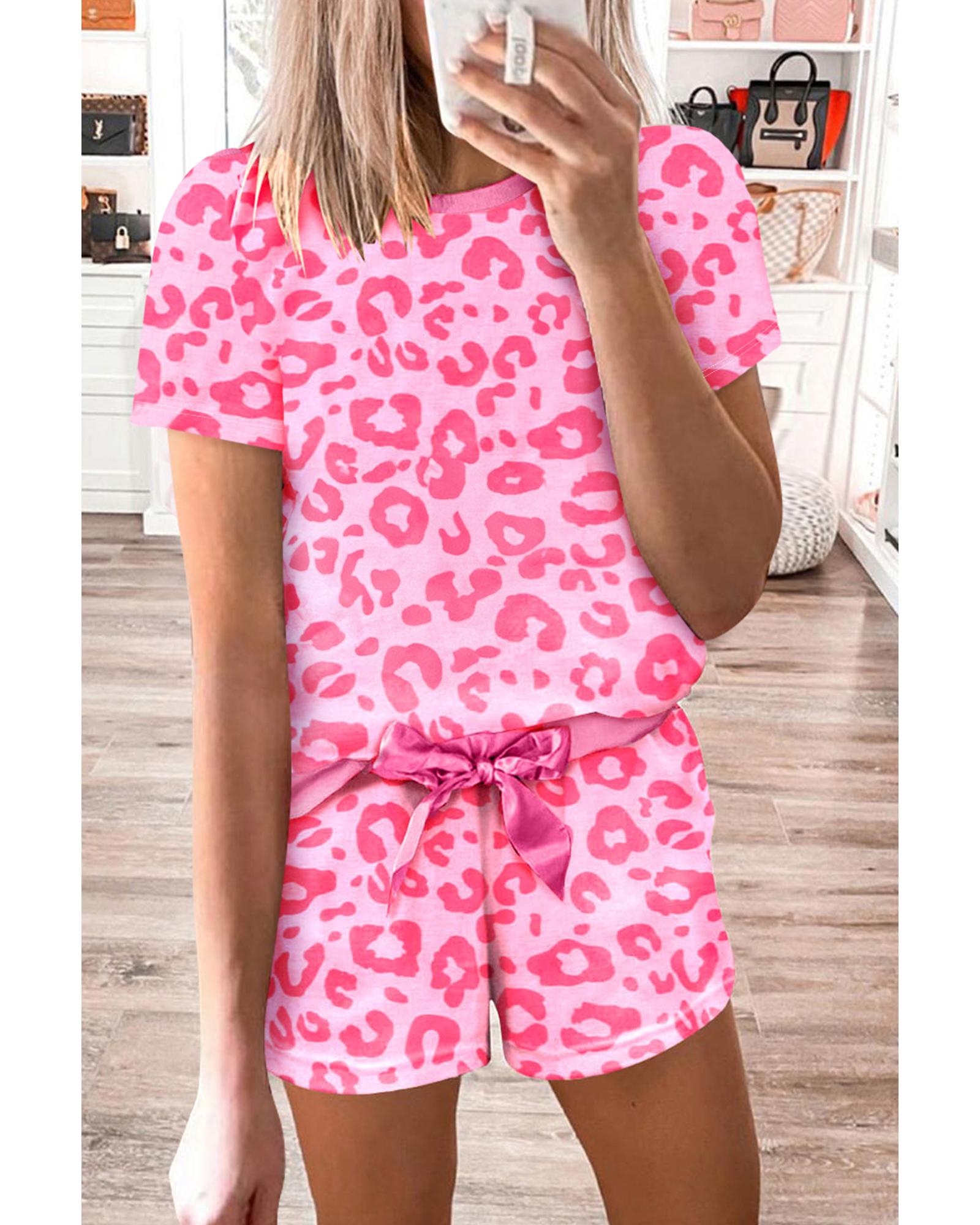 Pink Leopard Print Tee and Satin Tie Shorts Lounge Set – M