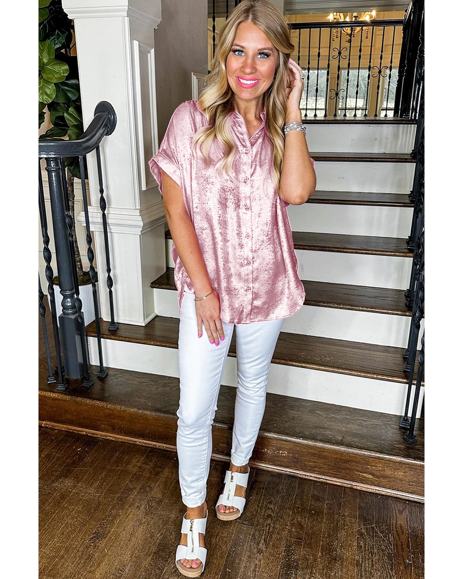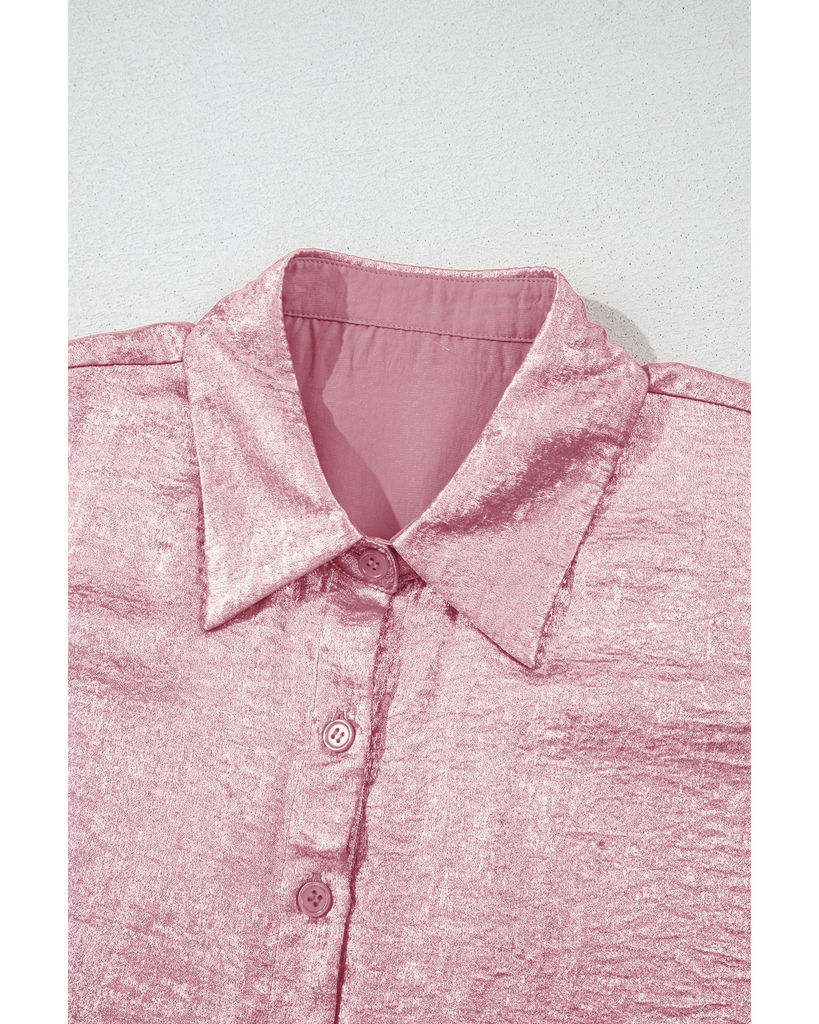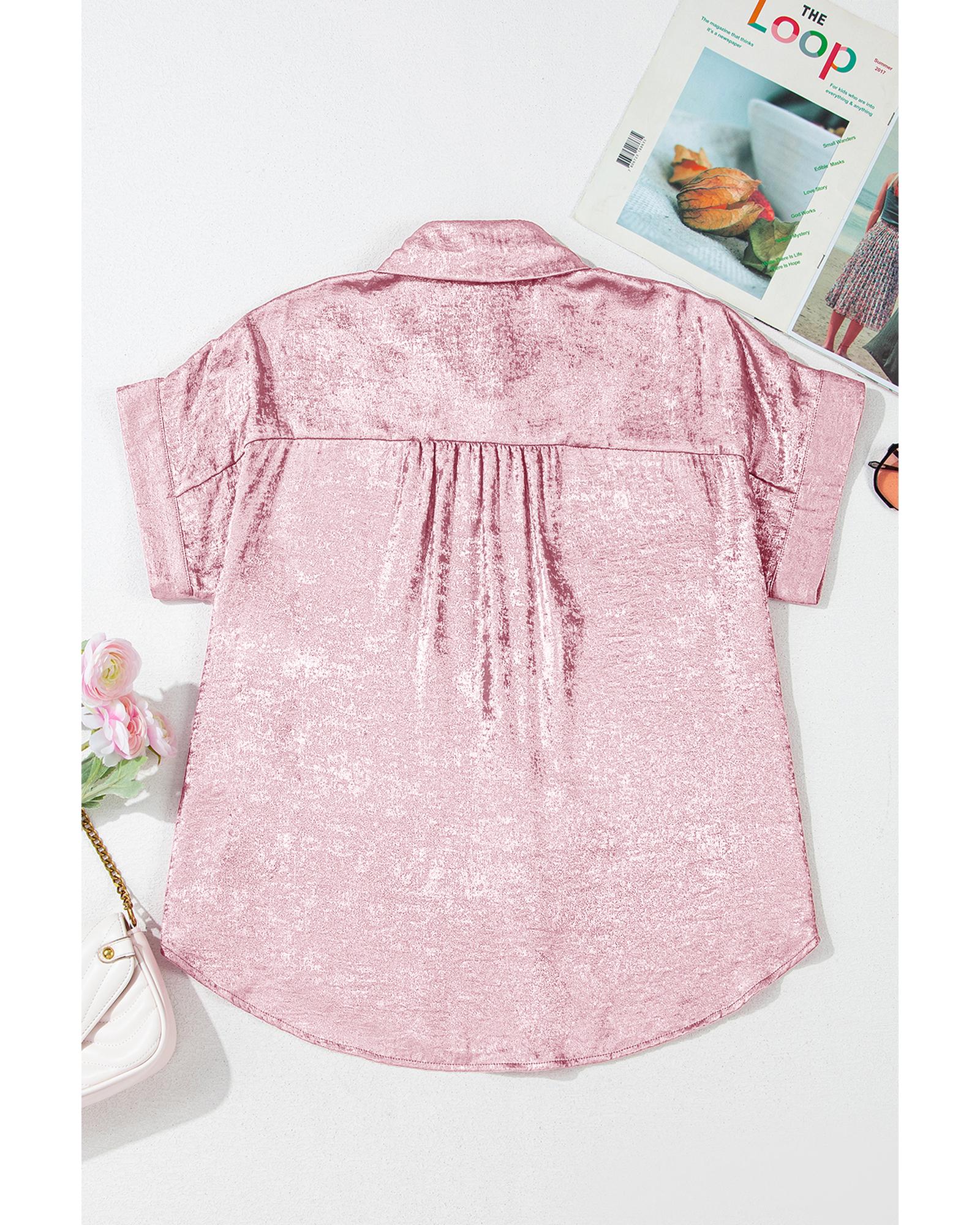 This casual shirt features a stylish metallic sheen that adds a touch of glamour to your everyday wardrobe. Designed with short sleeves and a buttoned front, it offers easy dressing and versatile styling options. Made from lightweight fabric, it provides all-day comfort and pairs well with skirts, fitted pants, or other casual bottoms.