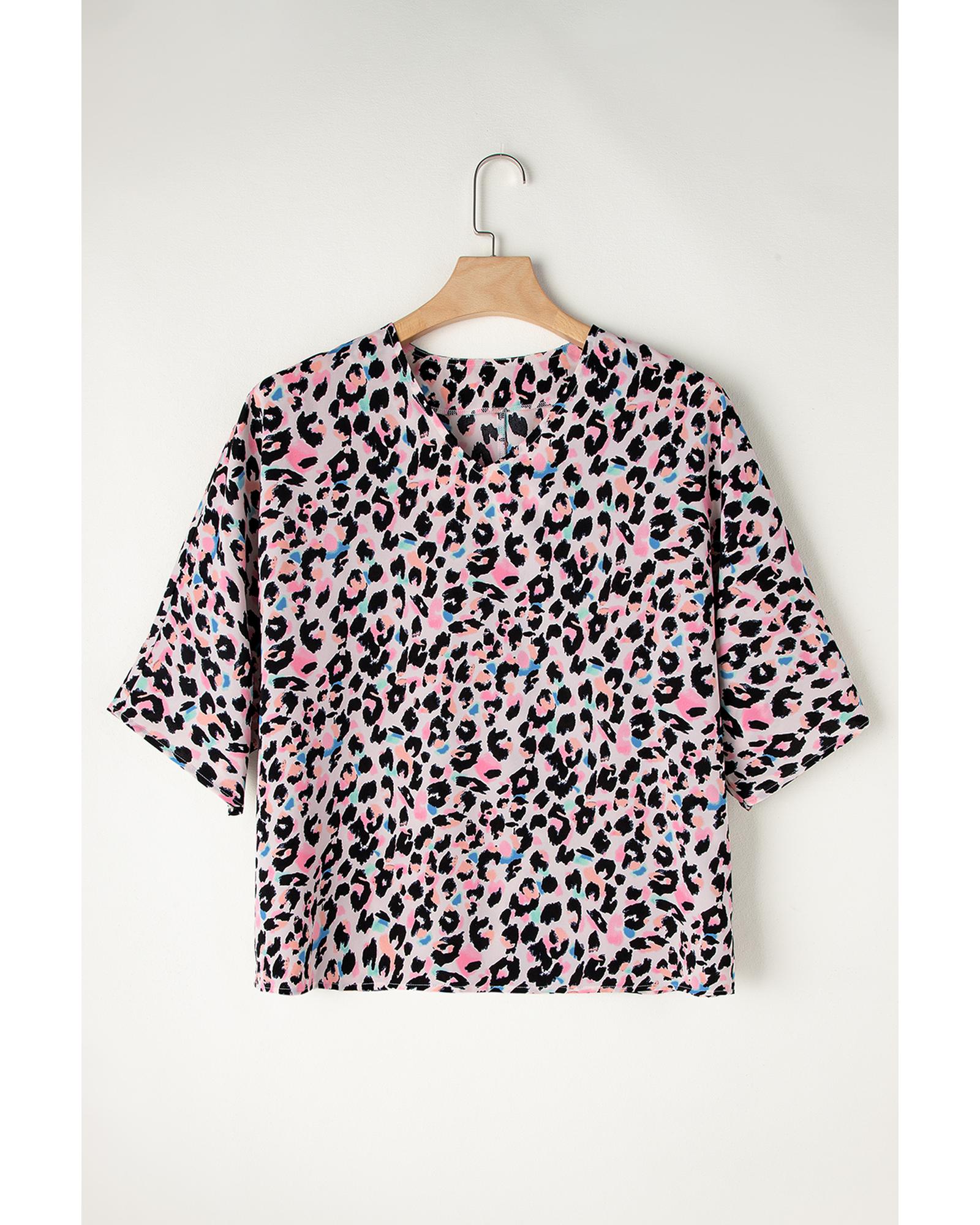 This oversized blouse features a trendy pink multicolor leopard print and a flattering V-neck design, making it a stylish addition to any wardrobe. Its loose fit accommodates various body shapes, providing comfort and versatility for both casual and dressed-up occasions.