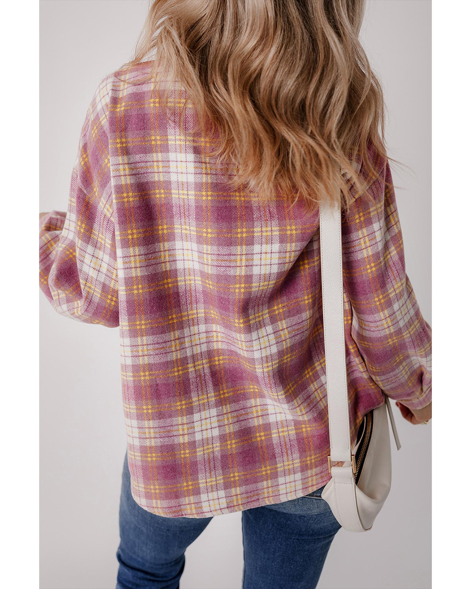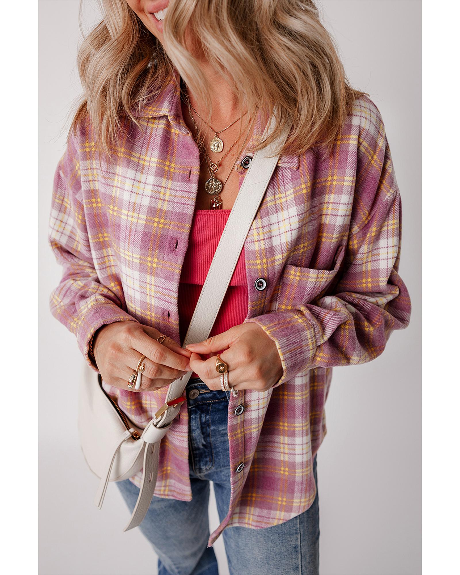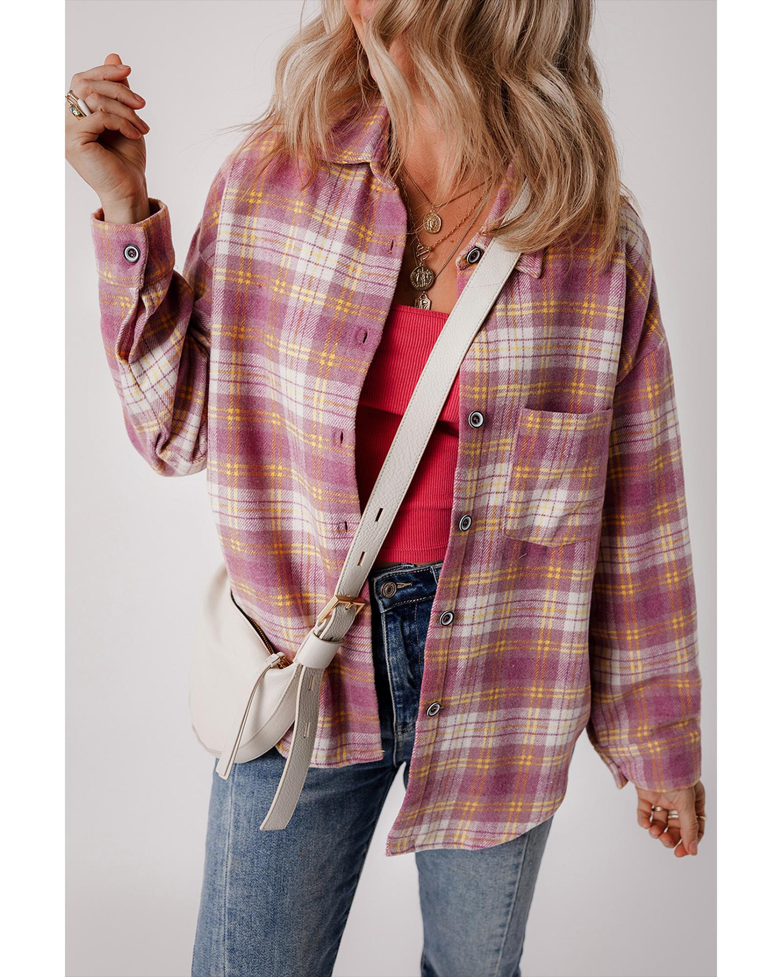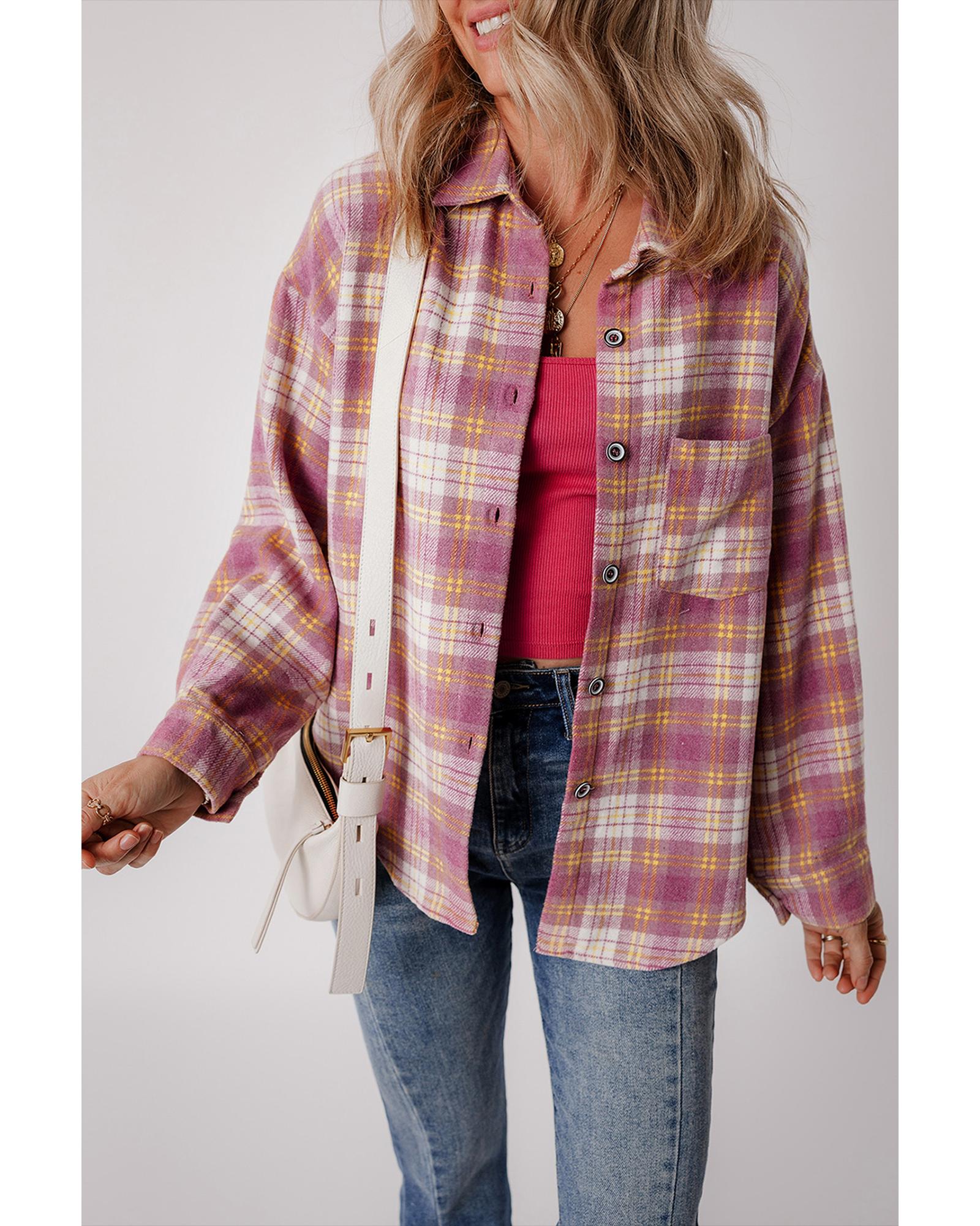 This long sleeve shacket features a stylish pink plaid print and a convenient chest pocket, combining the casual look of a shirt with the warmth of a jacket. It is designed to provide a trendy fitted appearance and versatile layering options, making it suitable for various casual occasions.