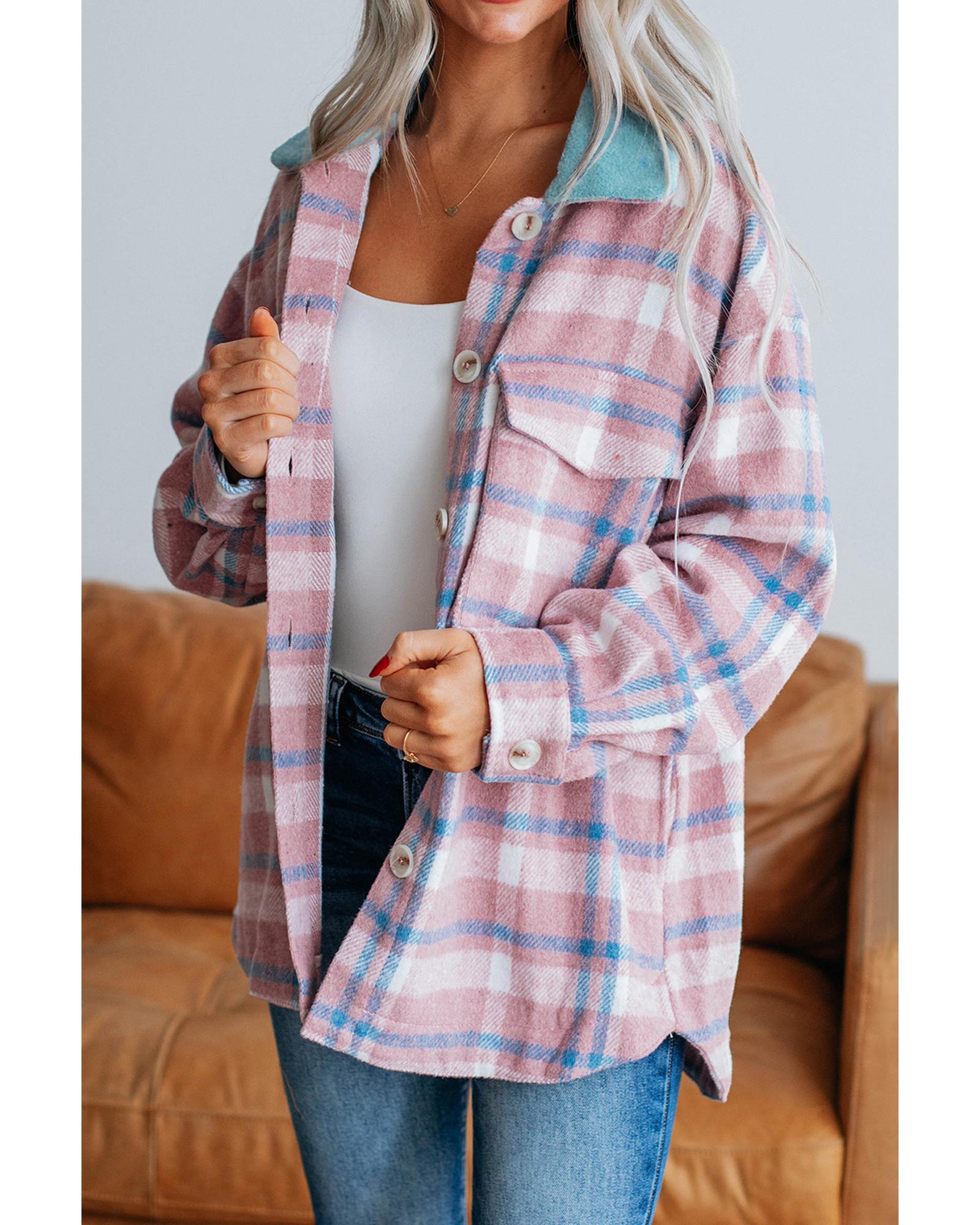 Pink Plaid Print Color Block Collared Flap Pockets Loose Shacket – XL