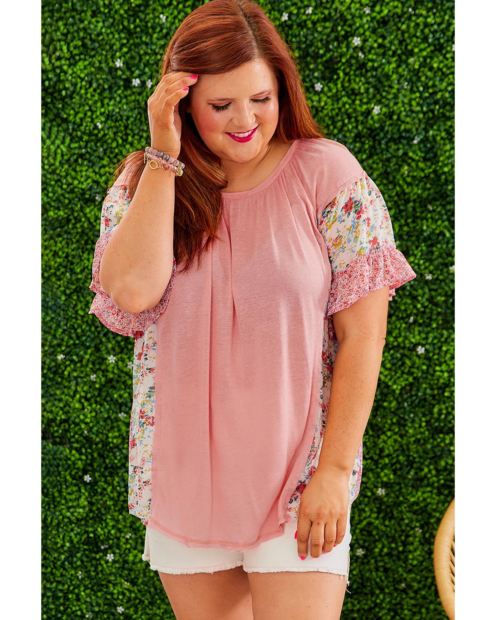 Pink Plus Size Floral Patchwork Ruffled Short Sleeve Blouse – 1X