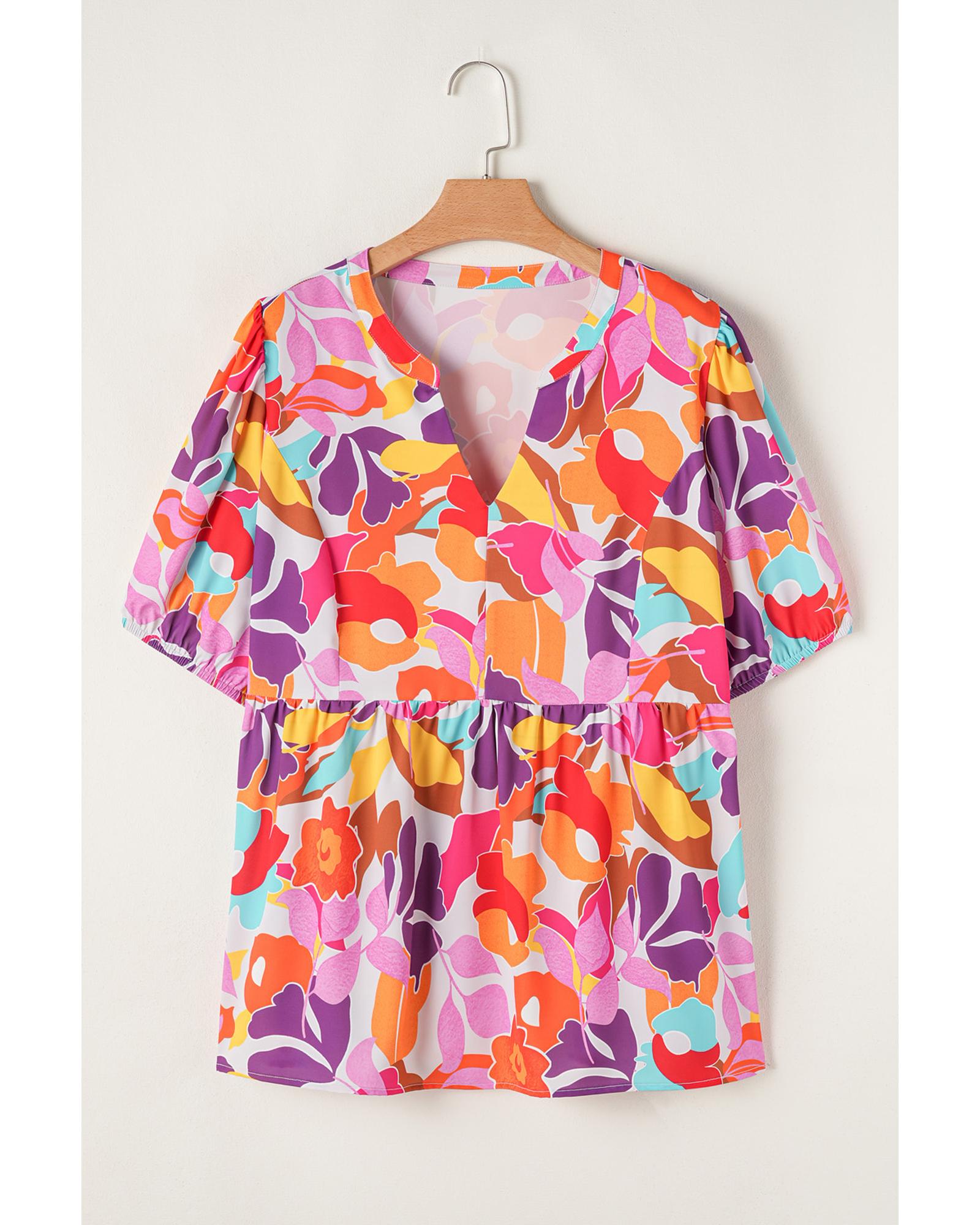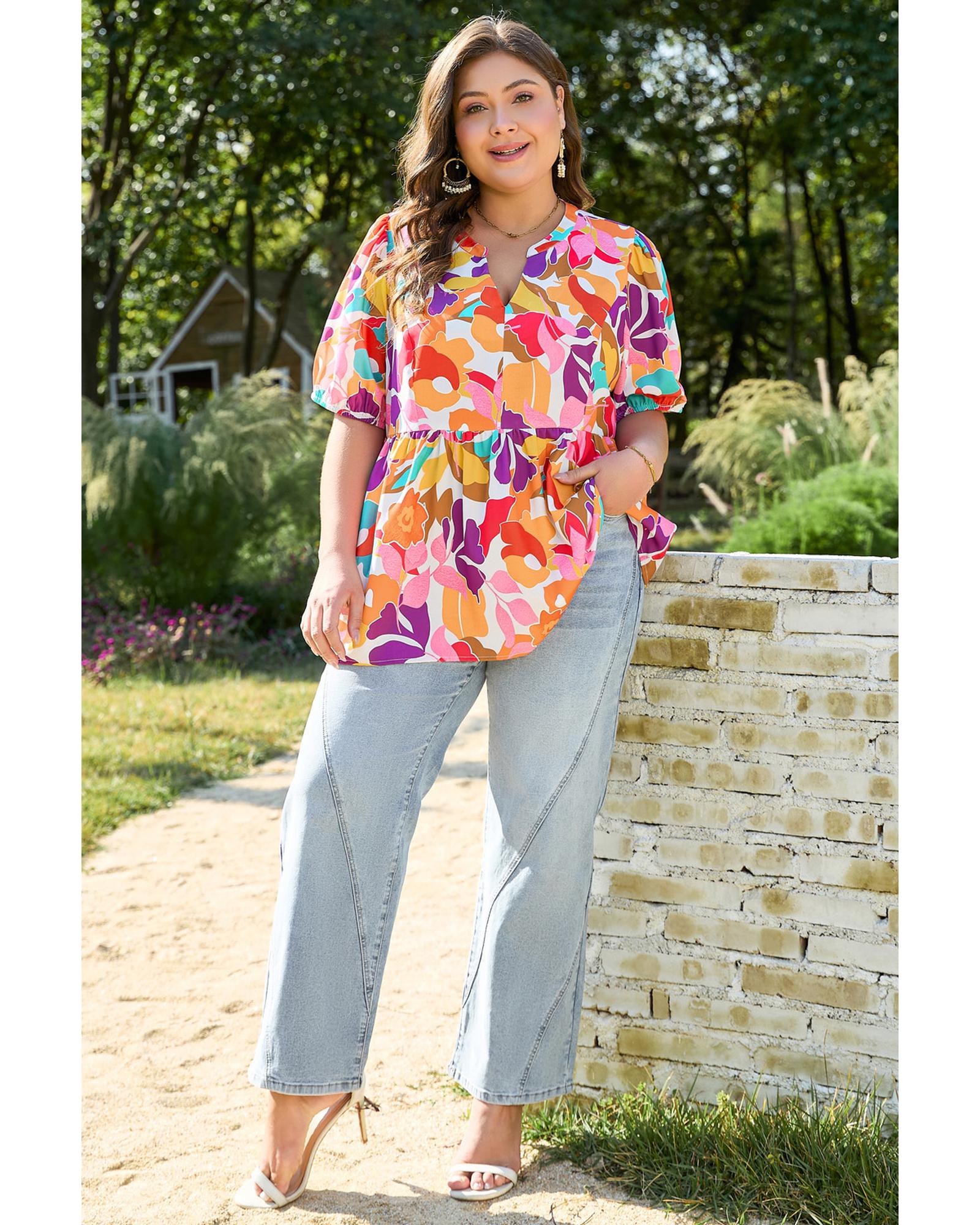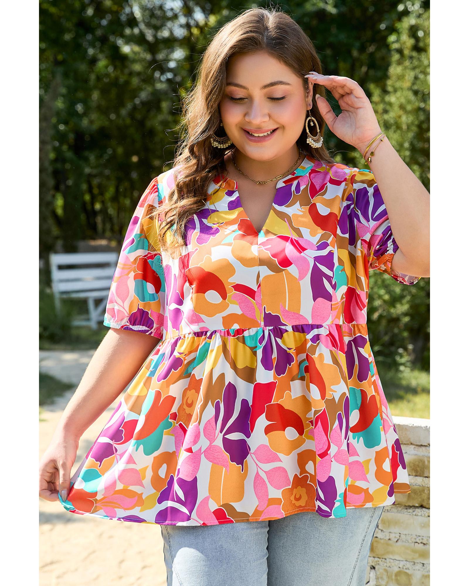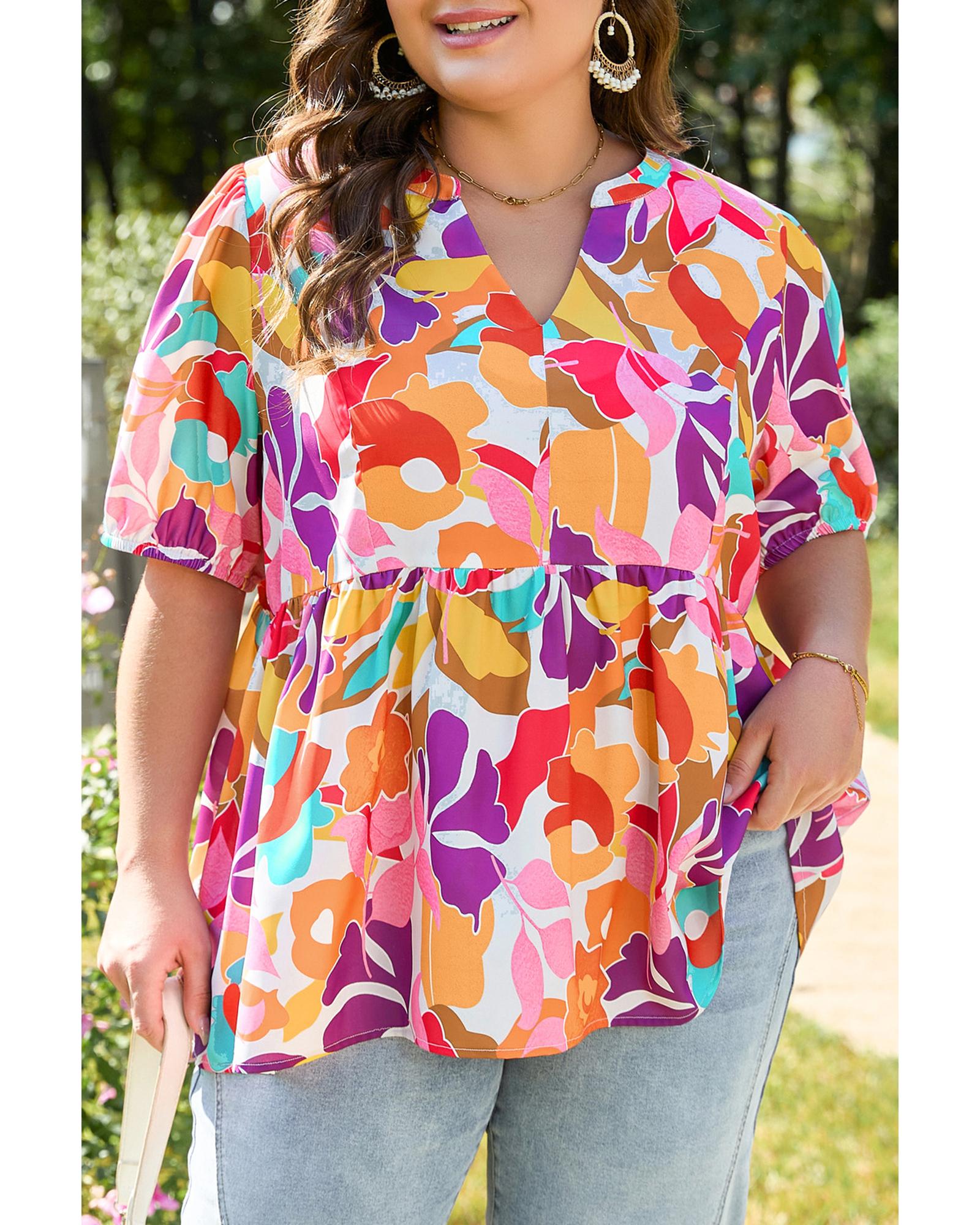 This plus size floral print blouse features a V neckline and a fit and flare silhouette, designed to create a flattering and elegant look. The blouse is available in a range of sizes to suit different body types, offering a sophisticated style for various occasions.