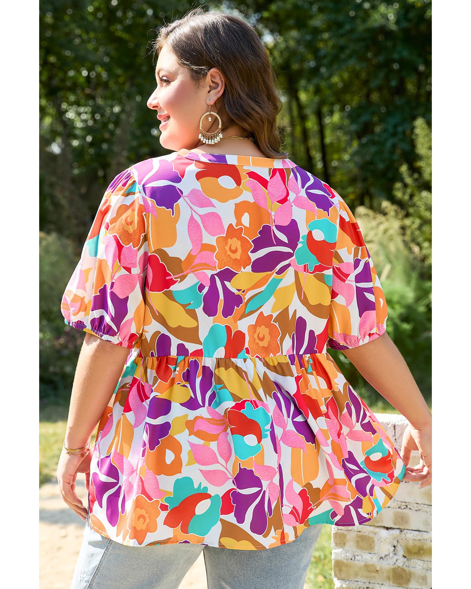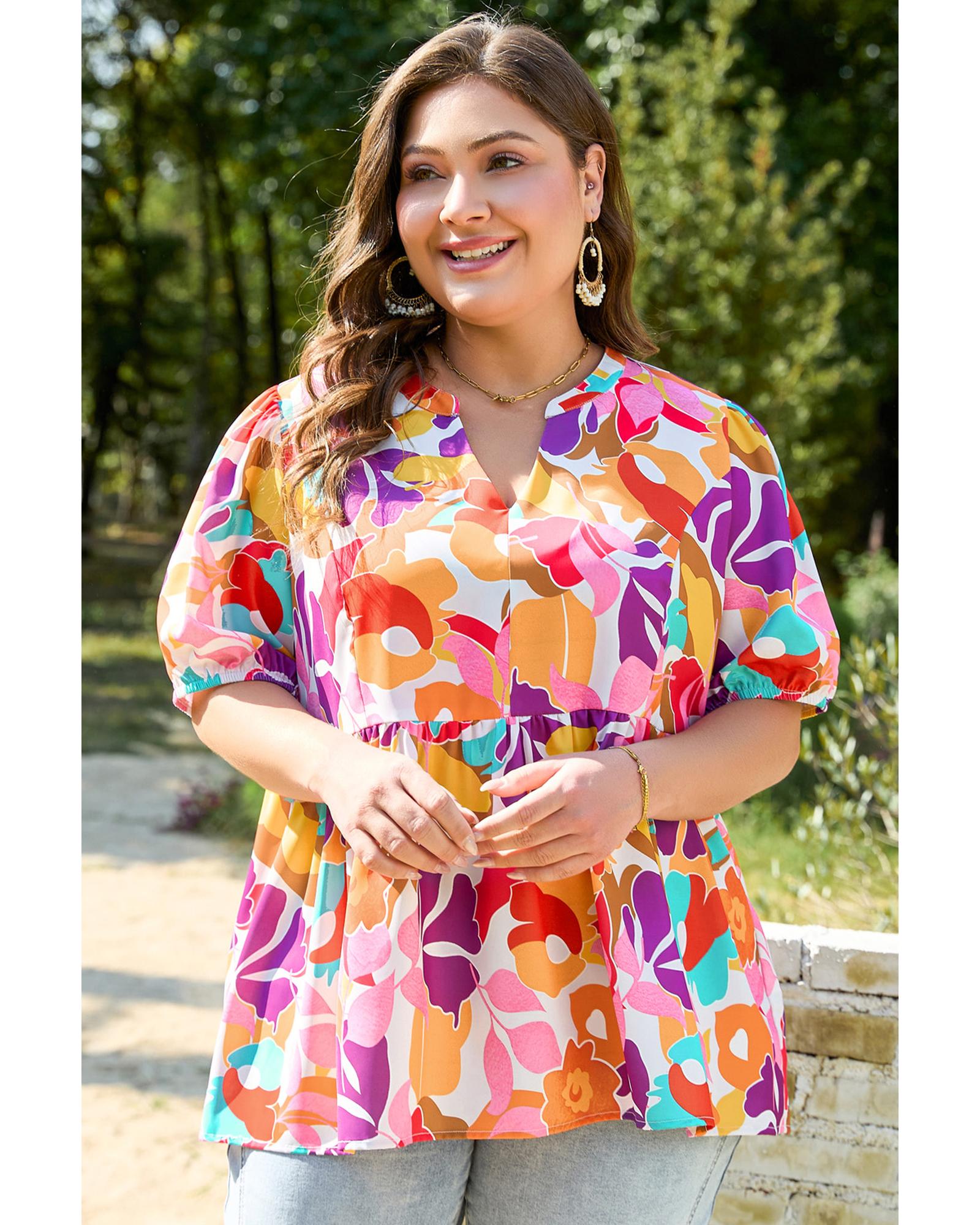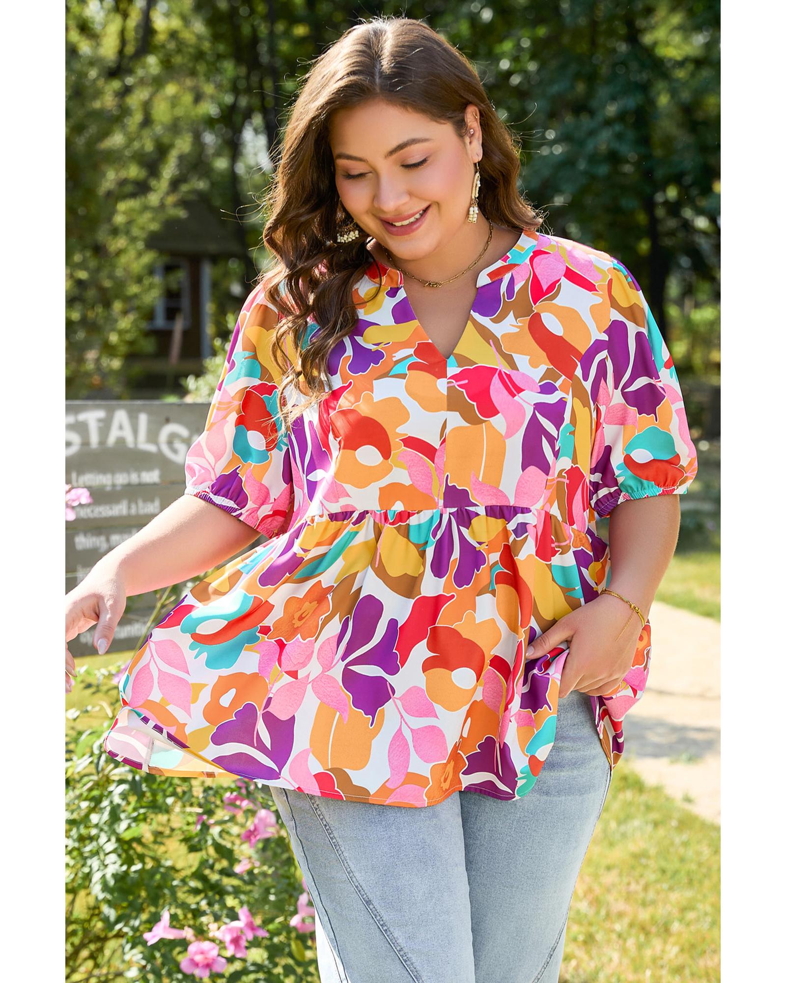 This plus size floral print blouse features a V neckline and a fit and flare silhouette, designed to create a flattering and elegant look. The blouse is available in a range of sizes from 1X to 4X, making it suitable for various body types. Crafted from 100% polyester, it offers a comfortable fit without elasticity.