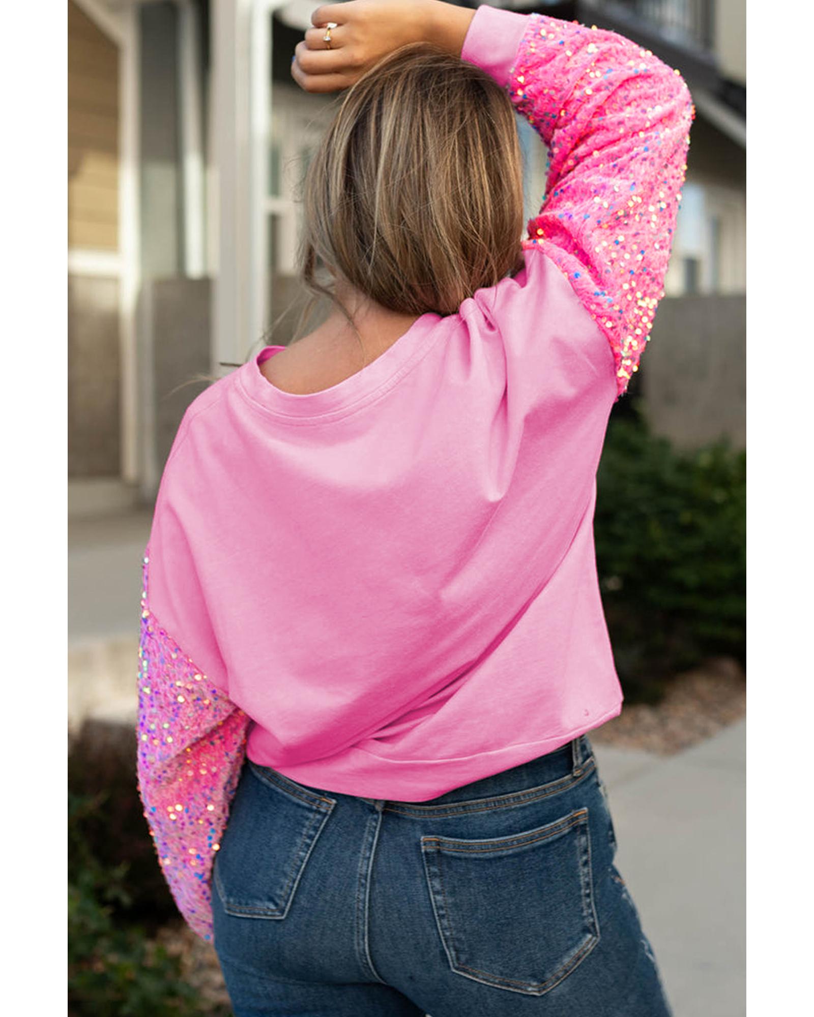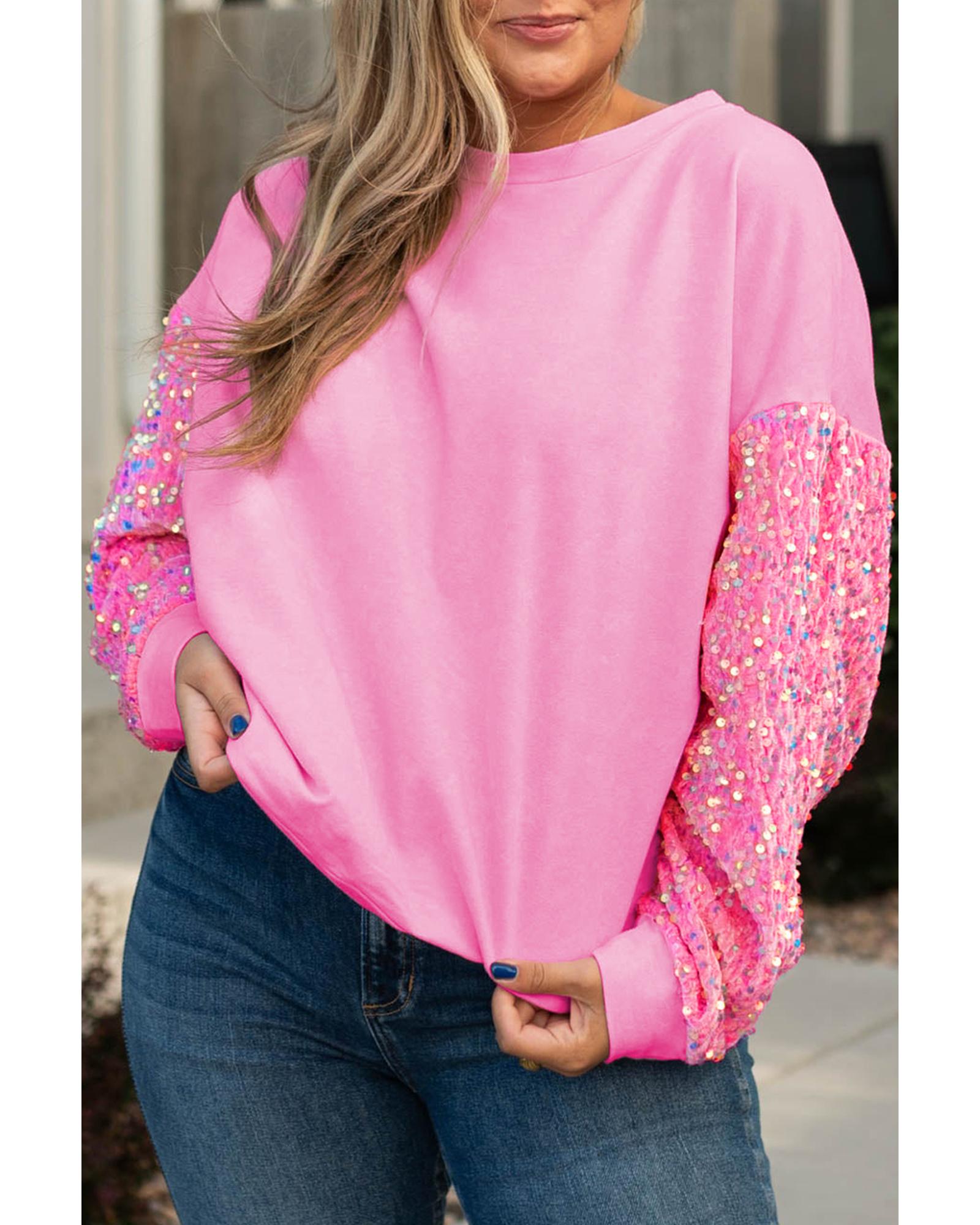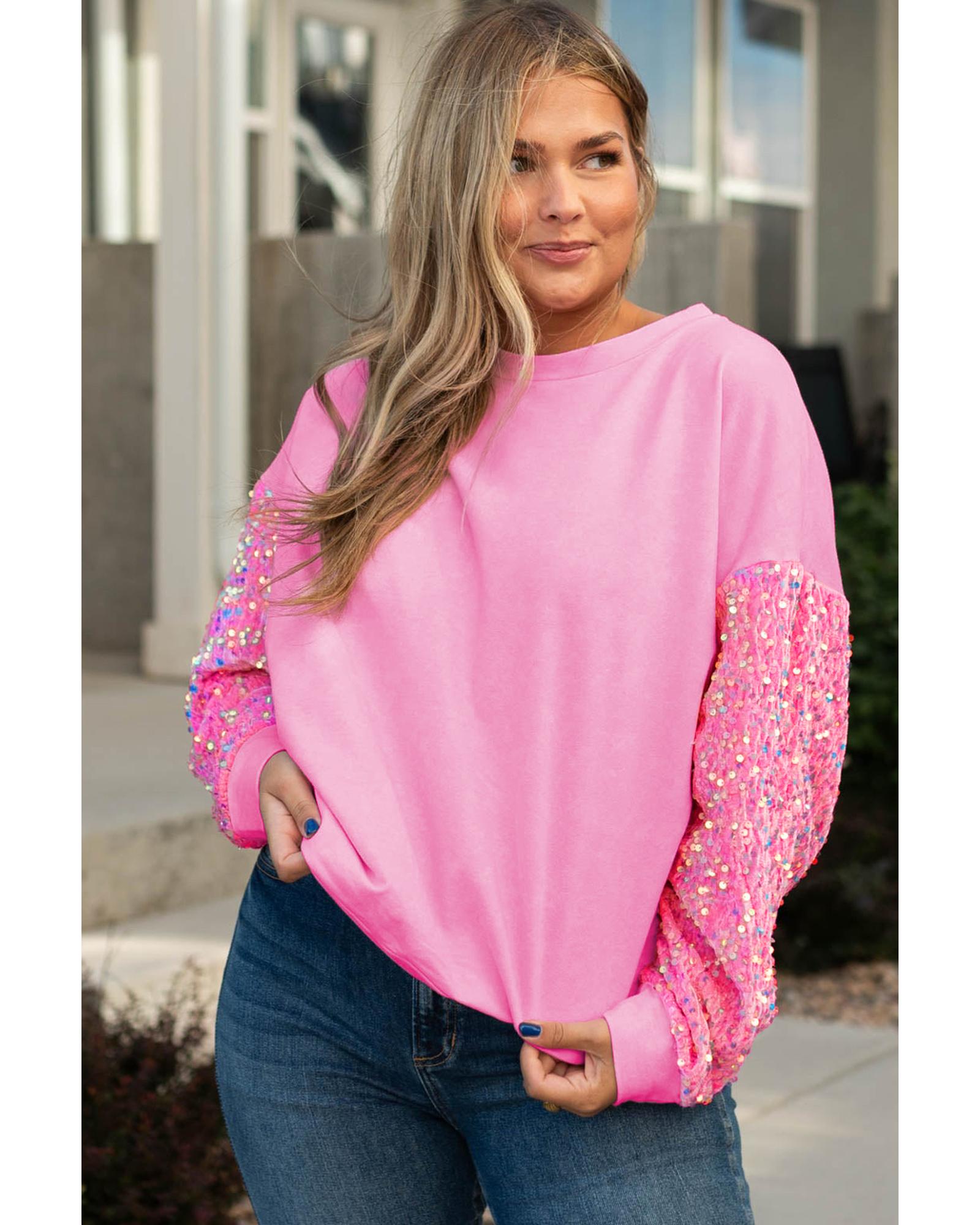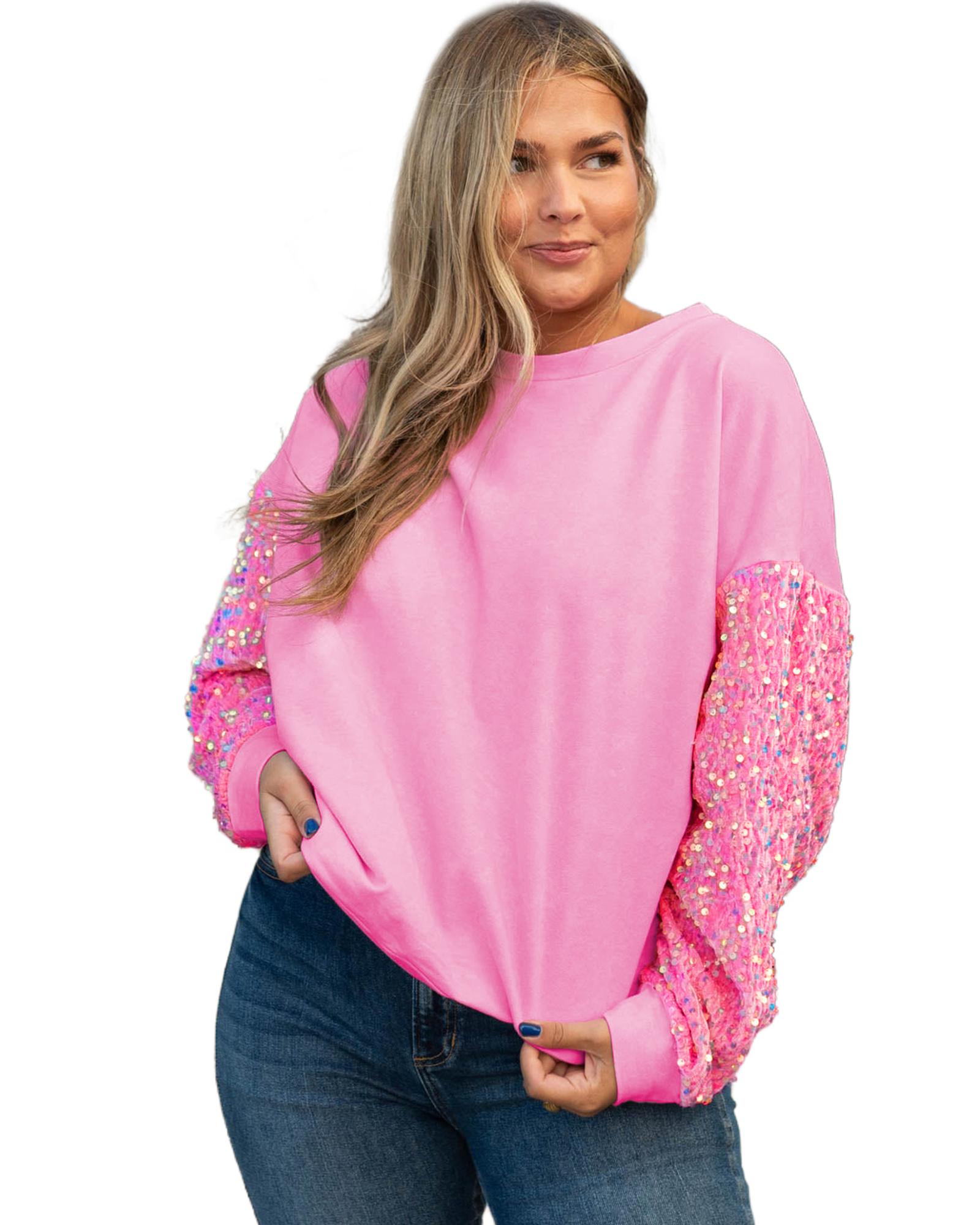 Pink Plus Size Sequin Sleeve Drop Shoulder Sweatshirt – 1X