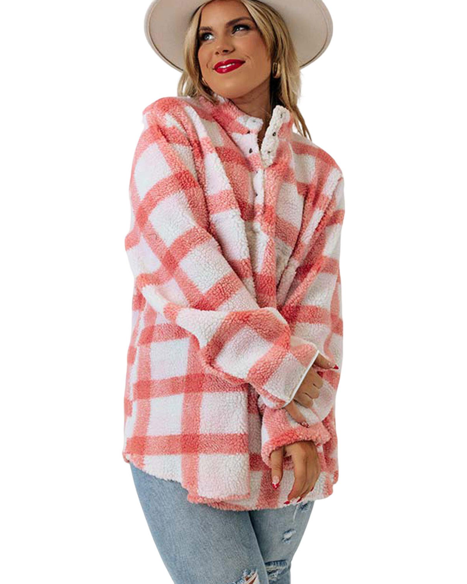 This plus size tunic sweatshirt combines a trendy fitted look with cozy comfort. Featuring a classic plaid pattern and fluffy sherpa fabric, it offers both style and warmth. The Henley neckline with buttons adds a fashionable touch and provides extra protection against cold wind. Perfect for pairing with jeans and boots, this versatile piece is ideal for casual wear in colder weather.