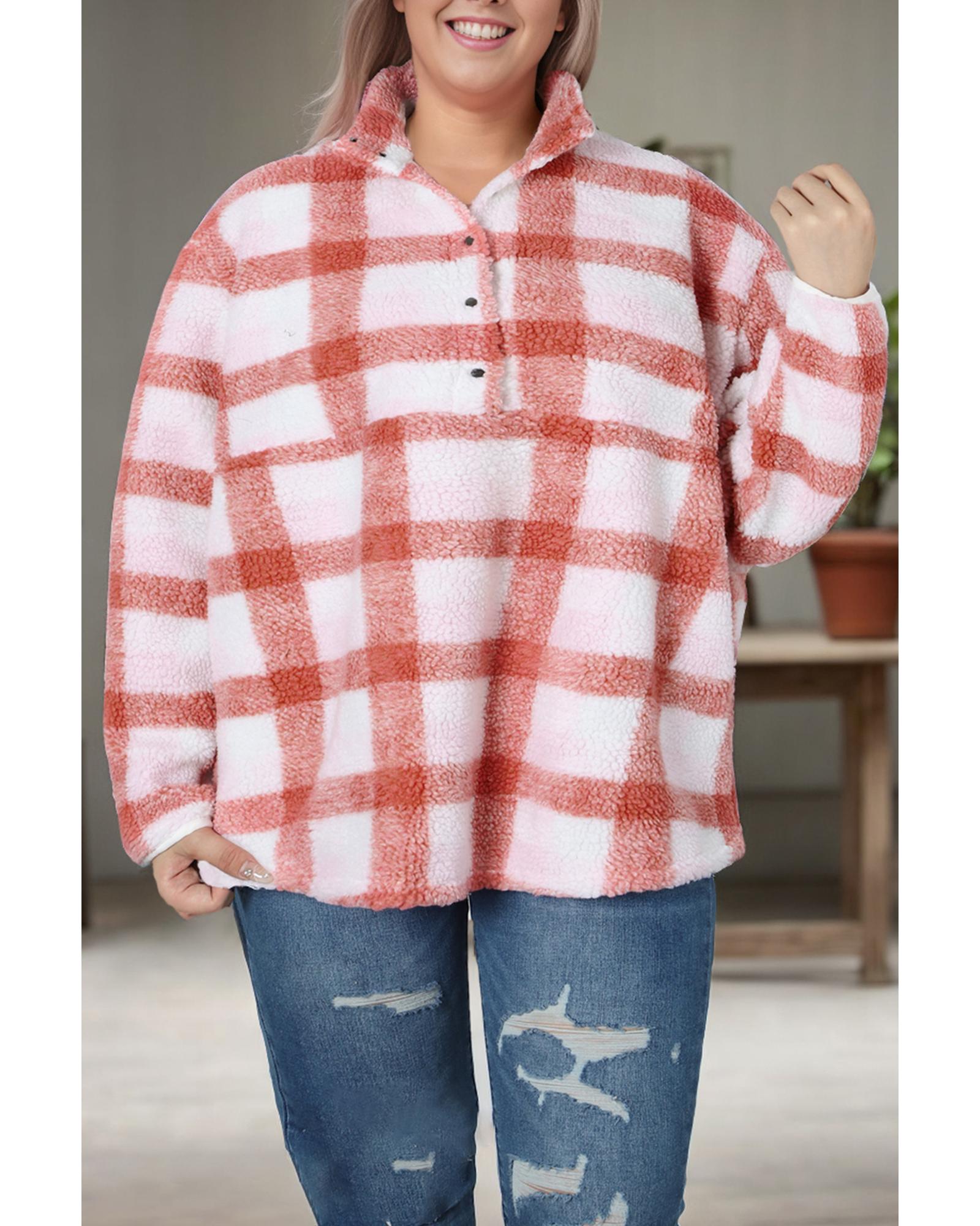Pink Plus Size Tunic Plaid Sherpa Henley Sweatshirt – 3X