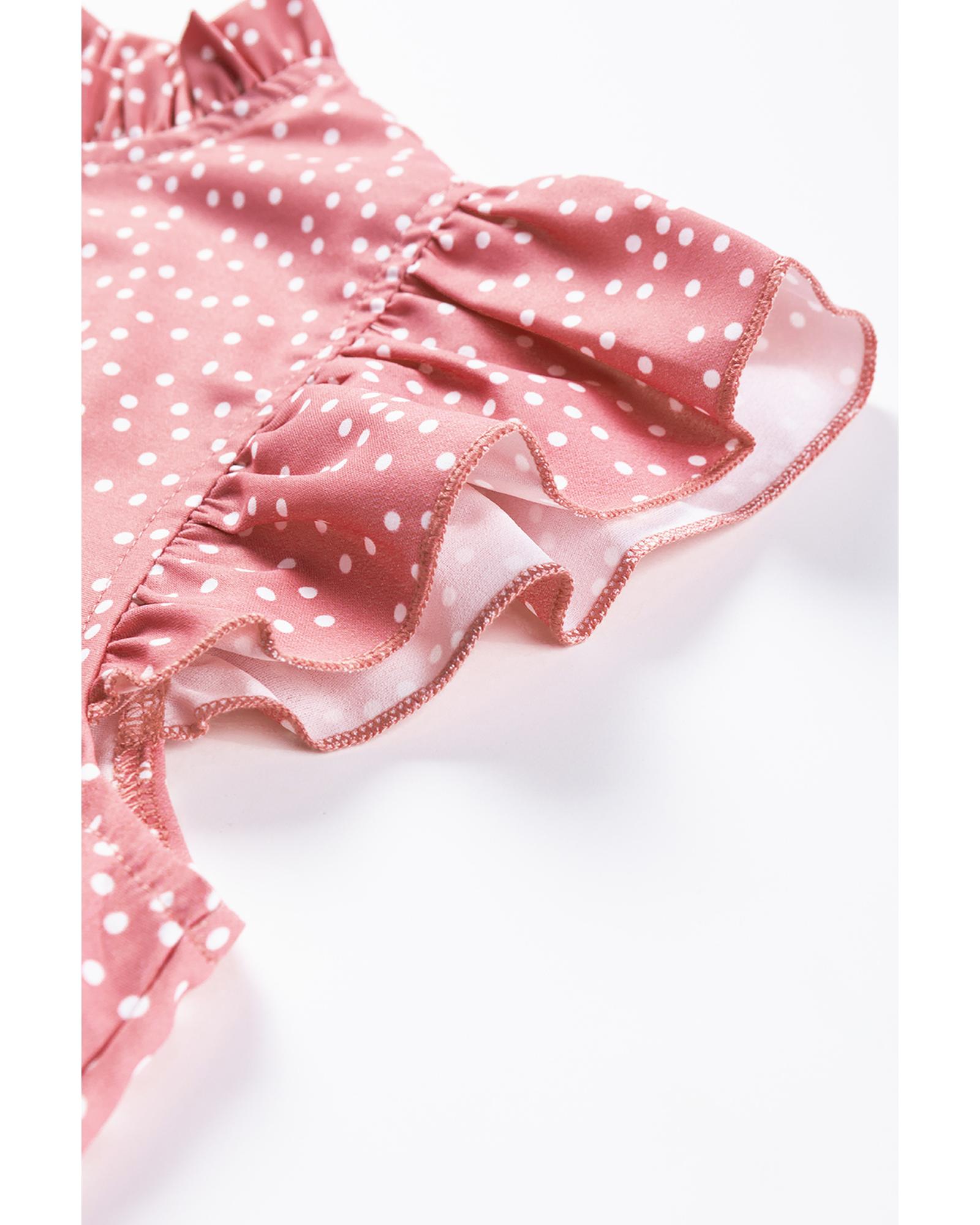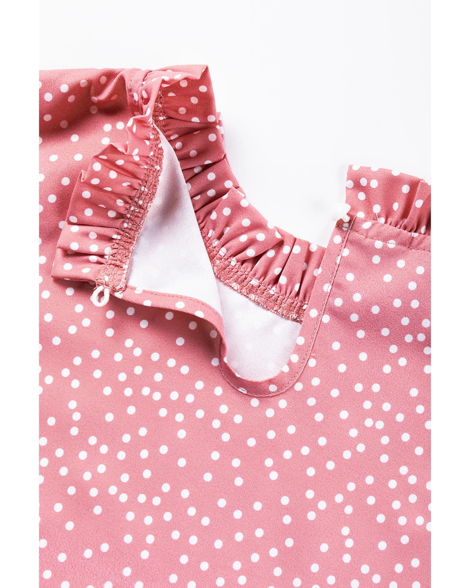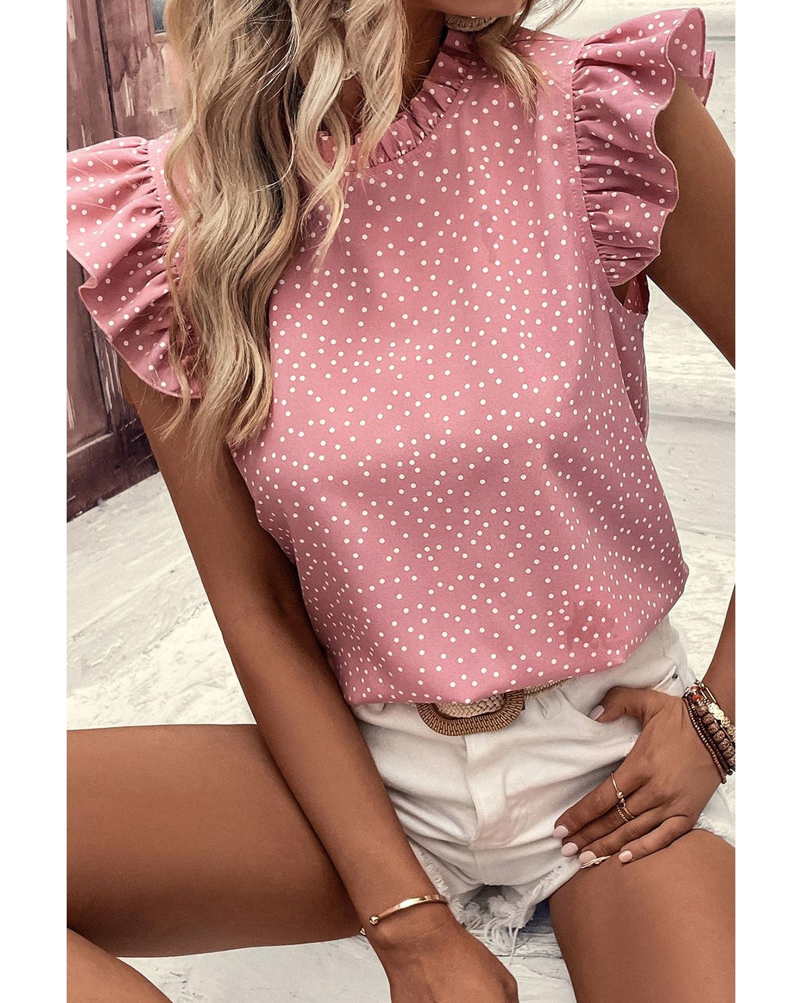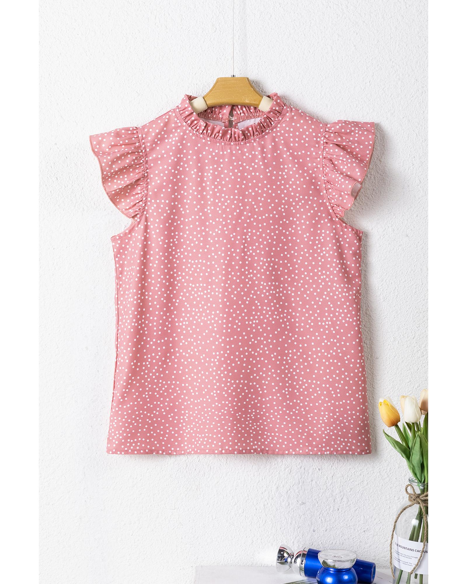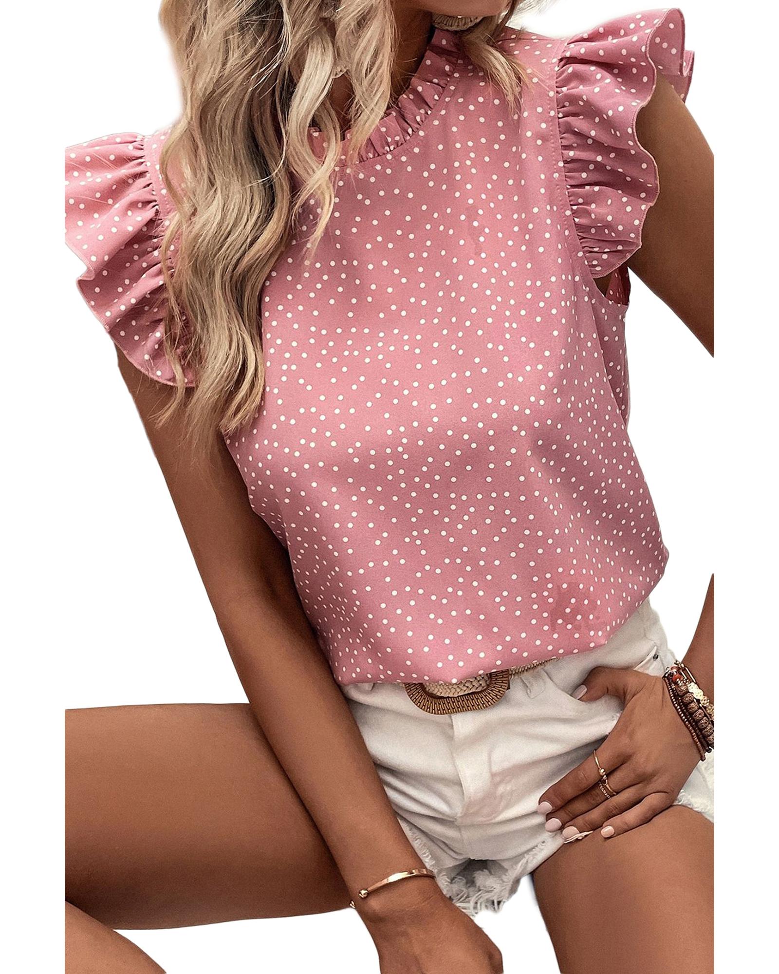 Pink Polka Dots Ruffle Flutter Sleeve Frilled Neck Blouse – L
