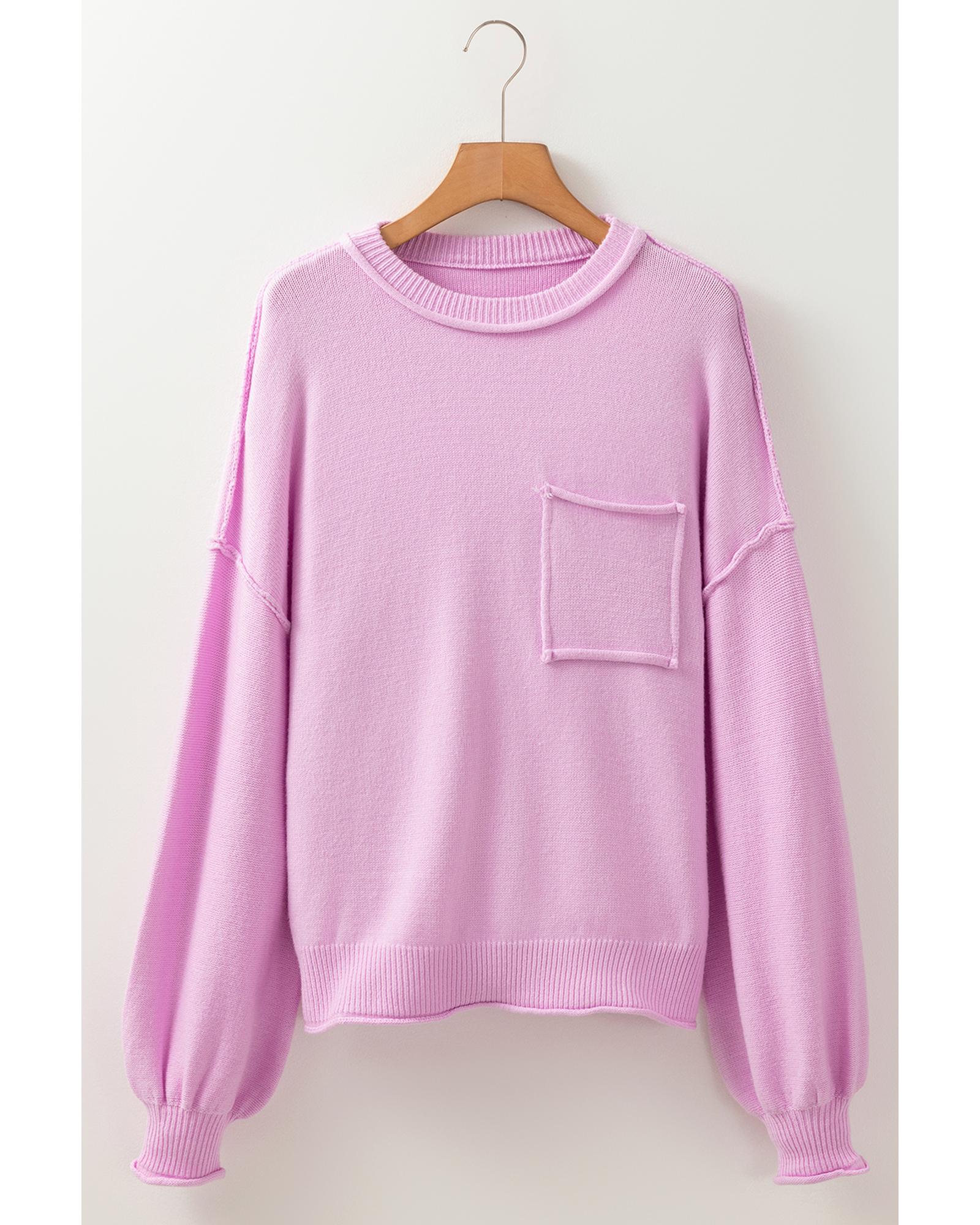 This sweater features a trendy fitted design with a relaxed silhouette, combining comfort and style. It is crafted from soft knit fabric with unique raw edge seams and dropped balloon sleeves, making it a versatile addition to any wardrobe. The mock neck and ribbed cuffs add to its fashionable appeal, while a patched pocket provides a chic detail.