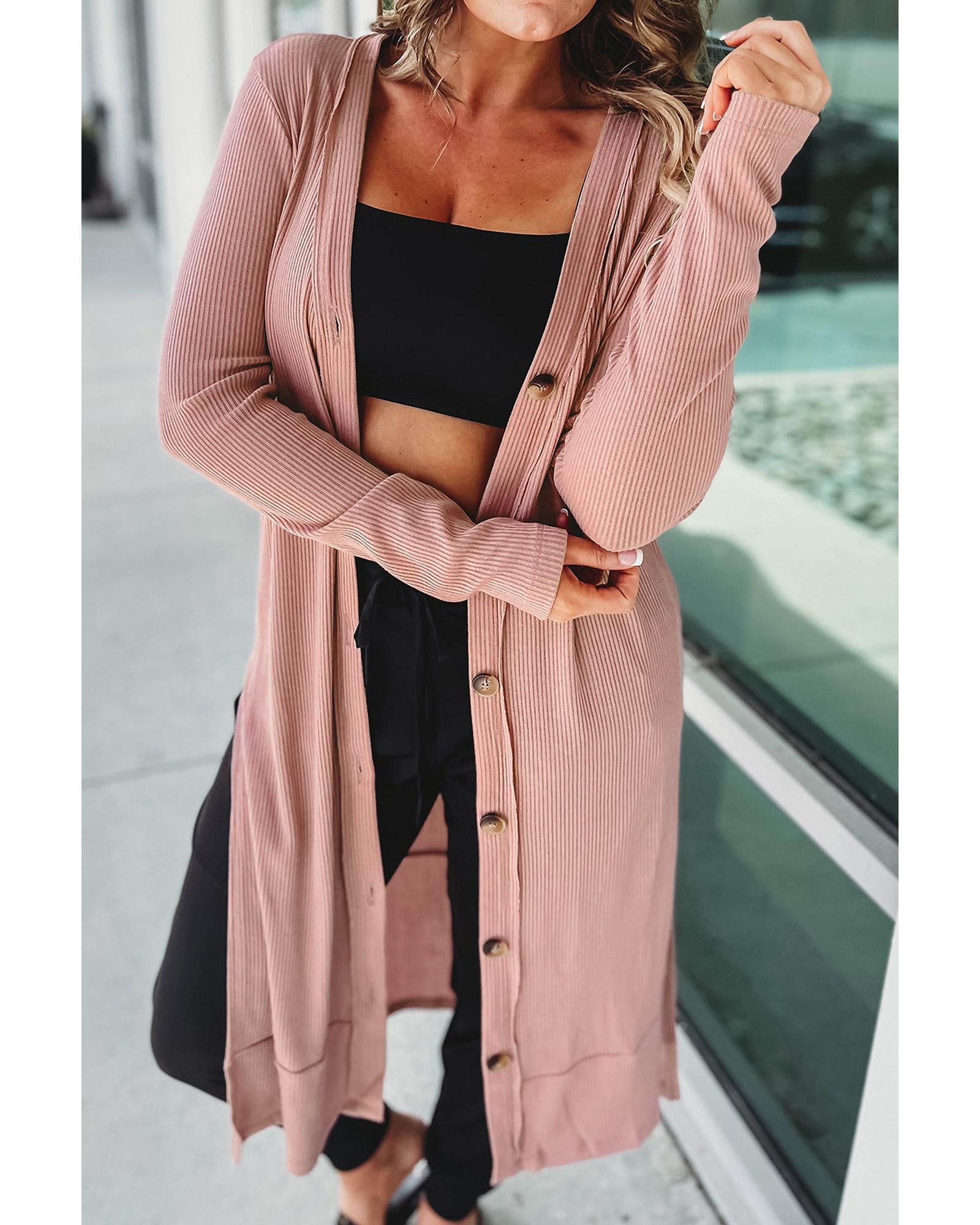 Pink Ribbed Button-Up Split Duster Cardigan – XL