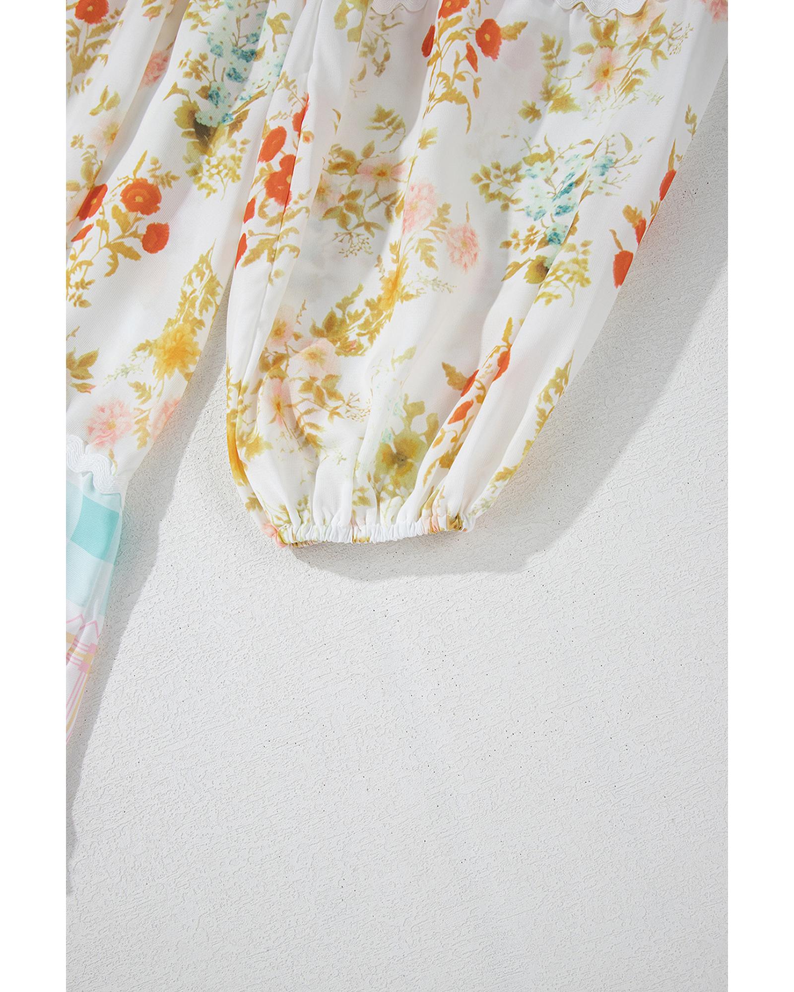 Pink Ric Rac Plaid Floral Print Patchwork Bubble Sleeve Dress – XL
