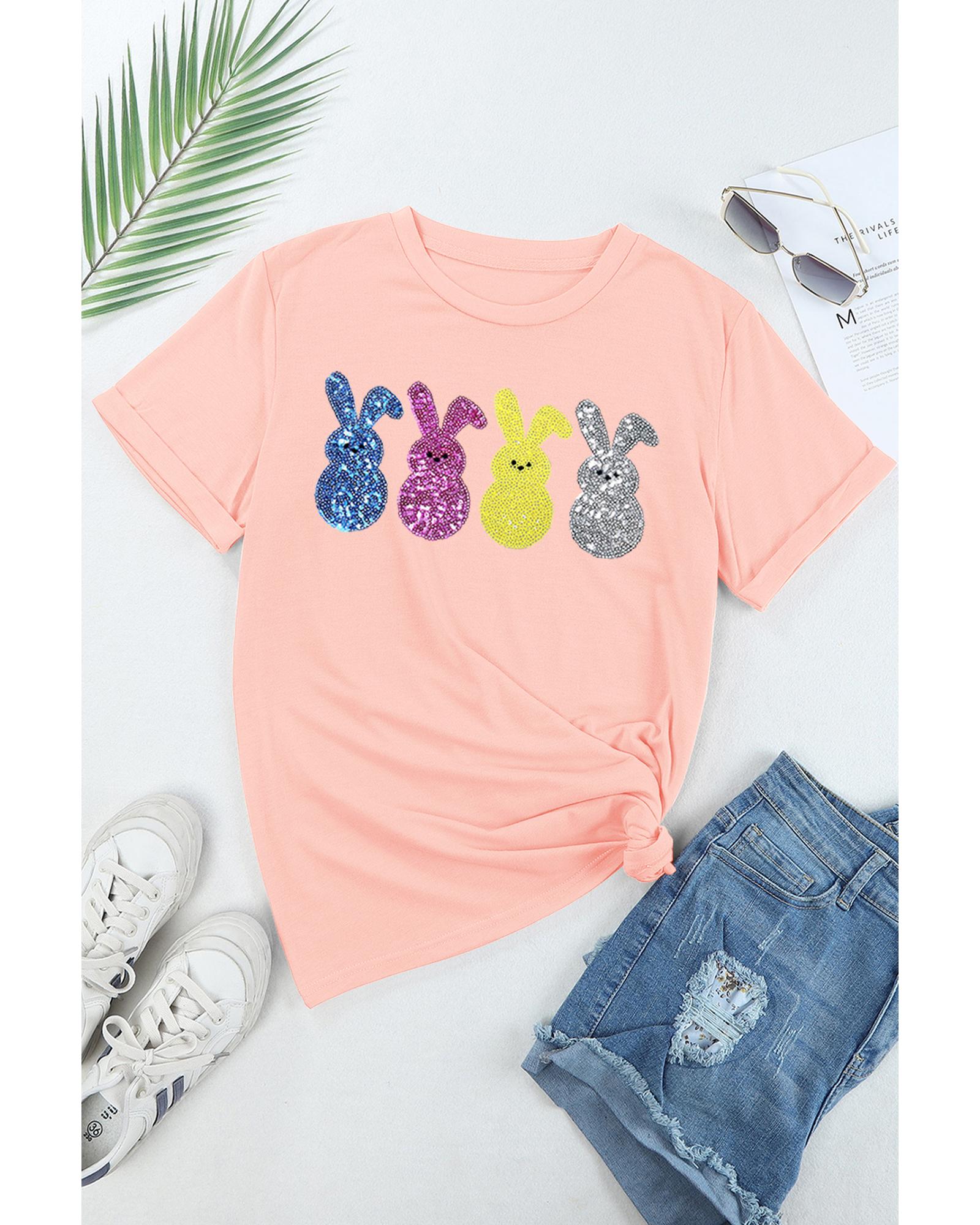 Pink Sequin Cute Bunny Graphic Easter Fashion Tee – 2XL
