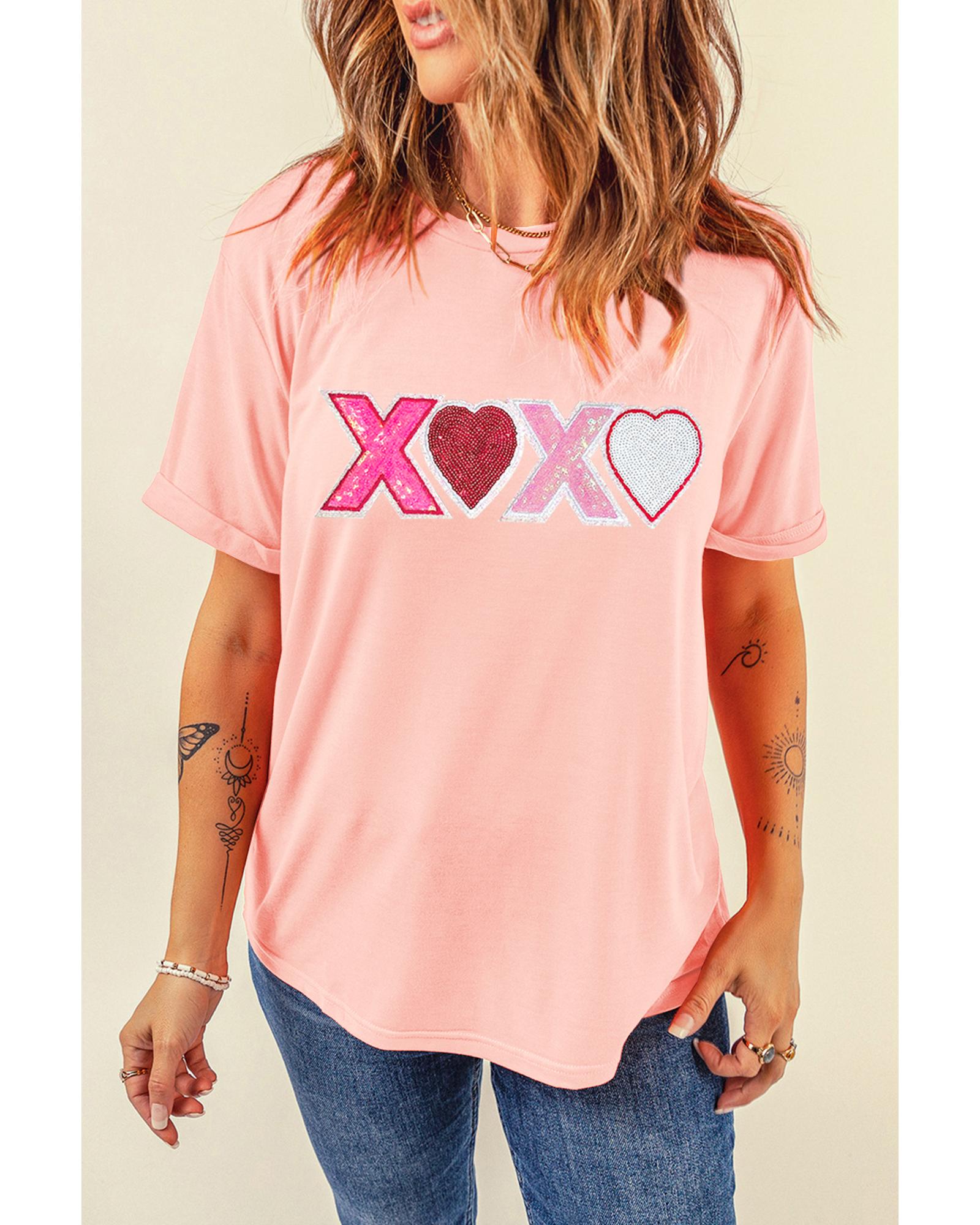 Pink Sequin Heart XOXO Patched Graphic Valentines T Shirt – L